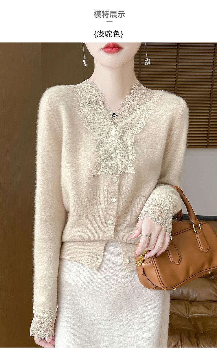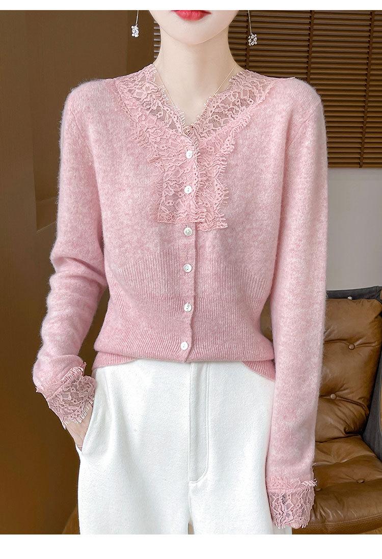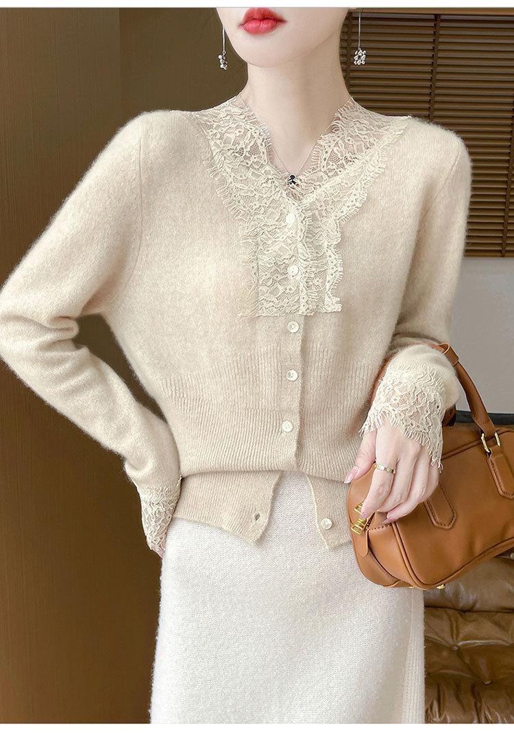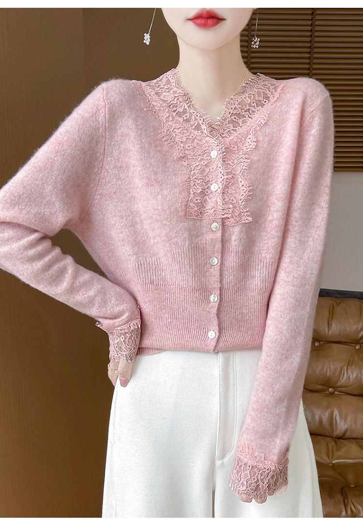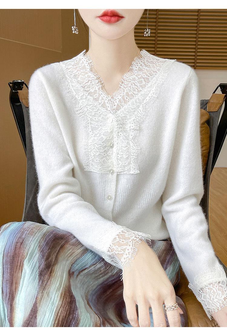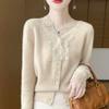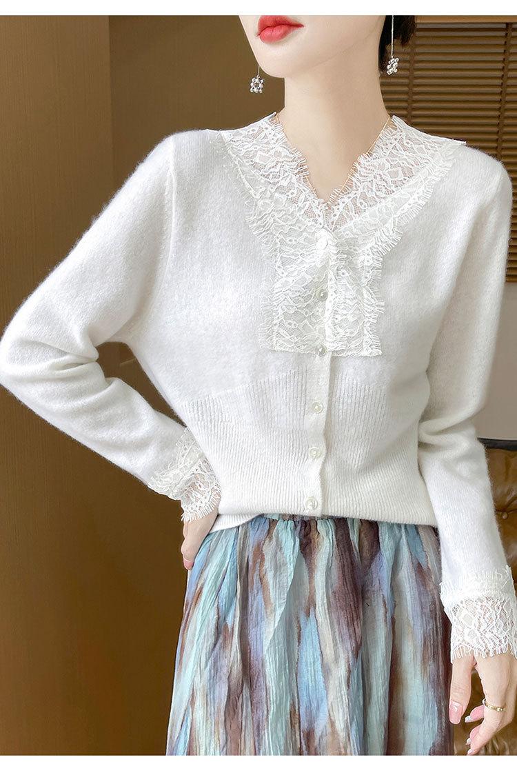 Cárdigan de Cachemira Pura 100 con Encaje de Cuello en V Calado Otoño e Invierno Suéter de Manga Larga Suelto Suéter de Lana Chaqueta Tejida Trendy