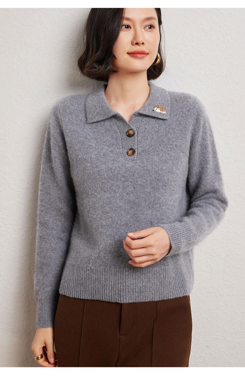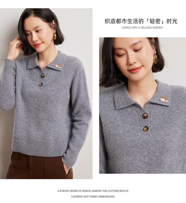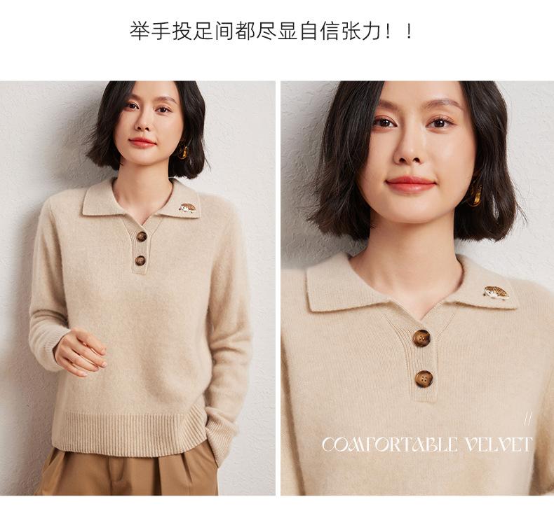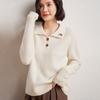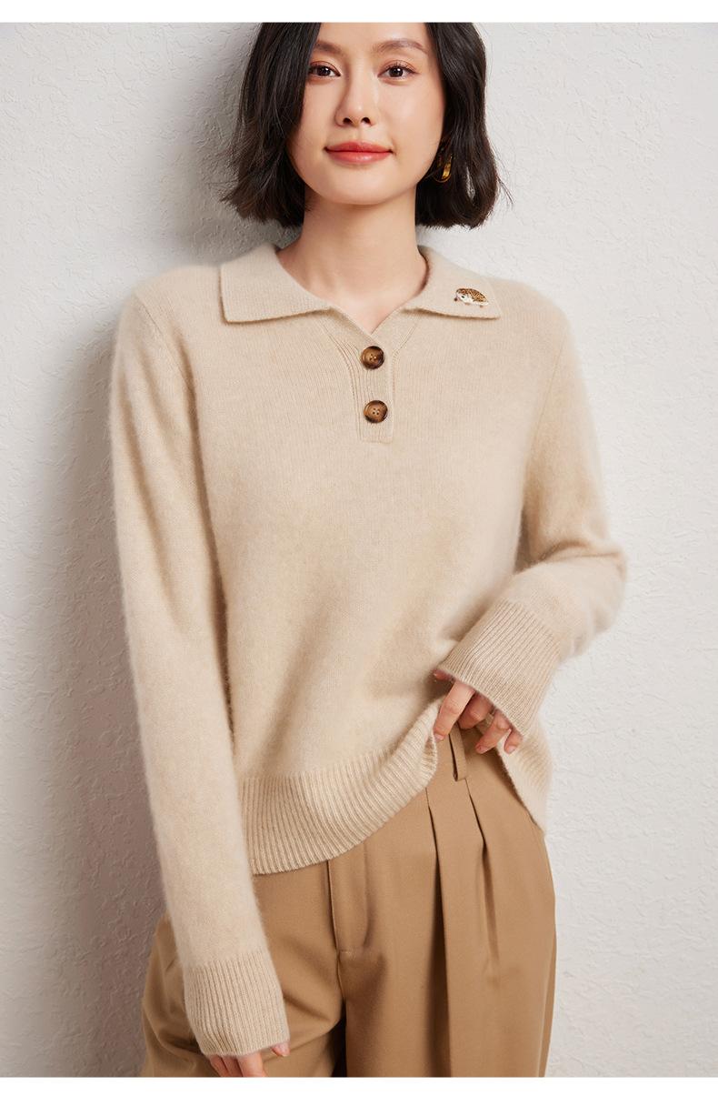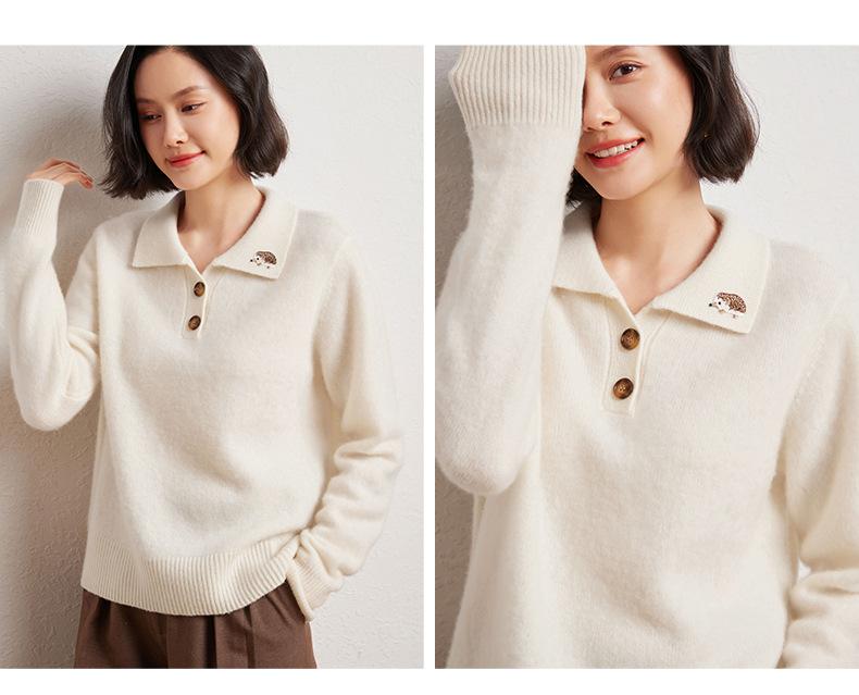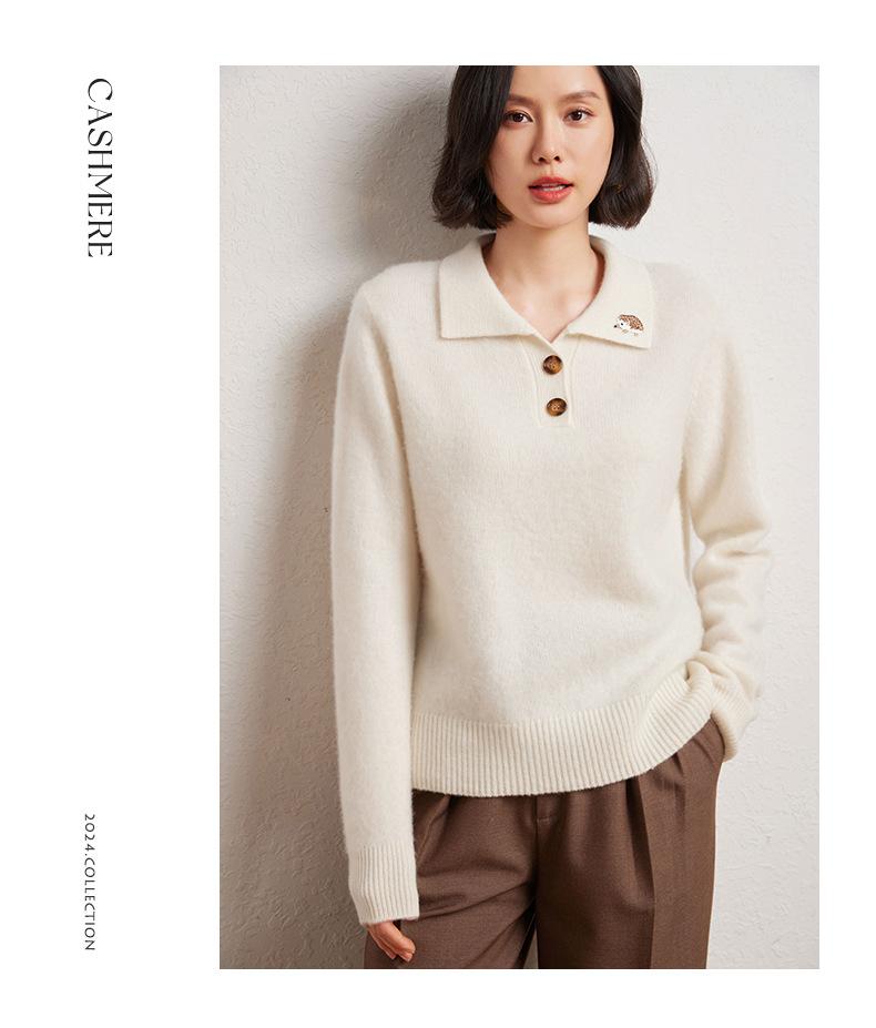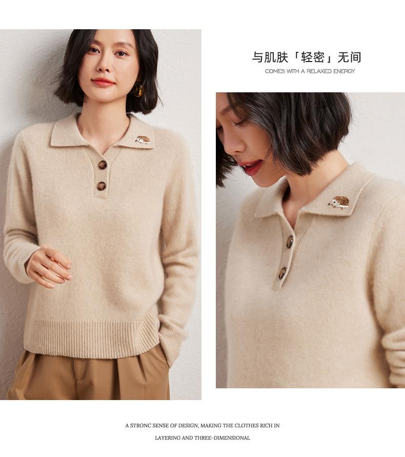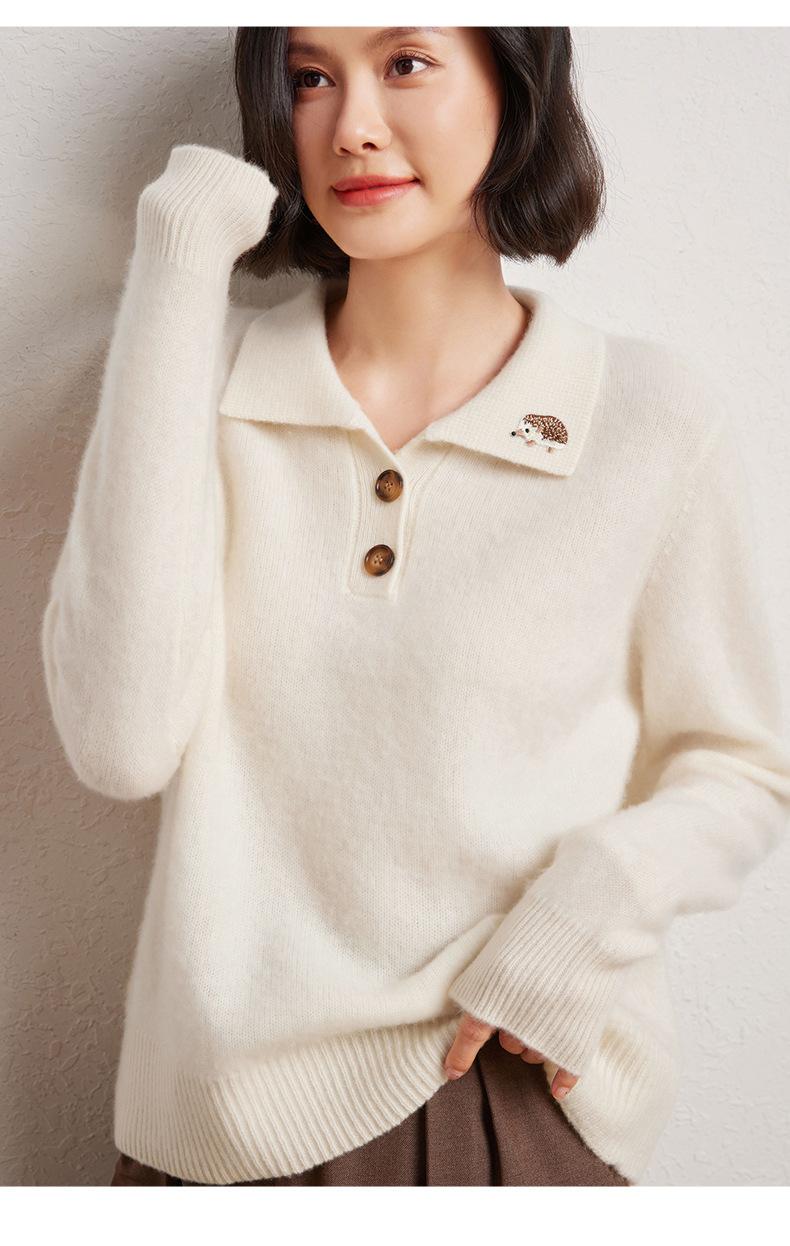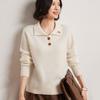 Suéter de otoño e invierno para mujer, jersey de cuello tipo polo, jersey de punto suelto de cachemira sin costuras con bordado de manga larga y dos hebillas.