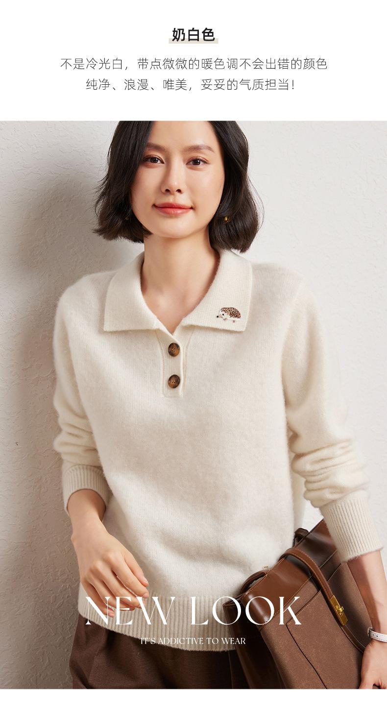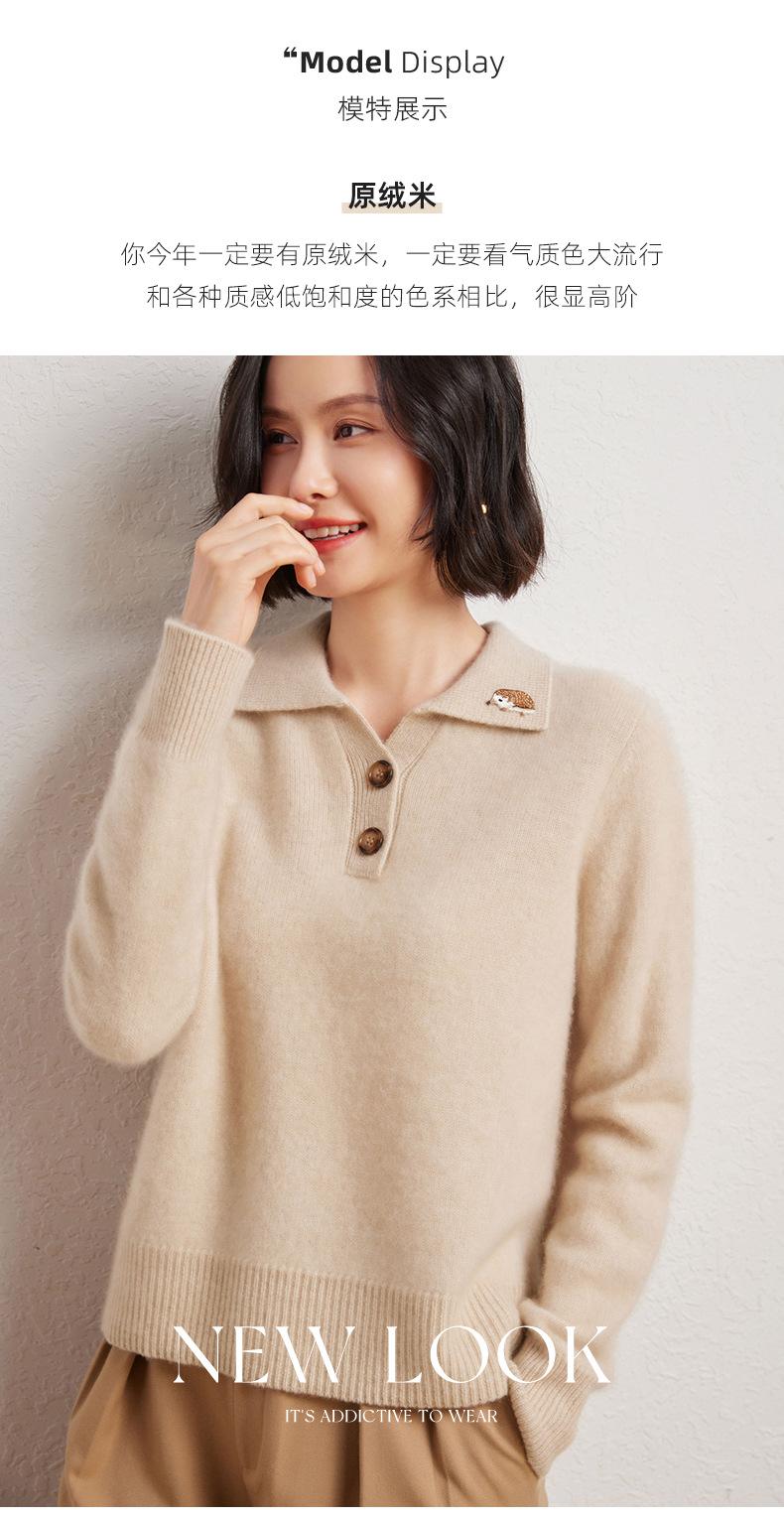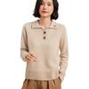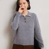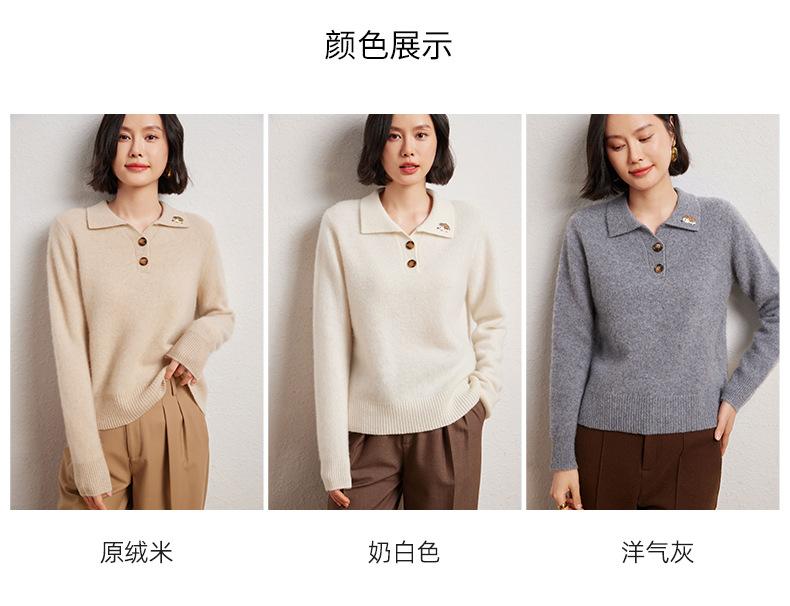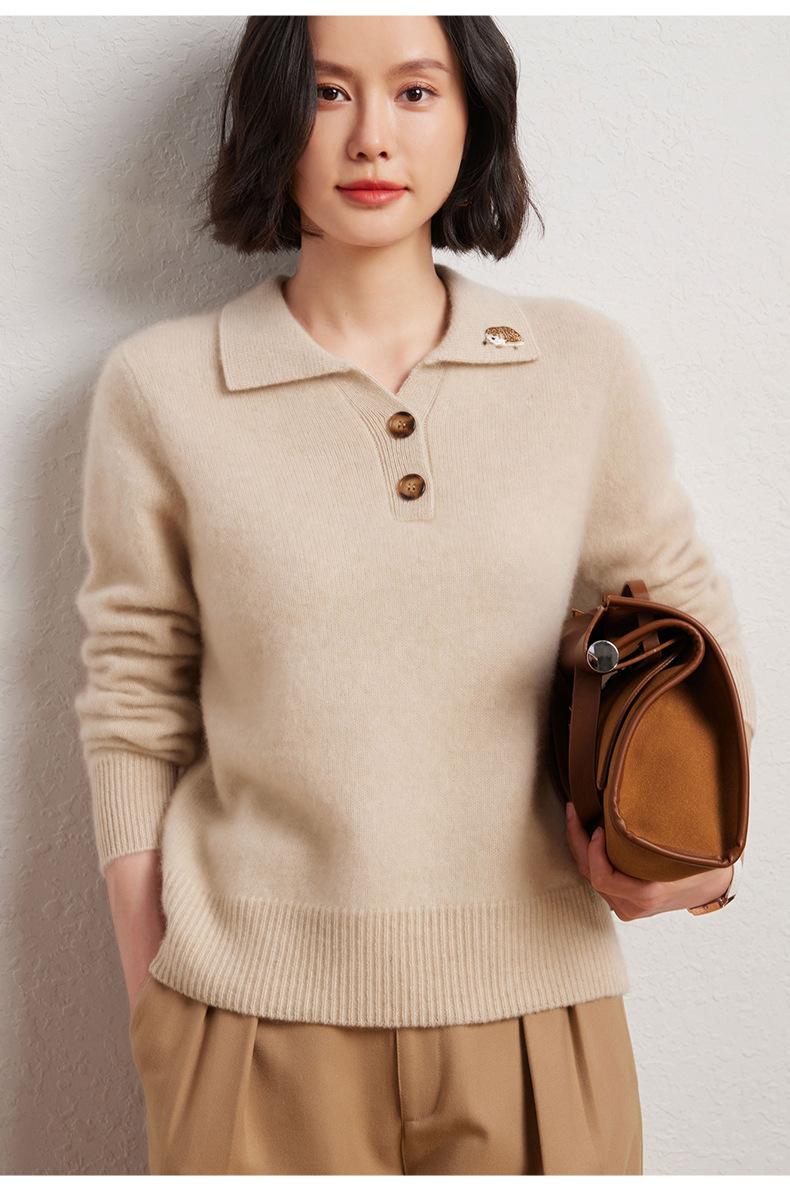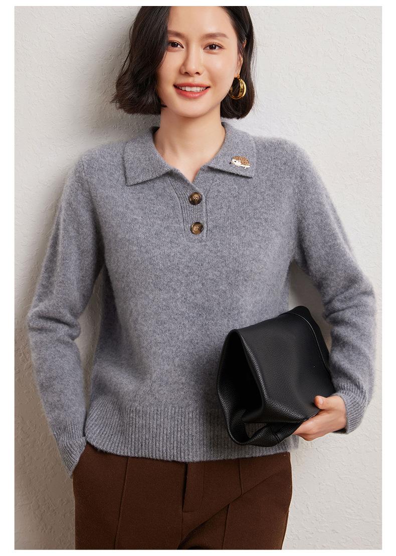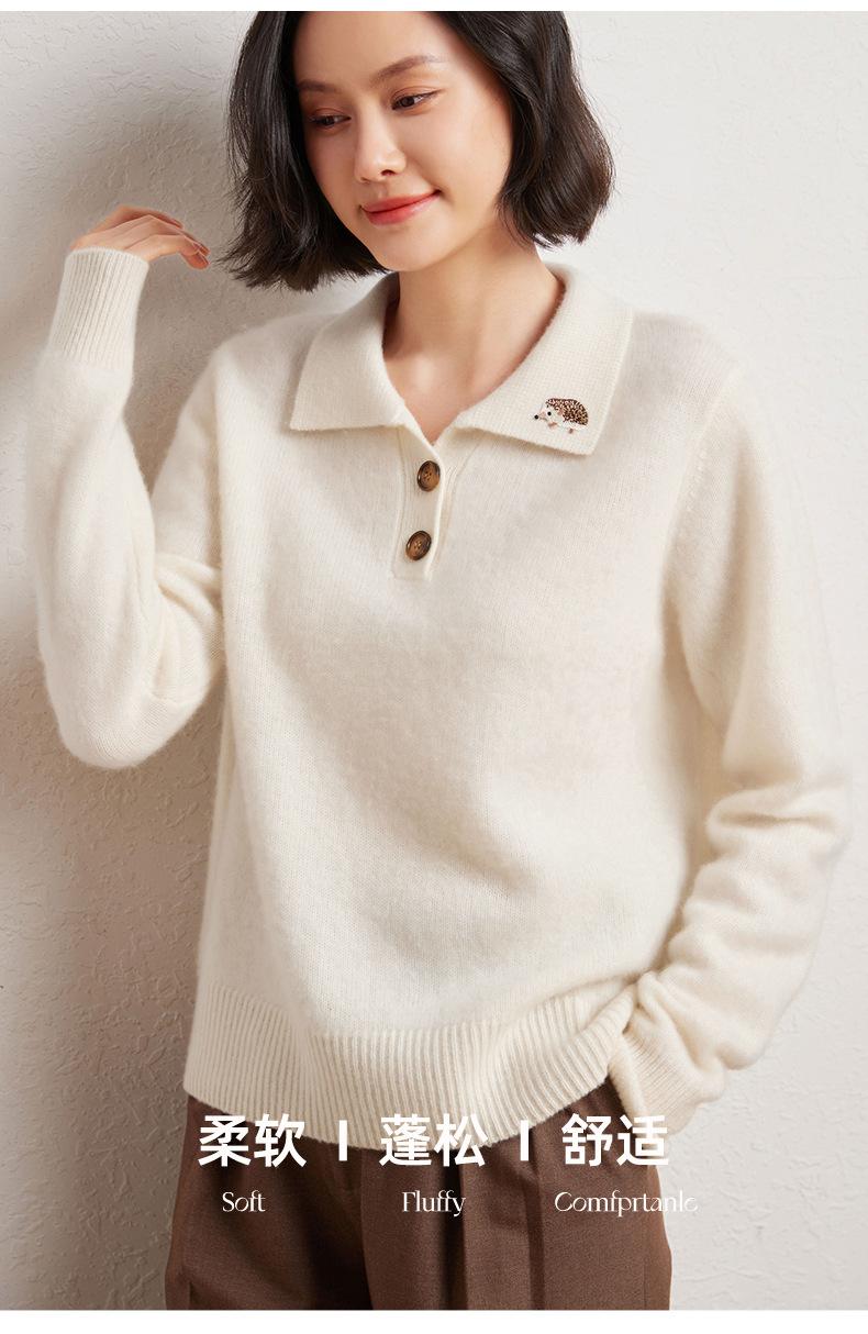 Suéter de otoño e invierno para mujer, jersey de cuello tipo polo, jersey de punto suelto de cachemira sin costuras con bordado de manga larga y dos hebillas.