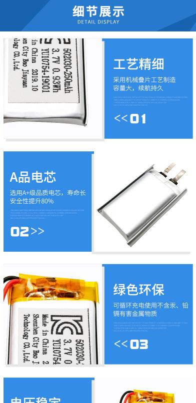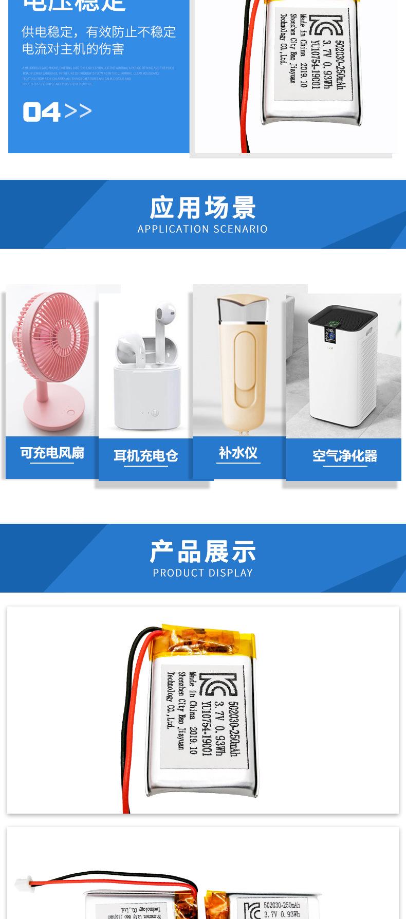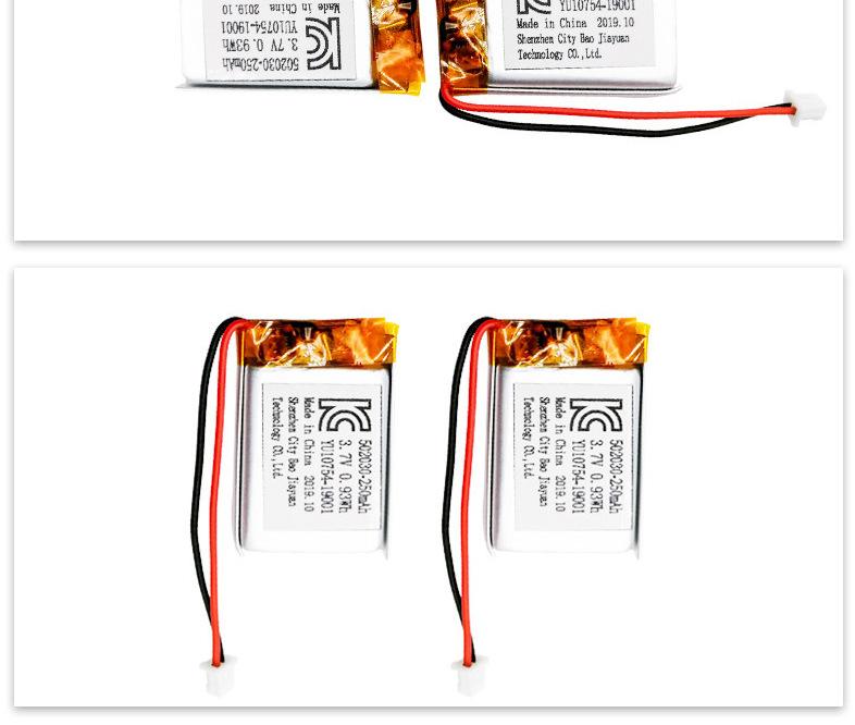 Batería de Polímero de Litio 502030-250 mAh 3.7V Certificada KC Luz de Camping Medidor de Hidratación Ventilador Recargable