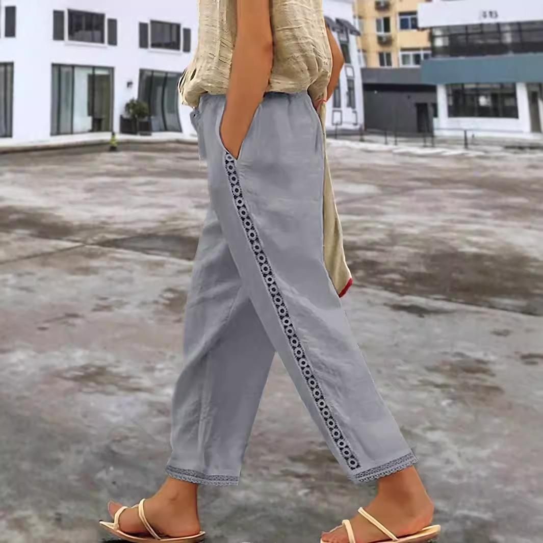 Pantalones de algodón y lino europeos y americanos 2024 para mujer, pantalones de verano de nueve puntos holgados anti-algodón y lino con cintura elástica, pantalones anchos de encaje acanalados en la pierna45 yuanesComprar ahora>