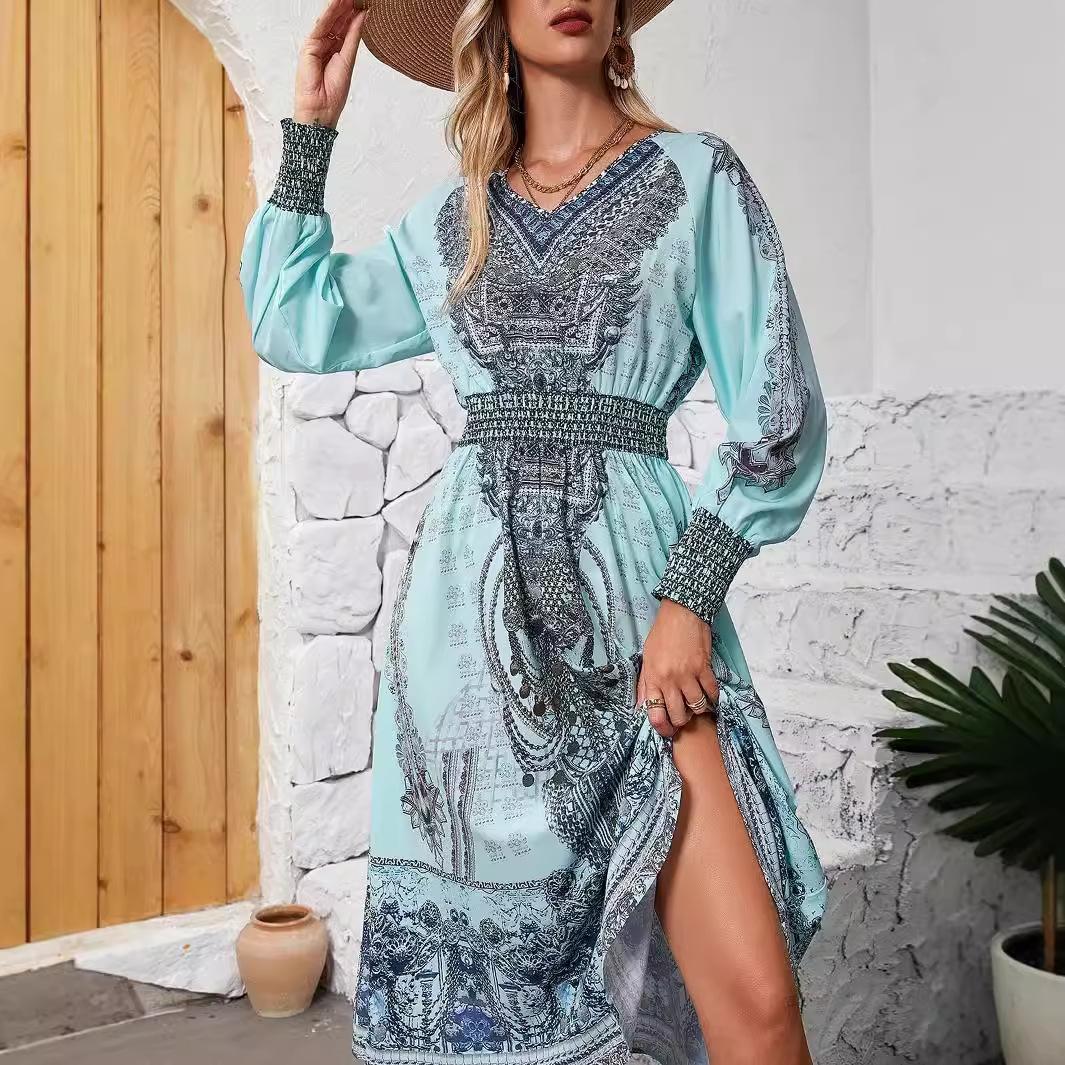 Comercio exterior transfronterizo otoño nuevo vestido de verano de manga larga francés floral textura de alta gama estilo étnico falda larga40RMBComprar ahora>