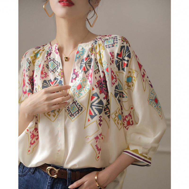---Productos TOP de mayor ventaTops de estilo nacional para verano de mujer, moda nicho, mangas tres cuartos, talla grande, estampado holgado, camisa retro de imitación seda