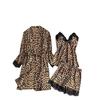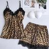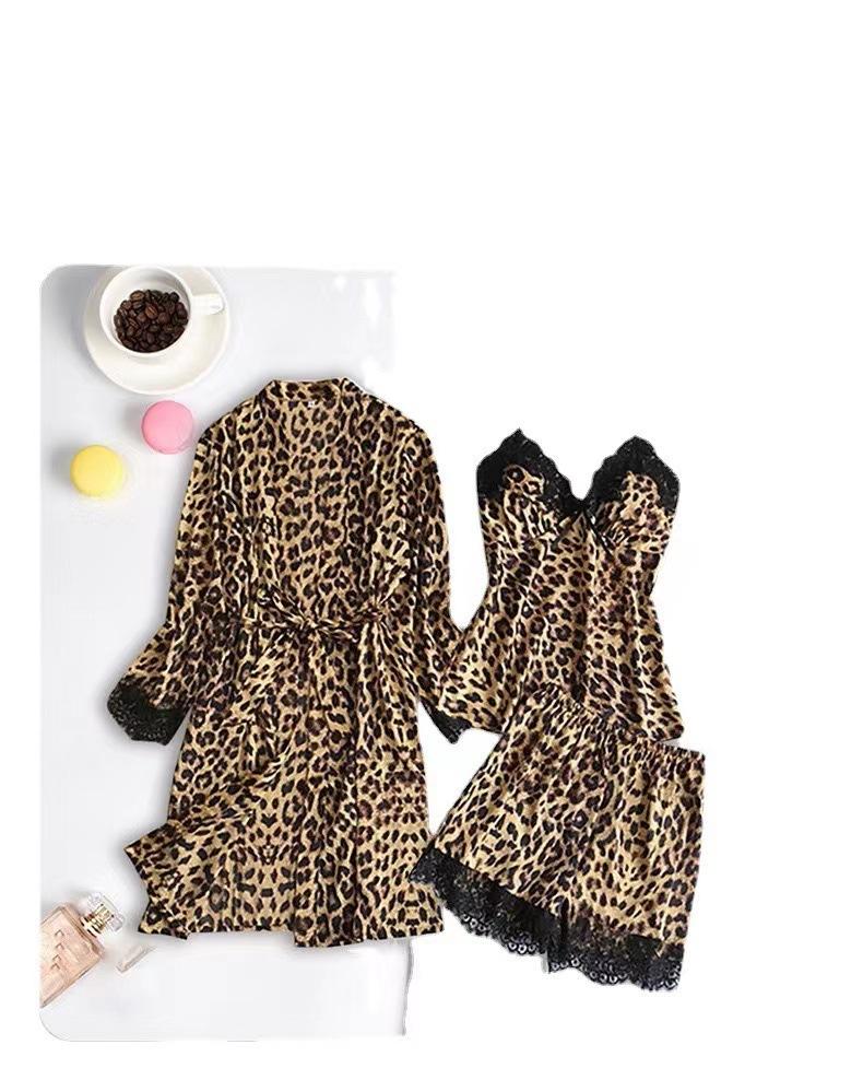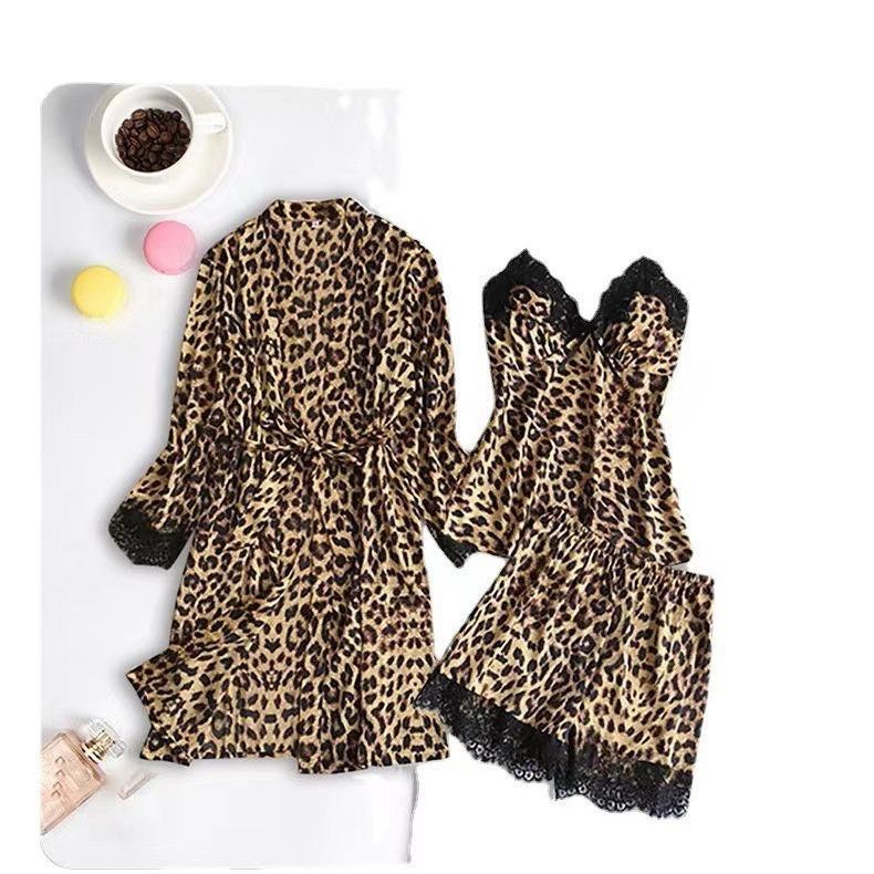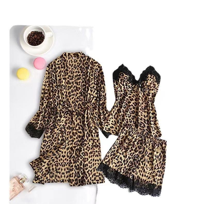 Conjunto de Pijama Corto de Encaje Floral Moderno y Cómodo al por Mayor Europeo y Americano Imitación Seda Estampado Leopardo Ropa para el Hogar Conjunto de Tres Piezas Estilo Perezoso