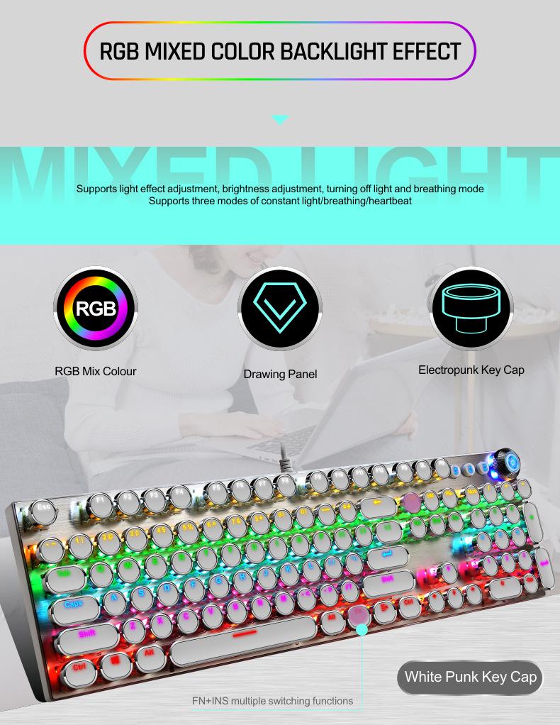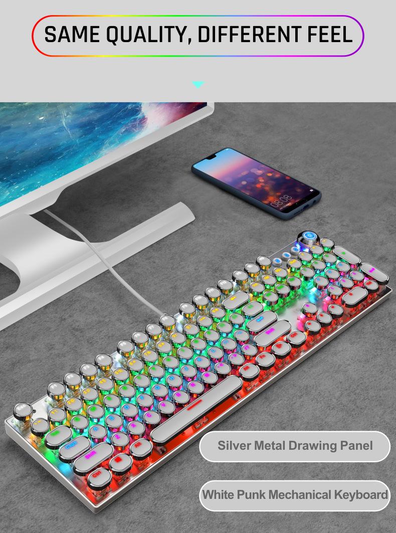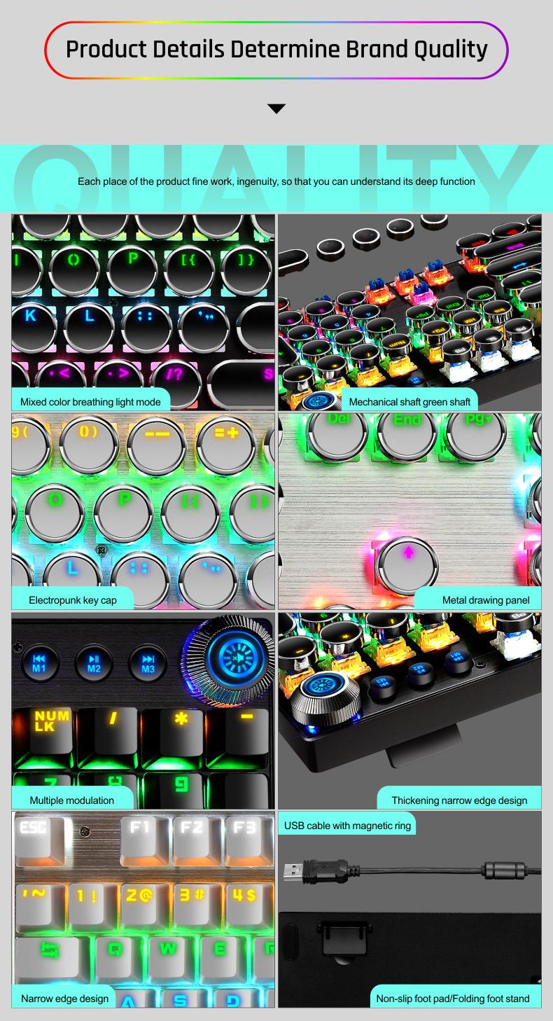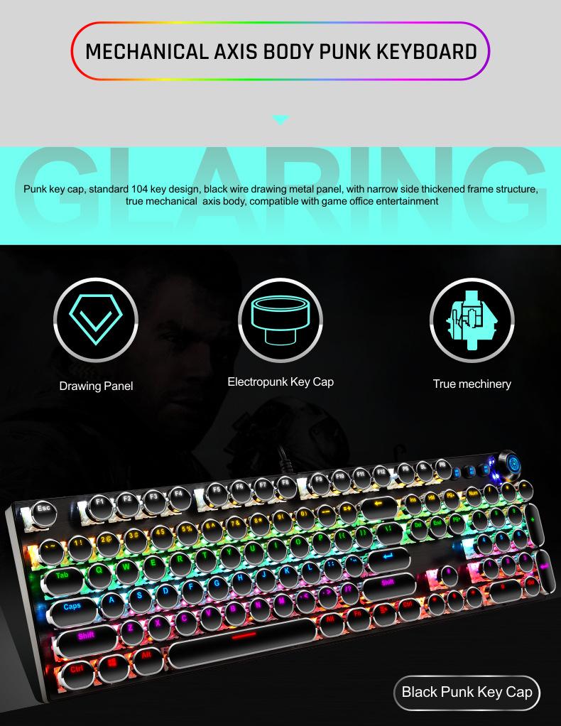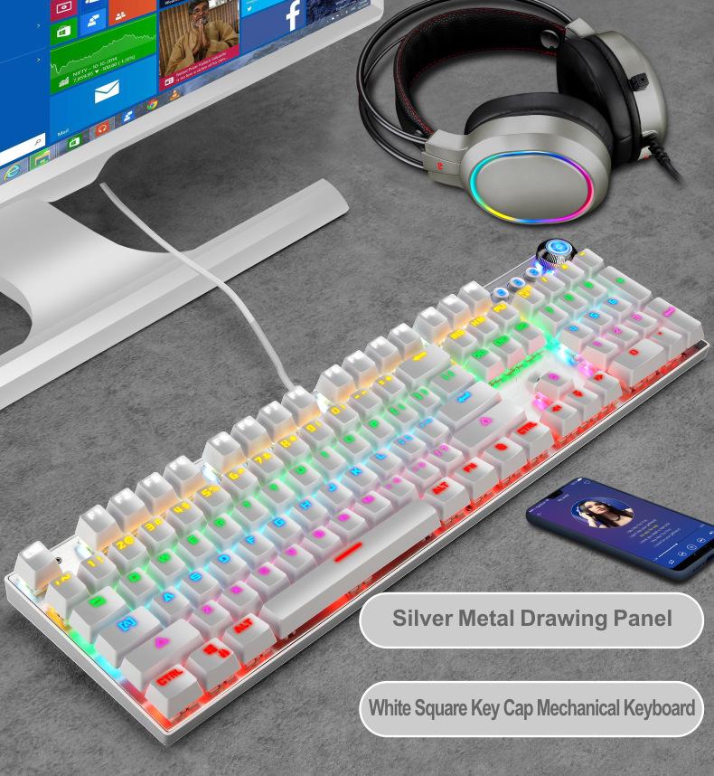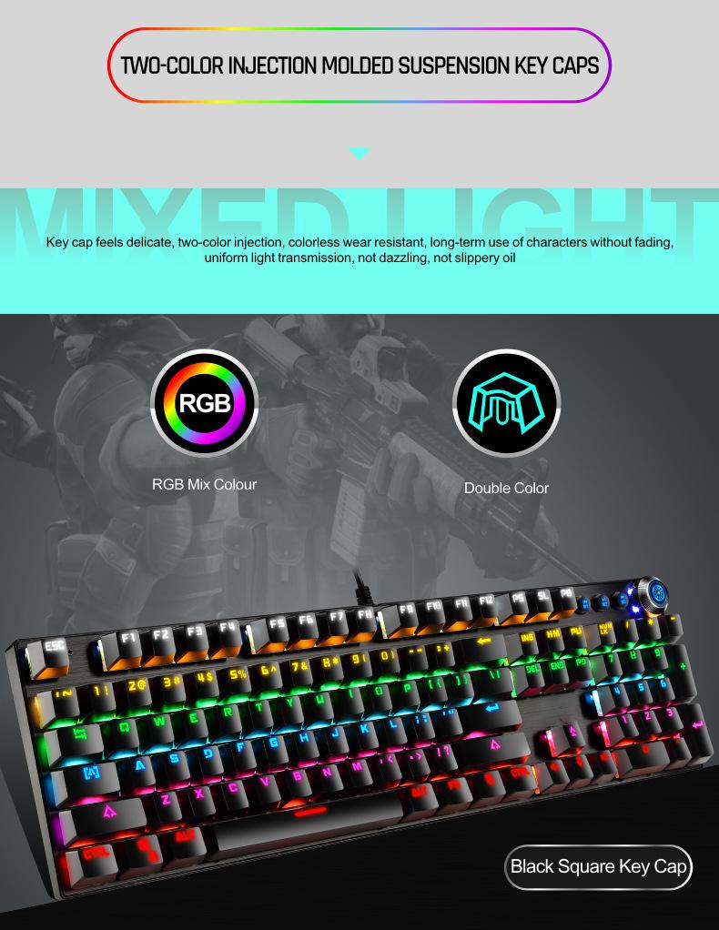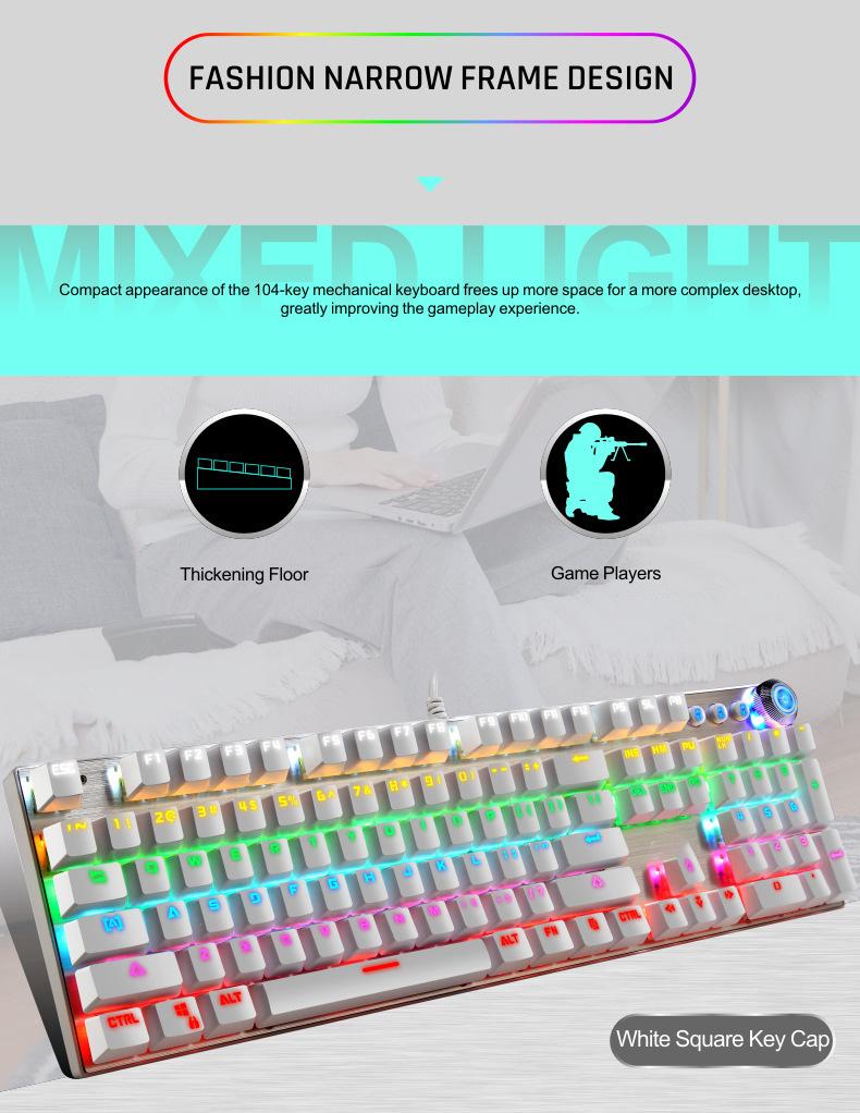 Teclado mecánico de 104 teclas con eje verde, personalizado al por mayor, para juegos de deportes electrónicos de oficina, con cable USB.