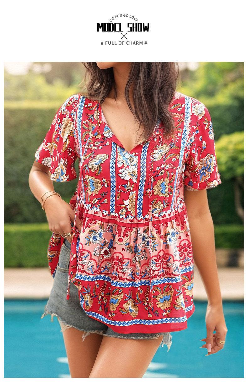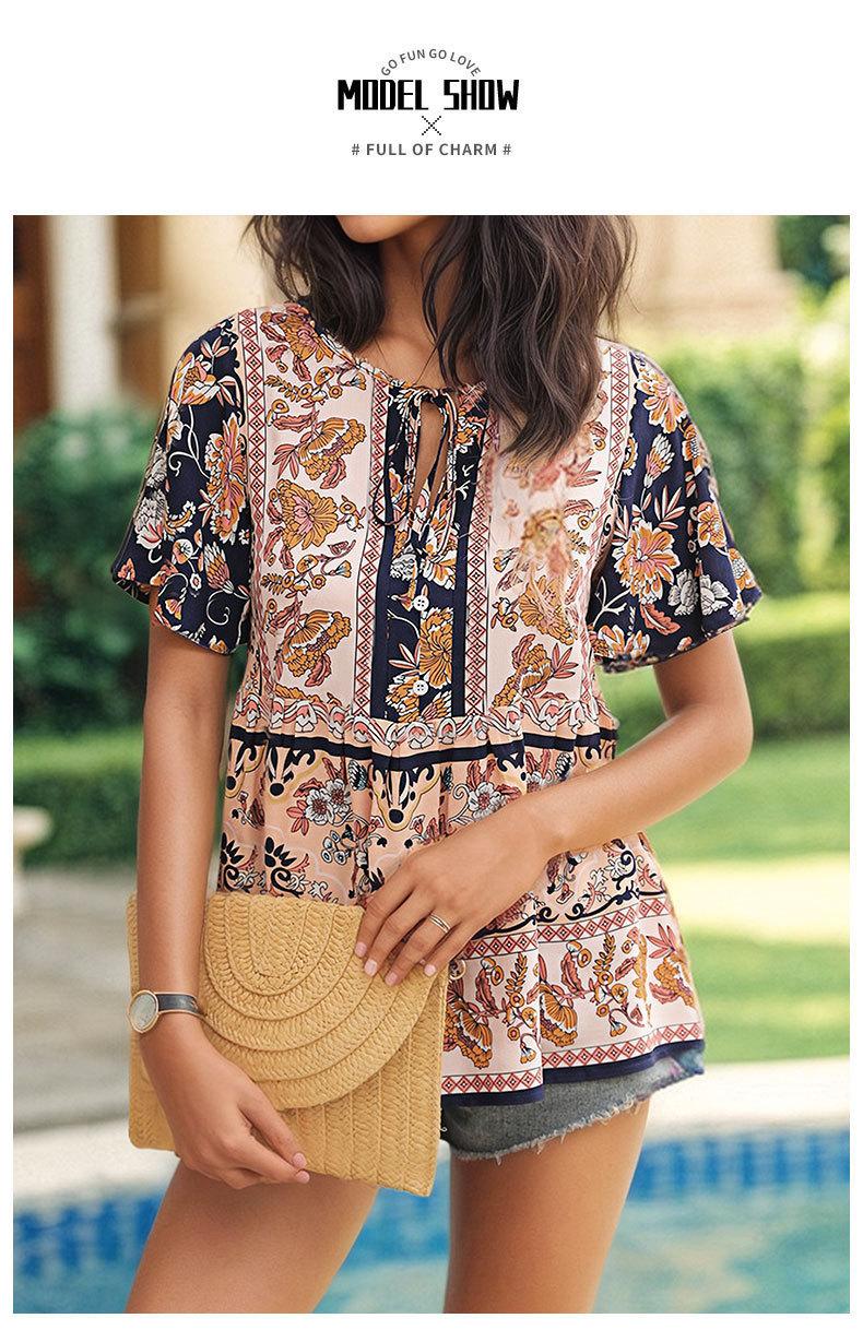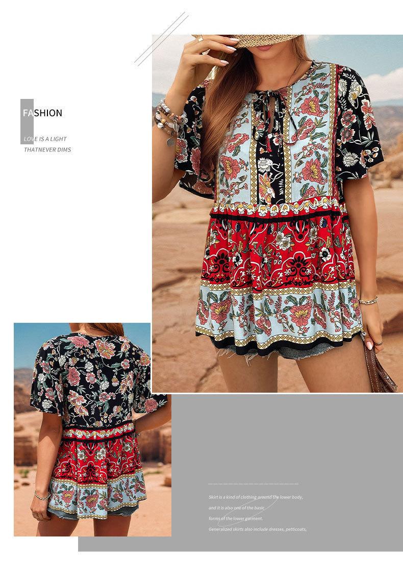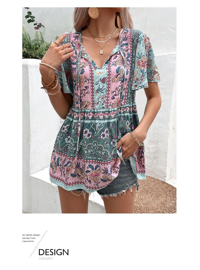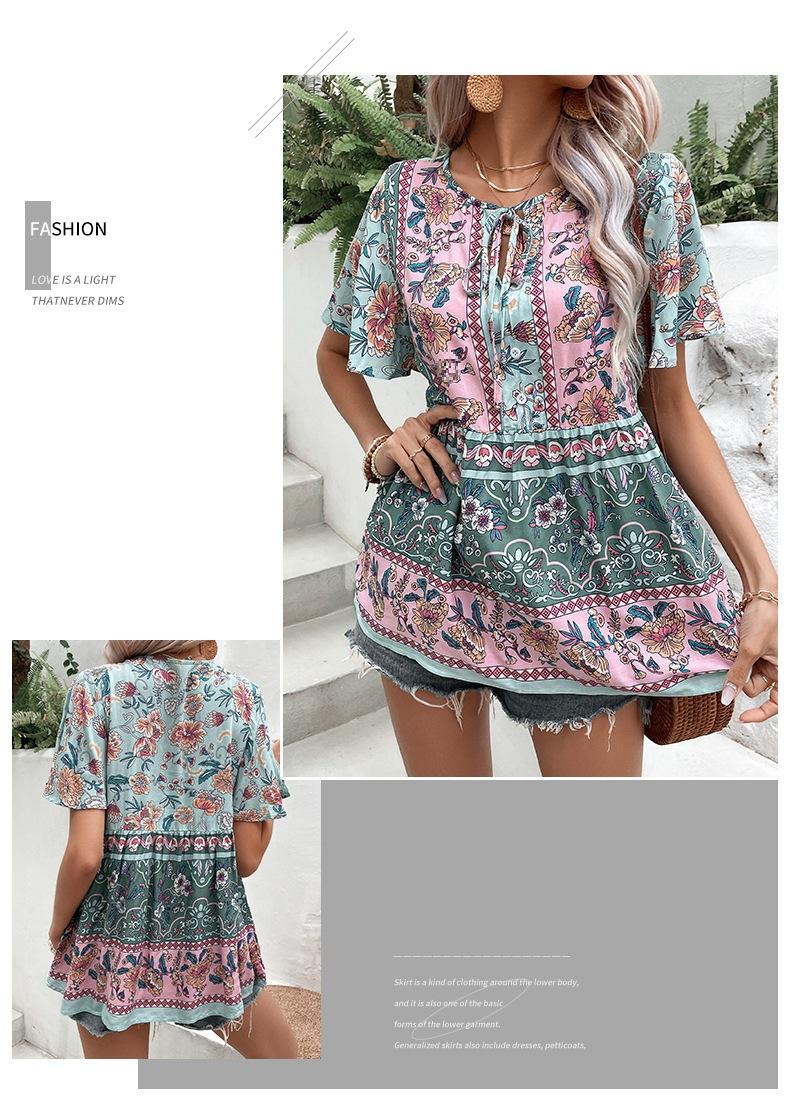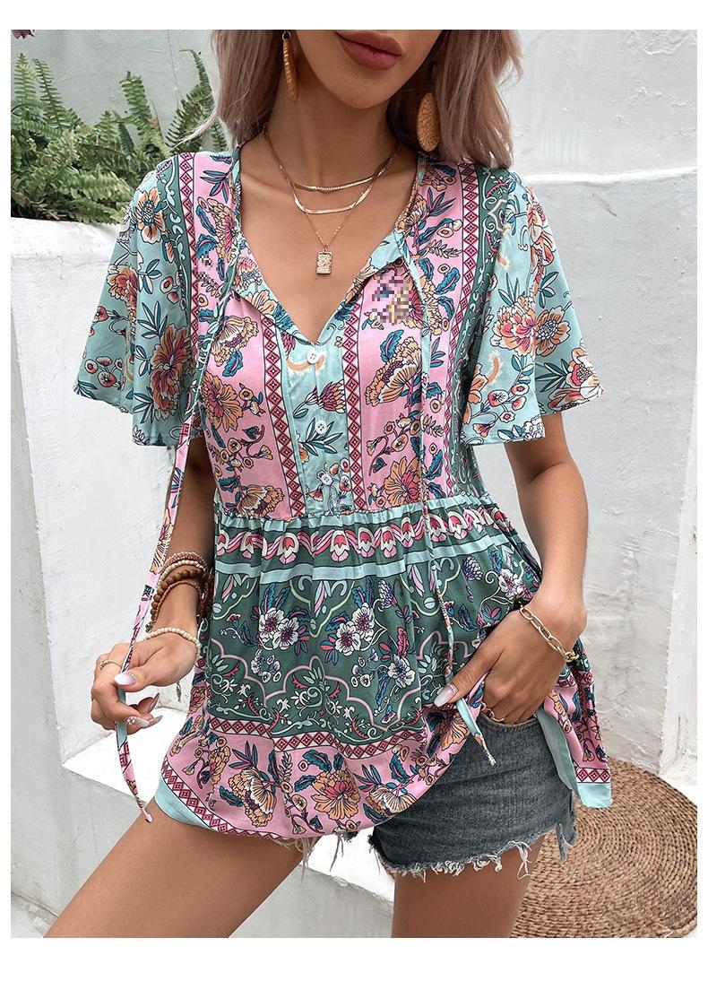 Talla grande transfronteriza 2024 Verano Nuevo Ropa de Mujer Europeo y Americano Casual Vacaciones Top Lazo Estampado Manga Hoja de Loto Camisa