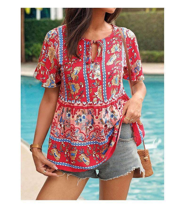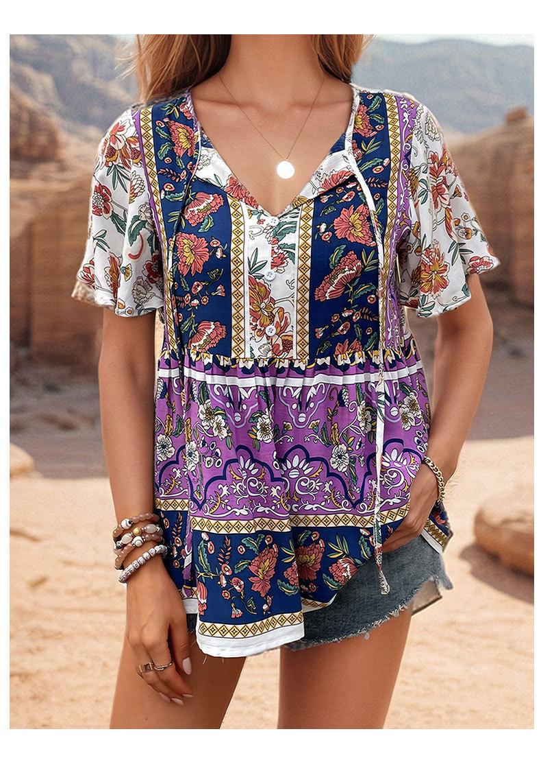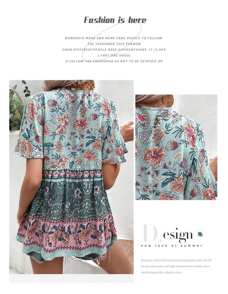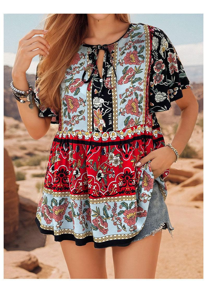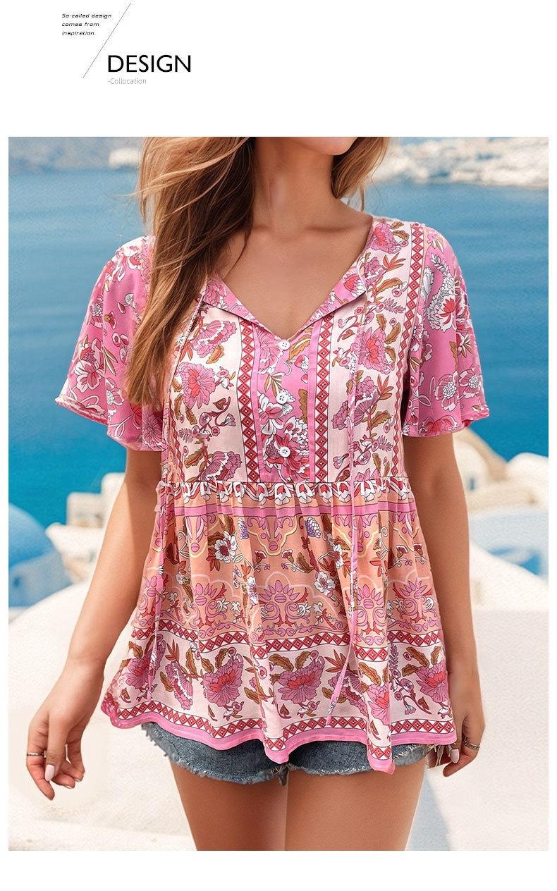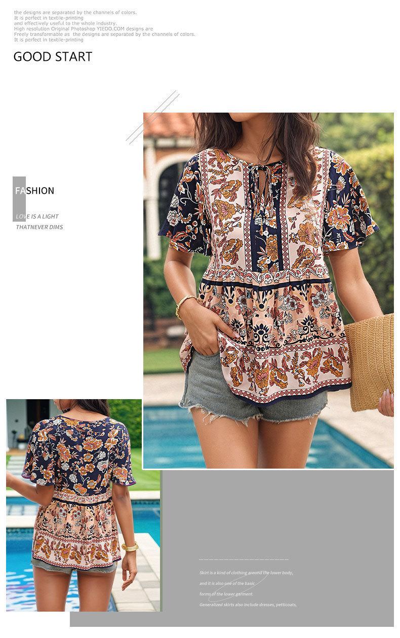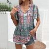 Talla grande transfronteriza 2024 Verano Nuevo Ropa de Mujer Europeo y Americano Casual Vacaciones Top Lazo Estampado Manga Hoja de Loto Camisa