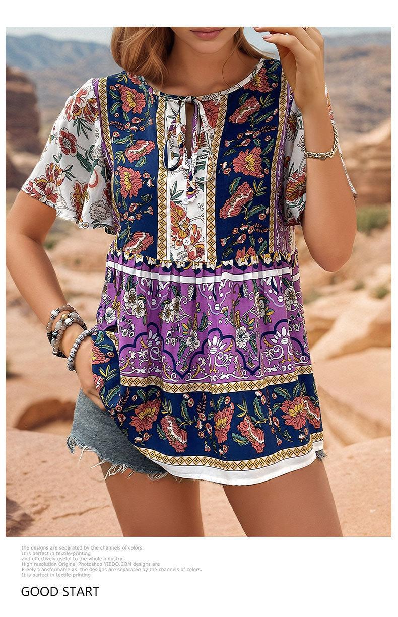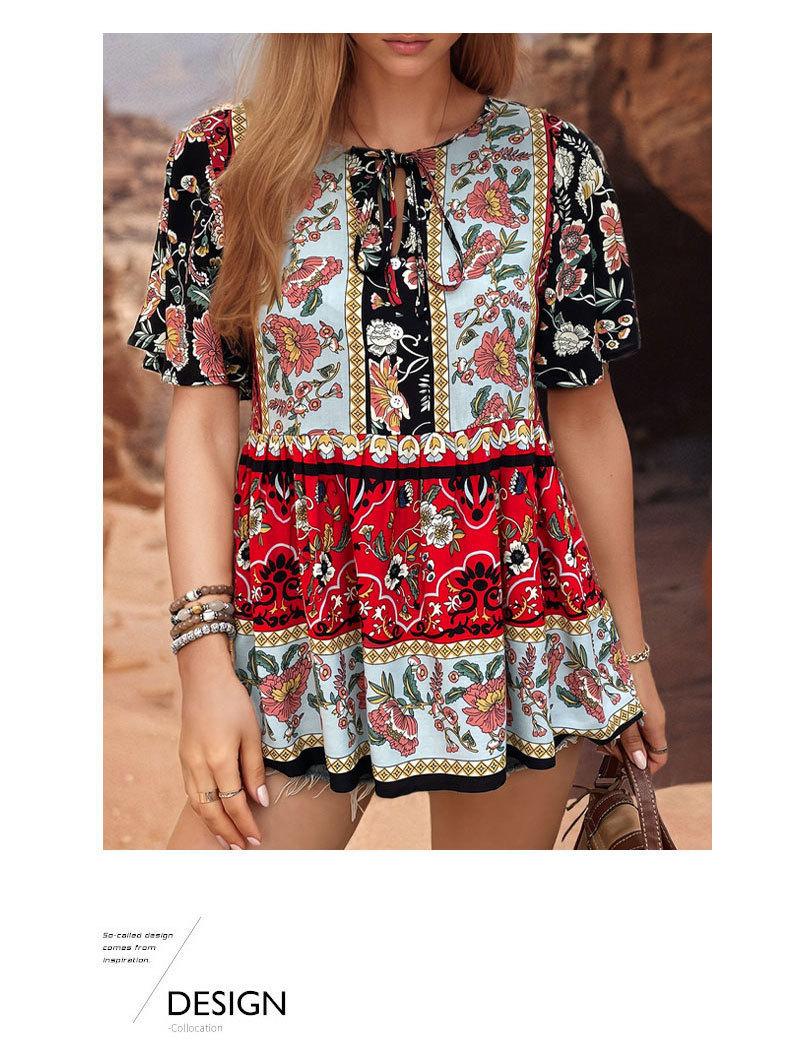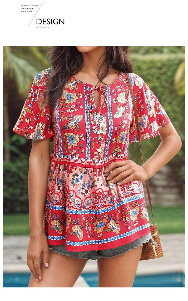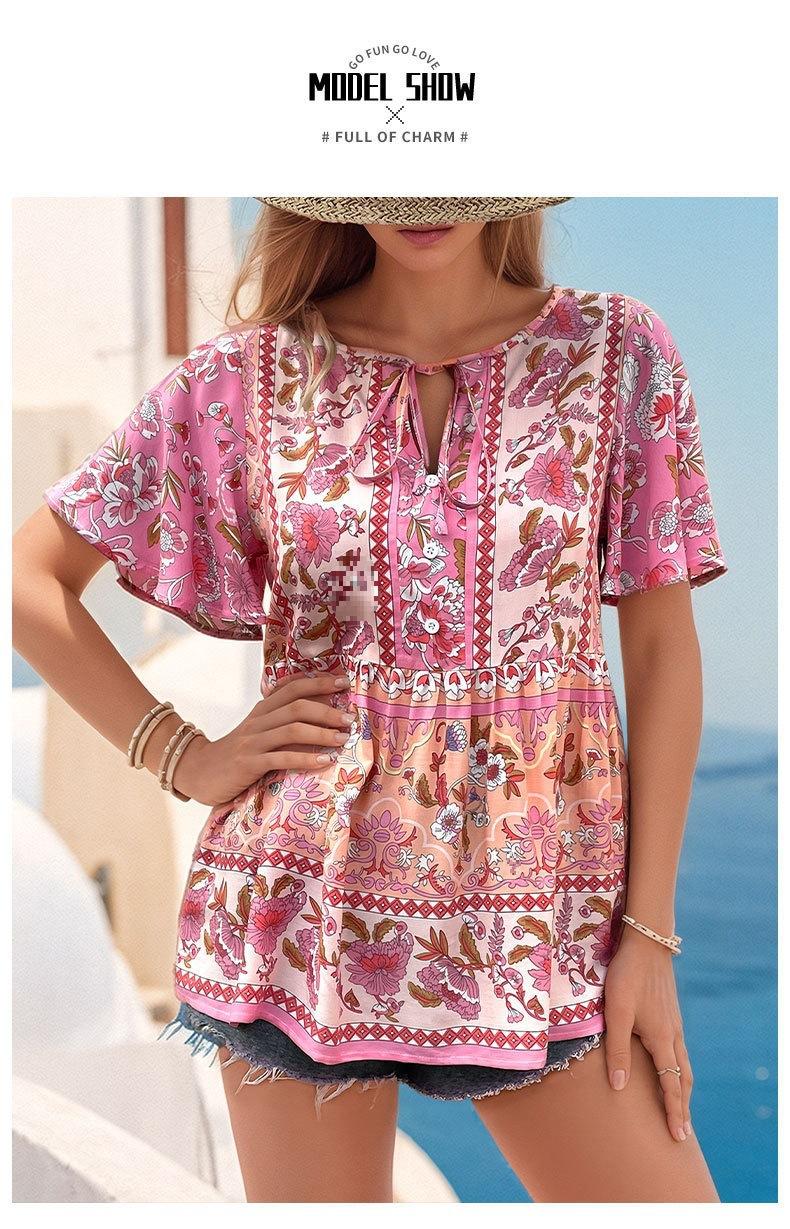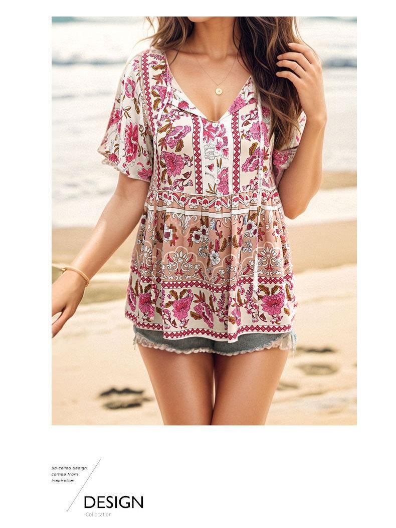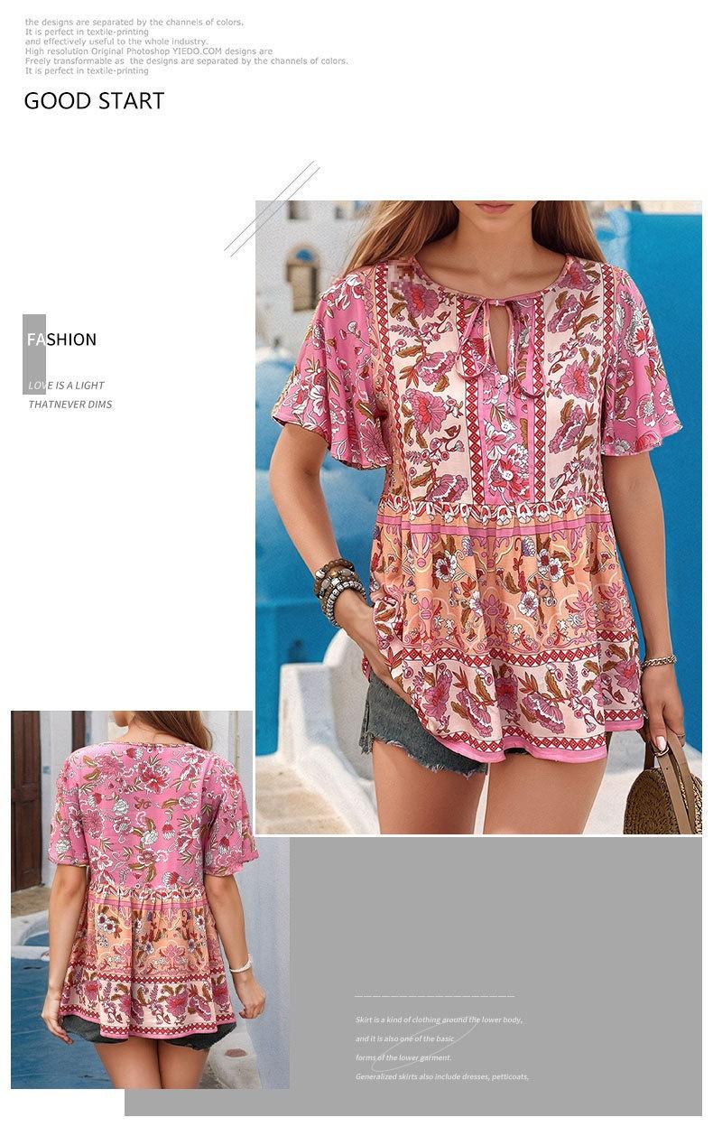 Talla grande transfronteriza 2024 Verano Nuevo Ropa de Mujer Europeo y Americano Casual Vacaciones Top Lazo Estampado Manga Hoja de Loto Camisa
