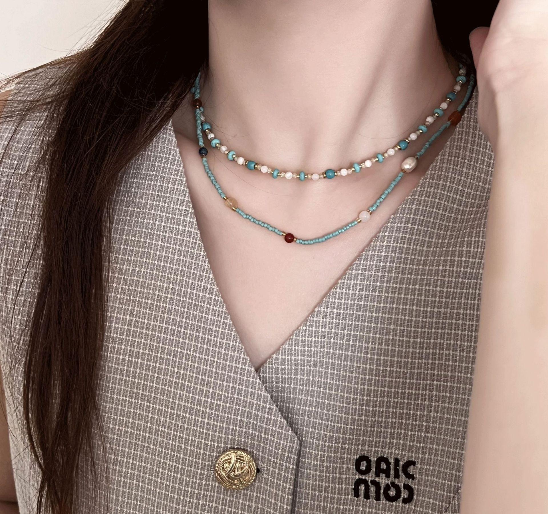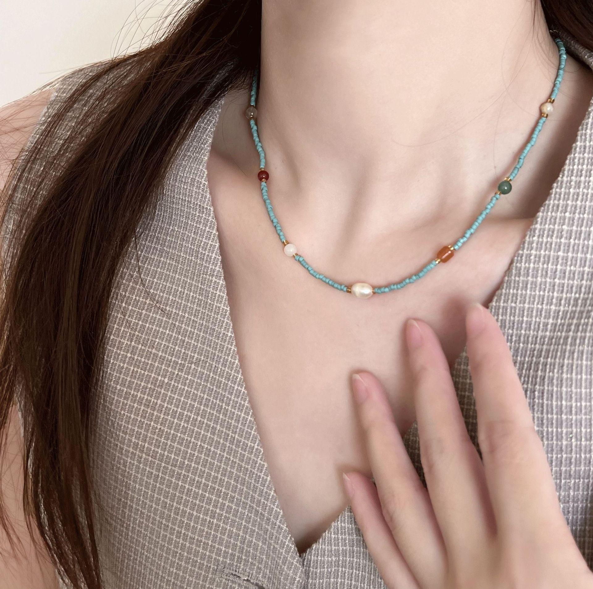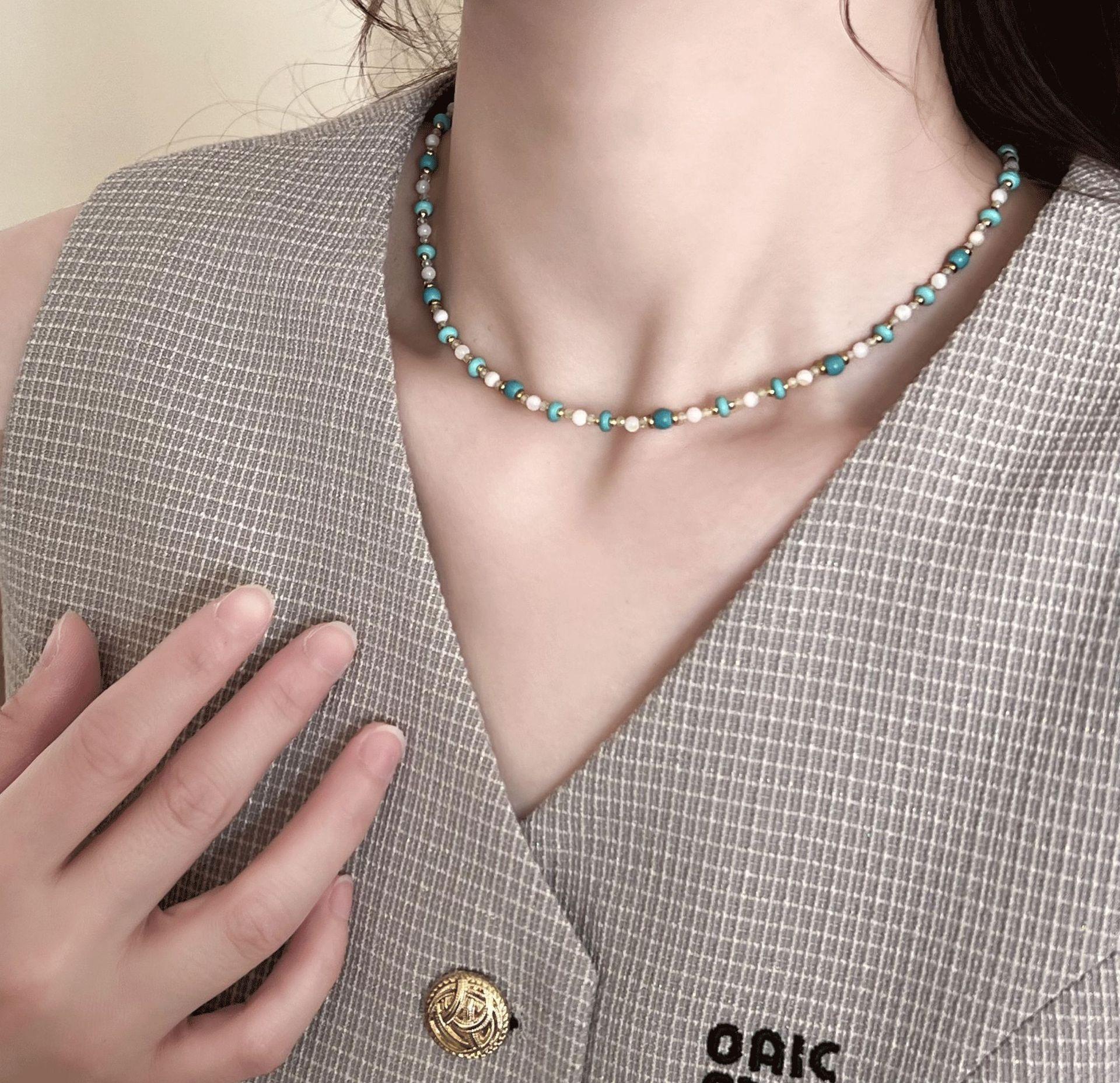 Nuevo Collar de Perlas Turquesas de Estilo Chino para Mujer Verano Color Fresco Pequeño Moda Lujo Ligero Dopamina Cadena Clavícula con Cuentas