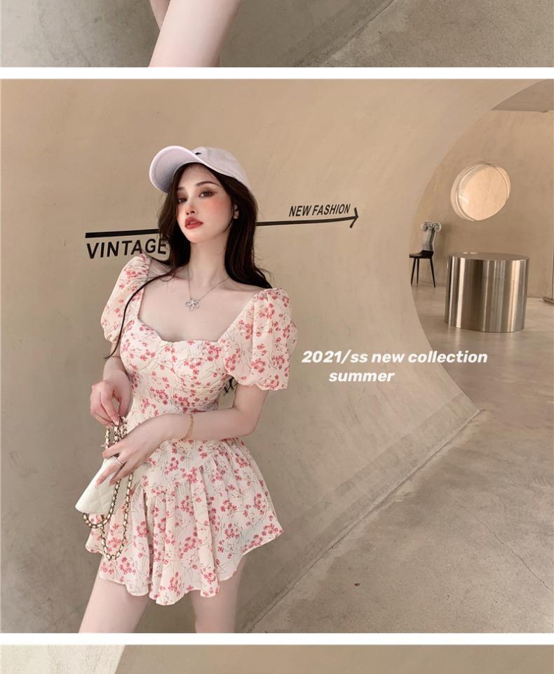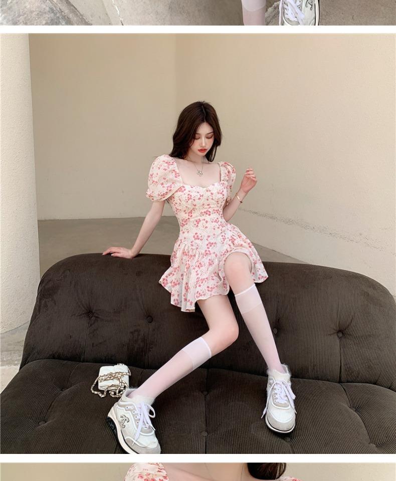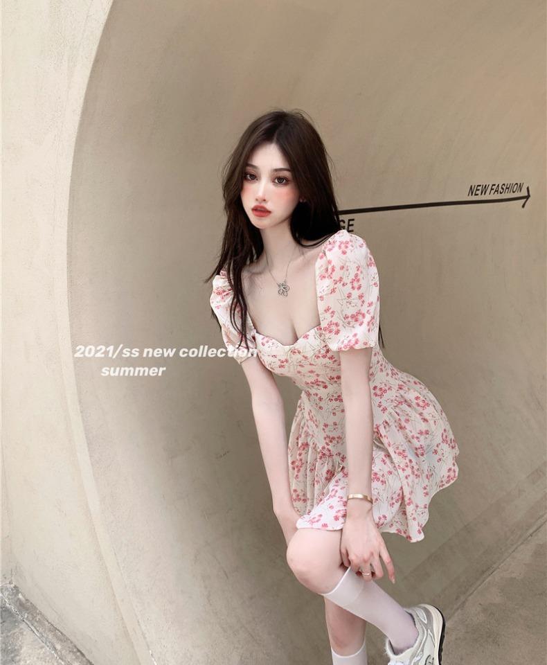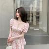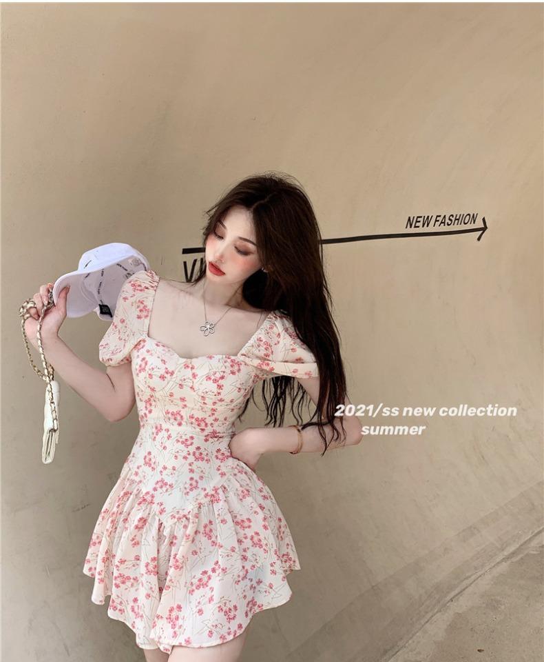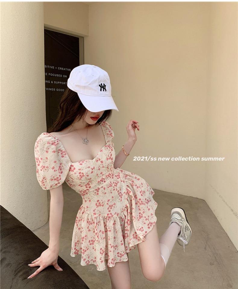 Vestido floral sexy, dulce y picante, estilo Pure Desire, novedad de verano 2023, con mangas abullonadas francesas, cintura adelgazante, falda con cuello cuadrado