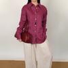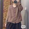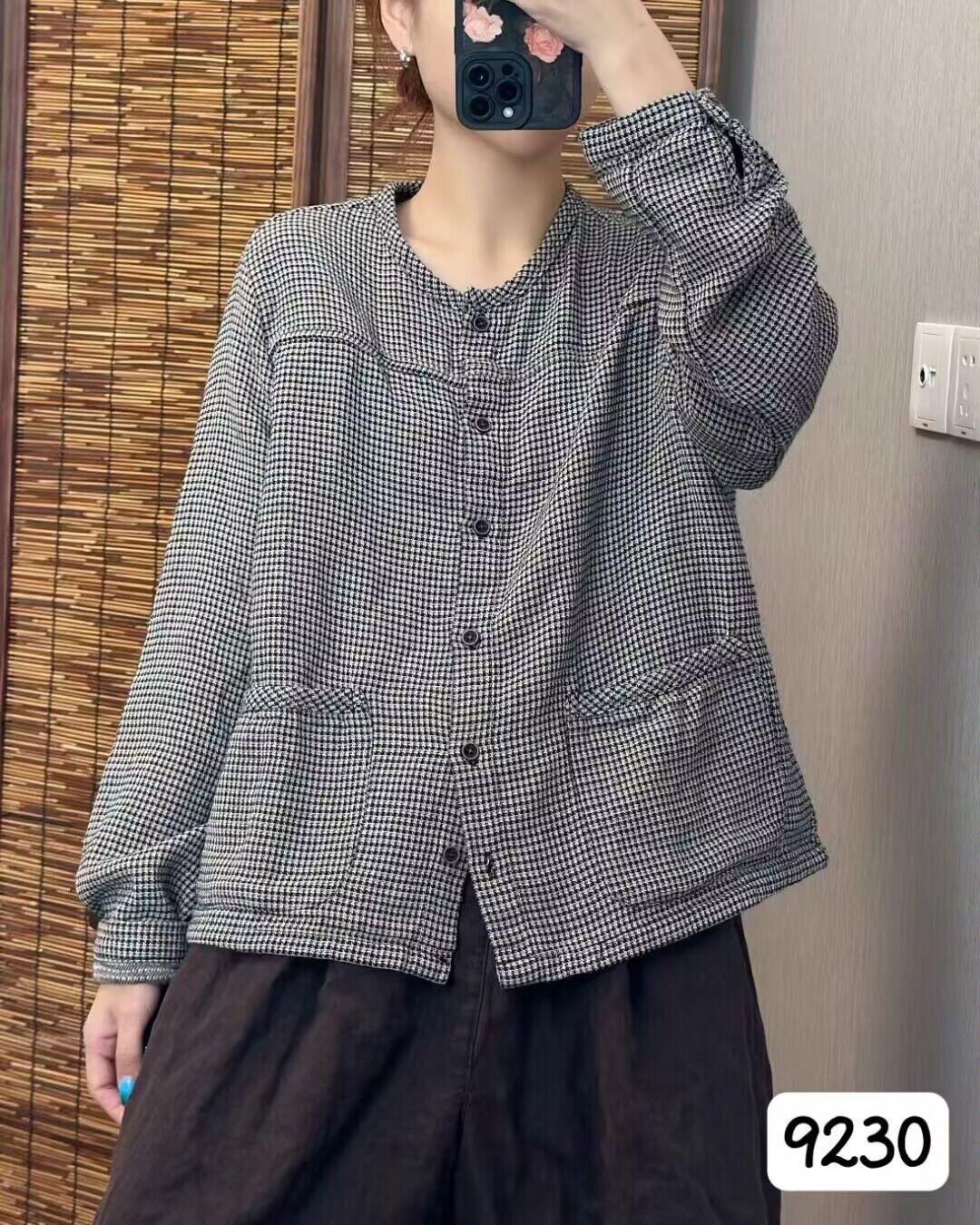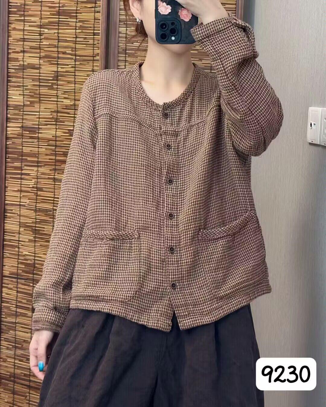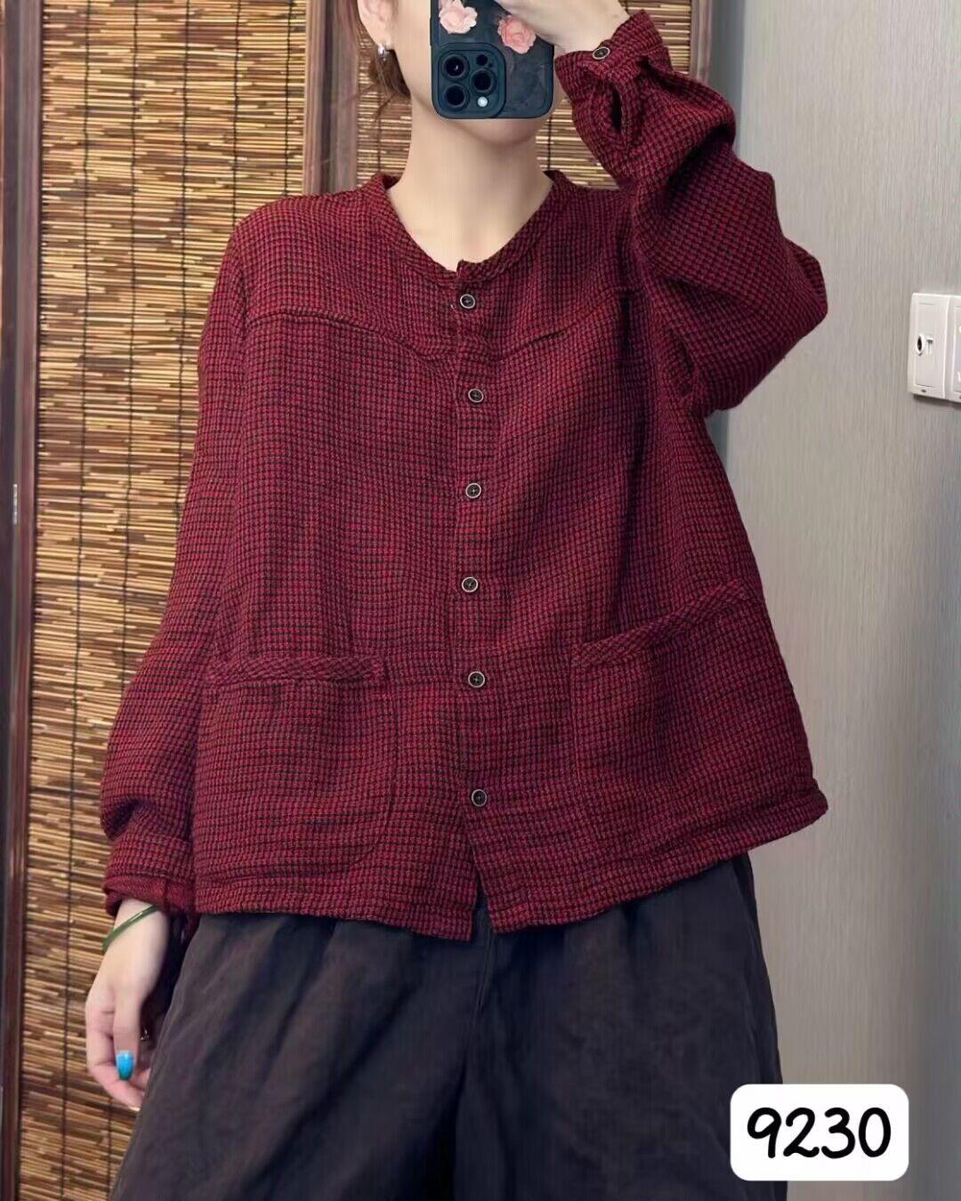 Camisa de lino doble para mujer, otoño 2024, alta gama, con bolsillo cosido, cárdigan informal holgado a cuadros, 9230