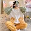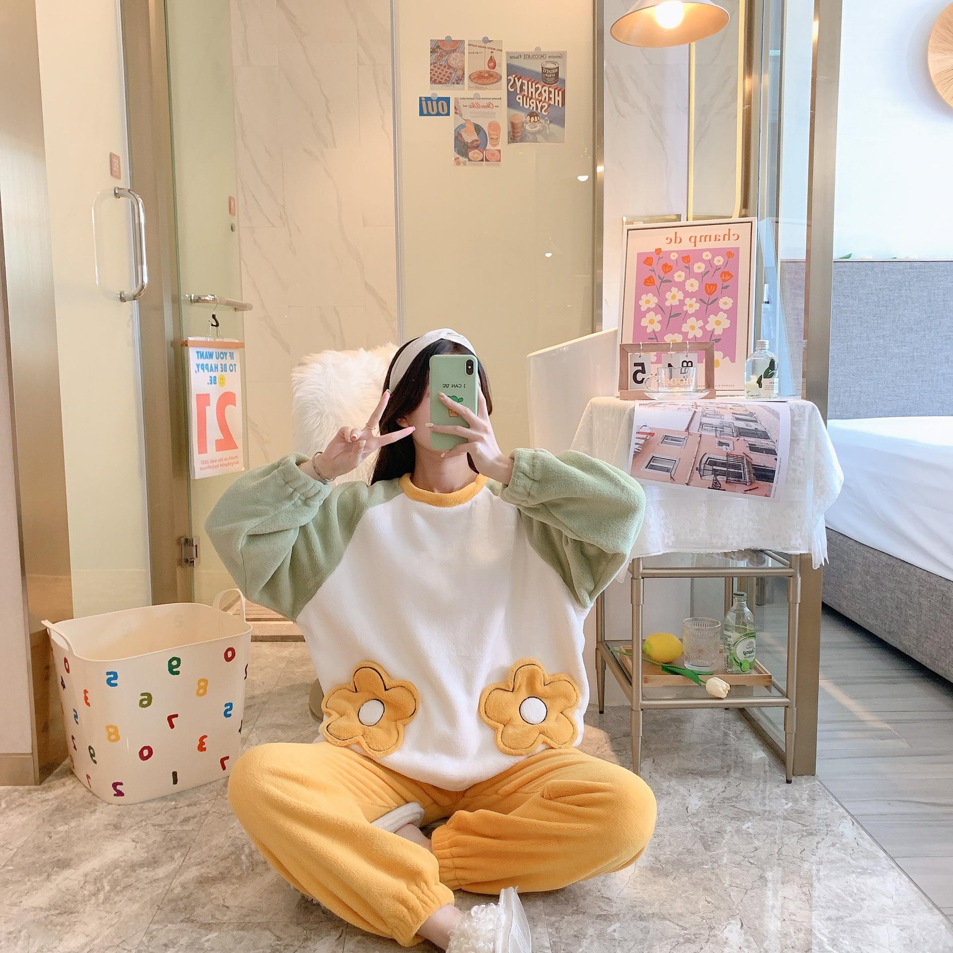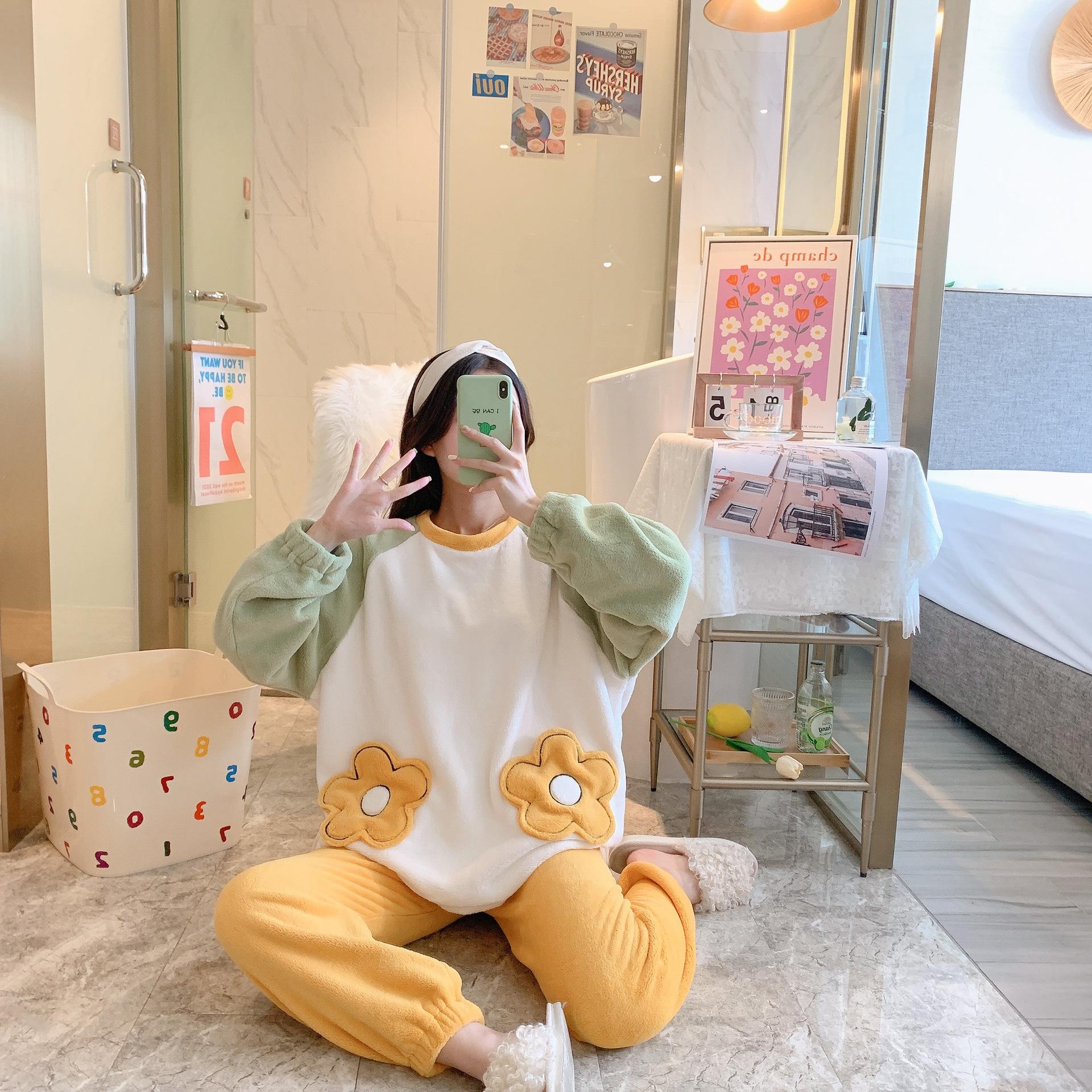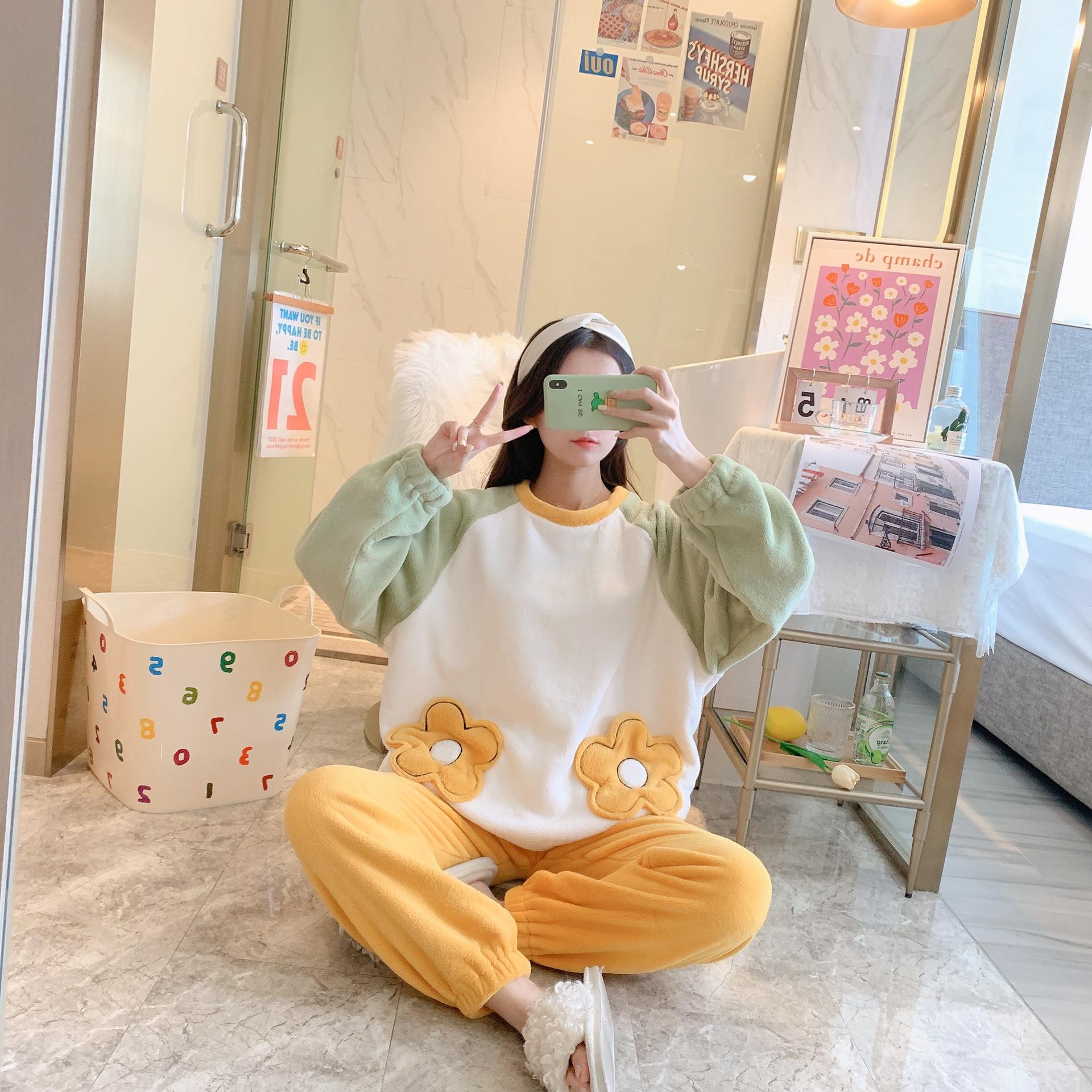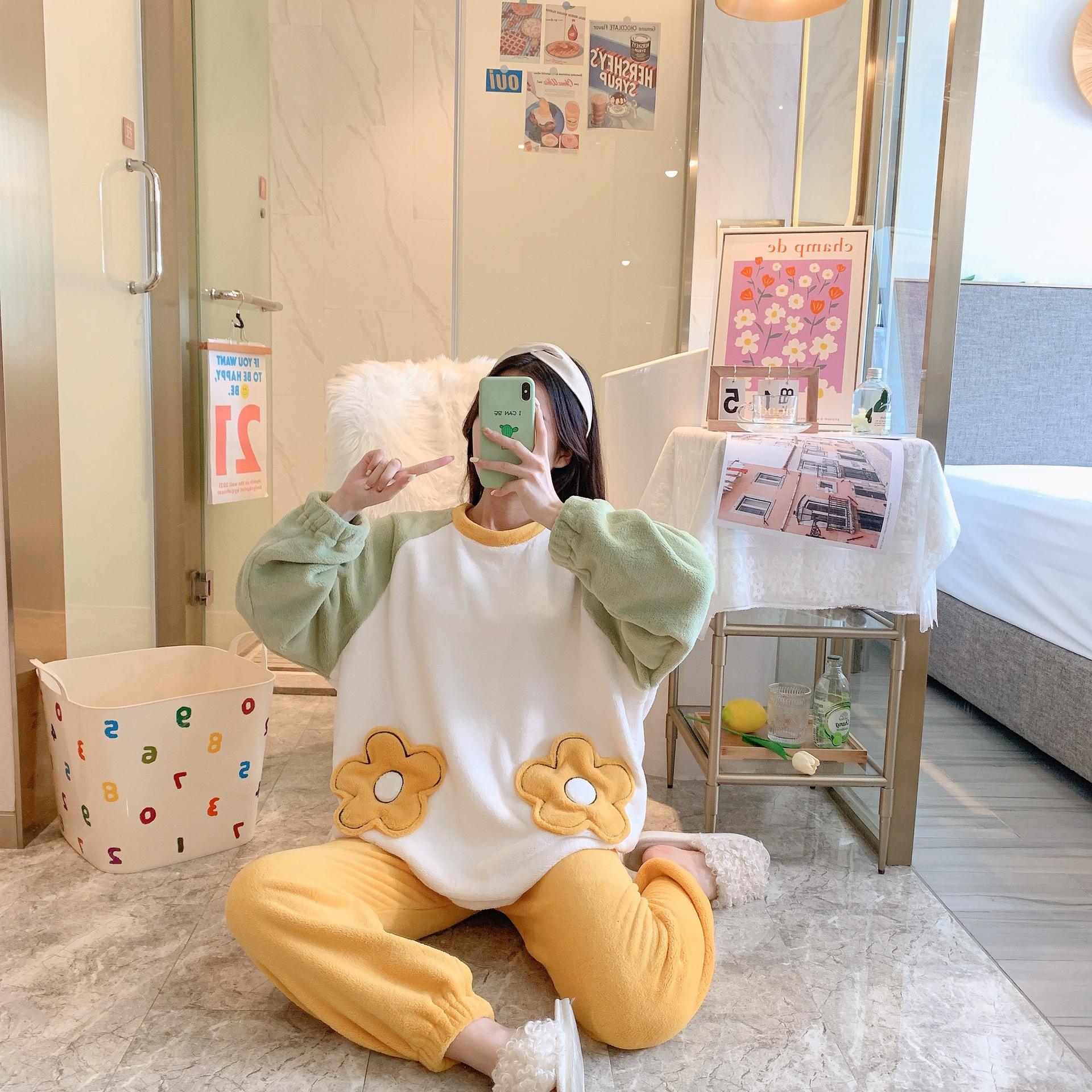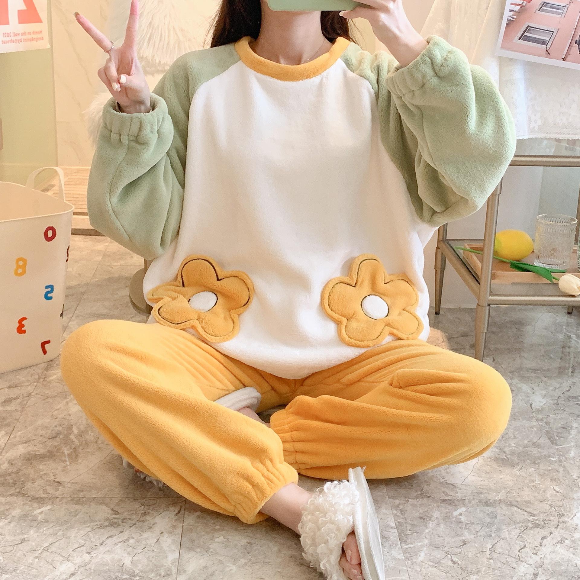Pijamas de otoño e invierno para mujer, de franela de 260 g, con terciopelo grueso y bonito bordado, ropa de hogar de terciopelo coral para mujer.