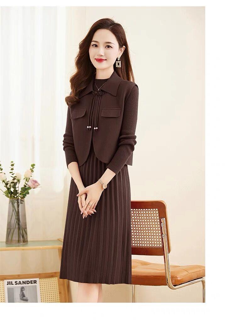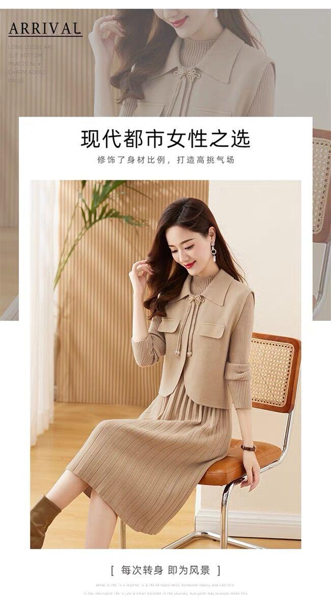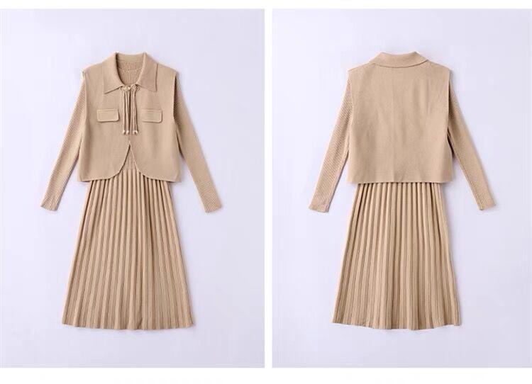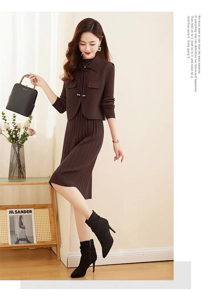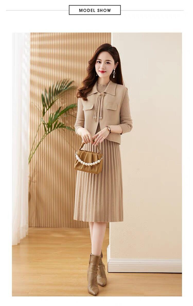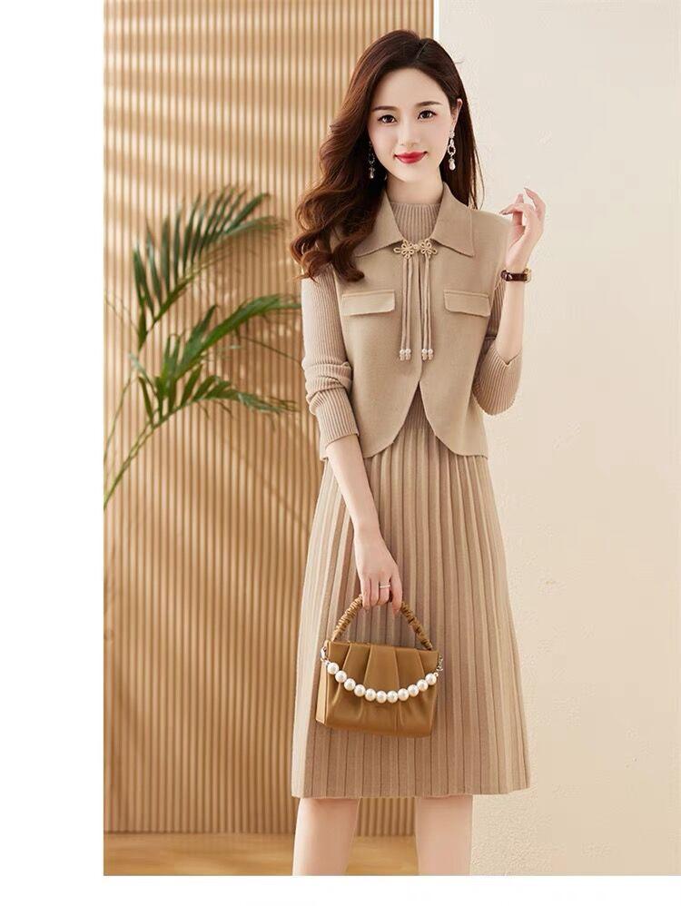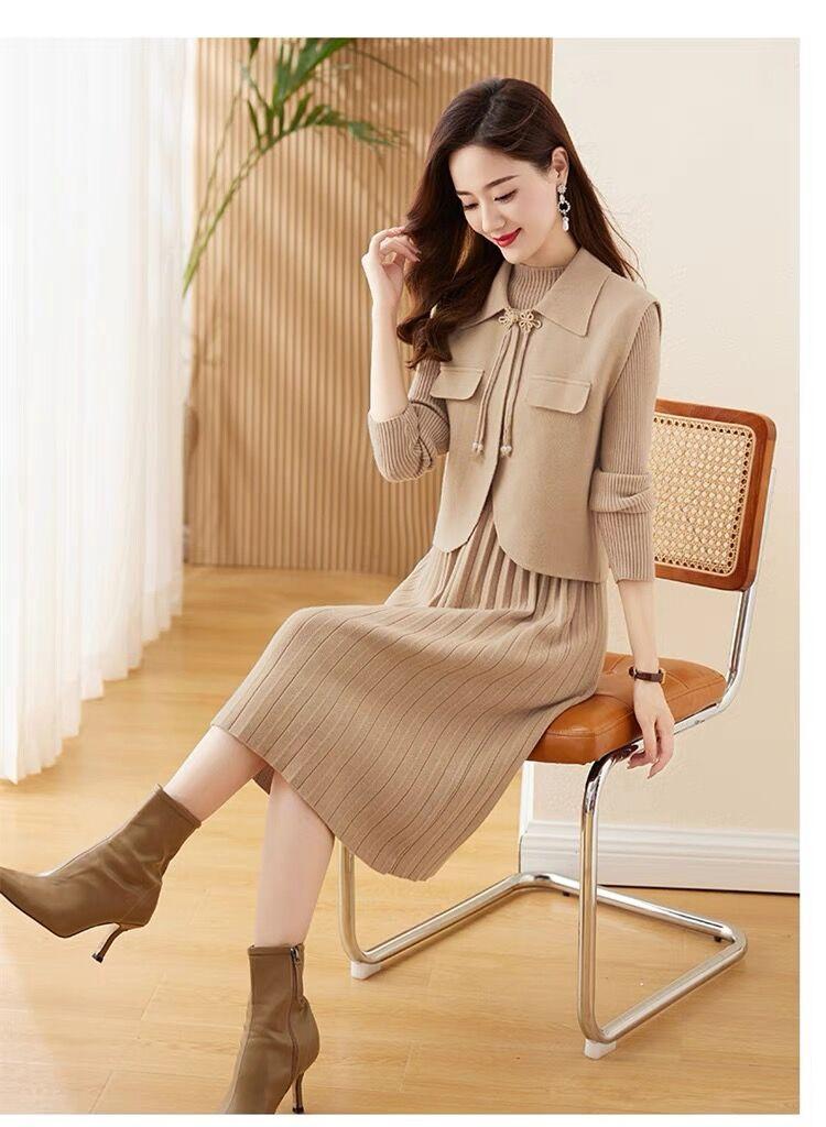 Vestido de Punto de Lana de Alta Gama para Mujer, Conjunto de Dos Piezas Chaleco Delgado, Otoño Nuevo Traje de Moda de Alta Gama Falda