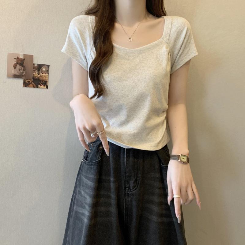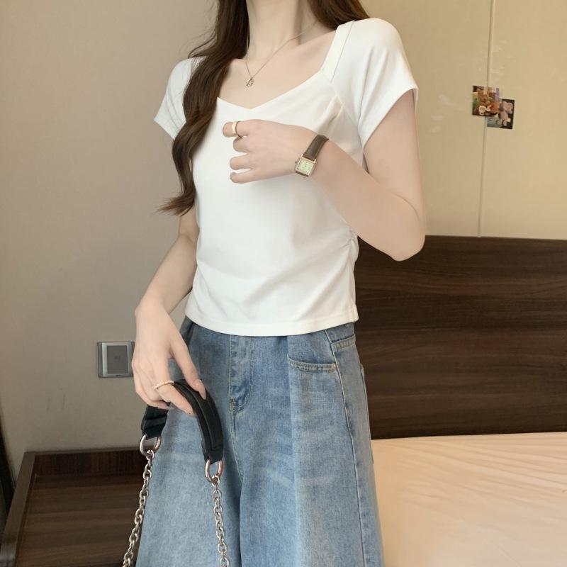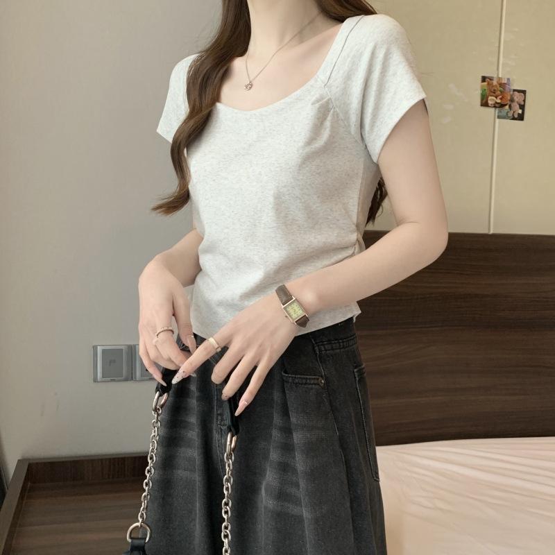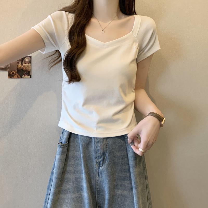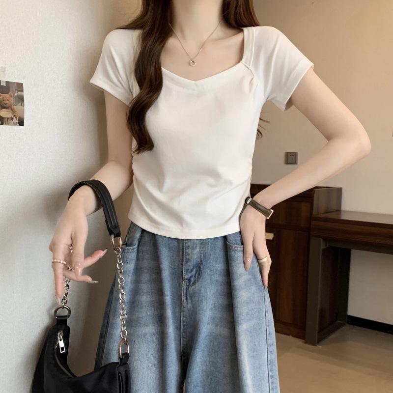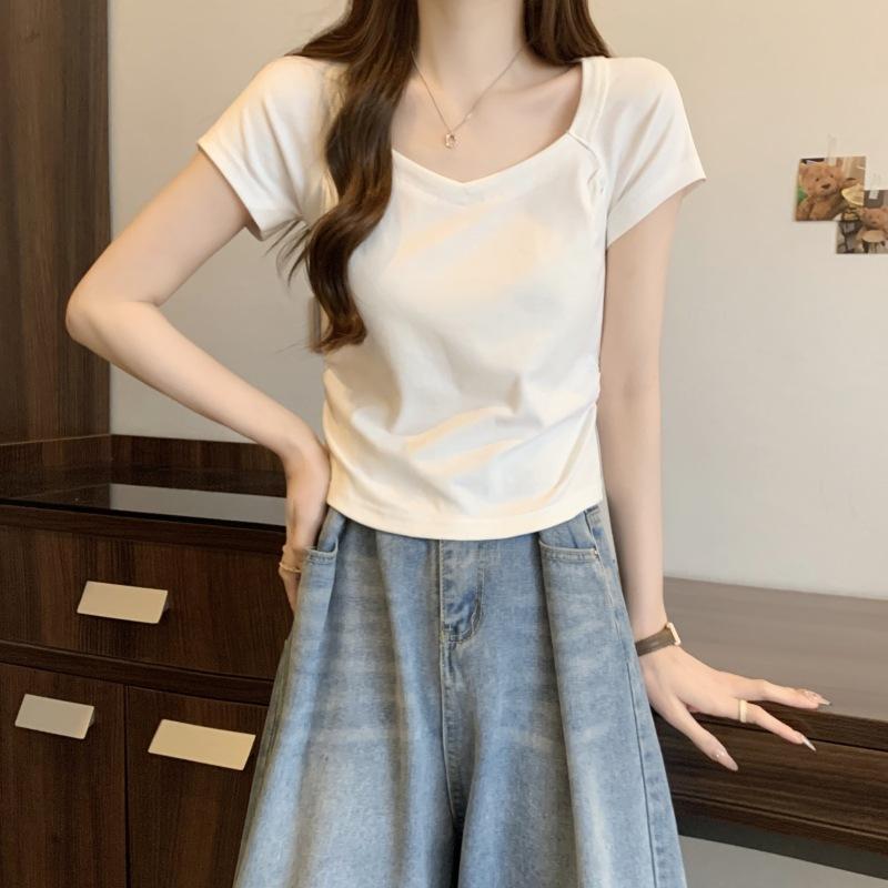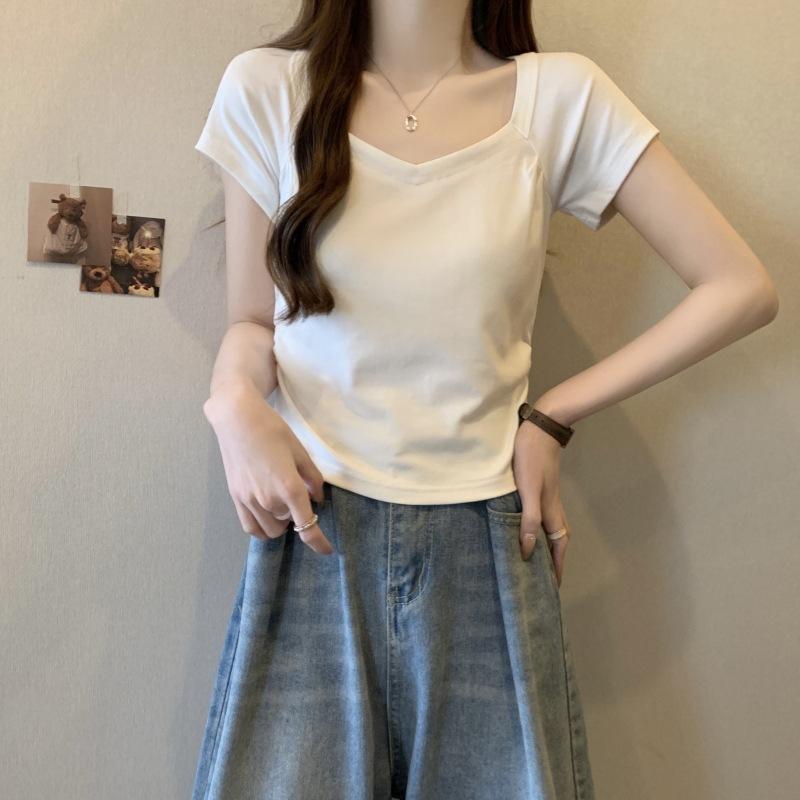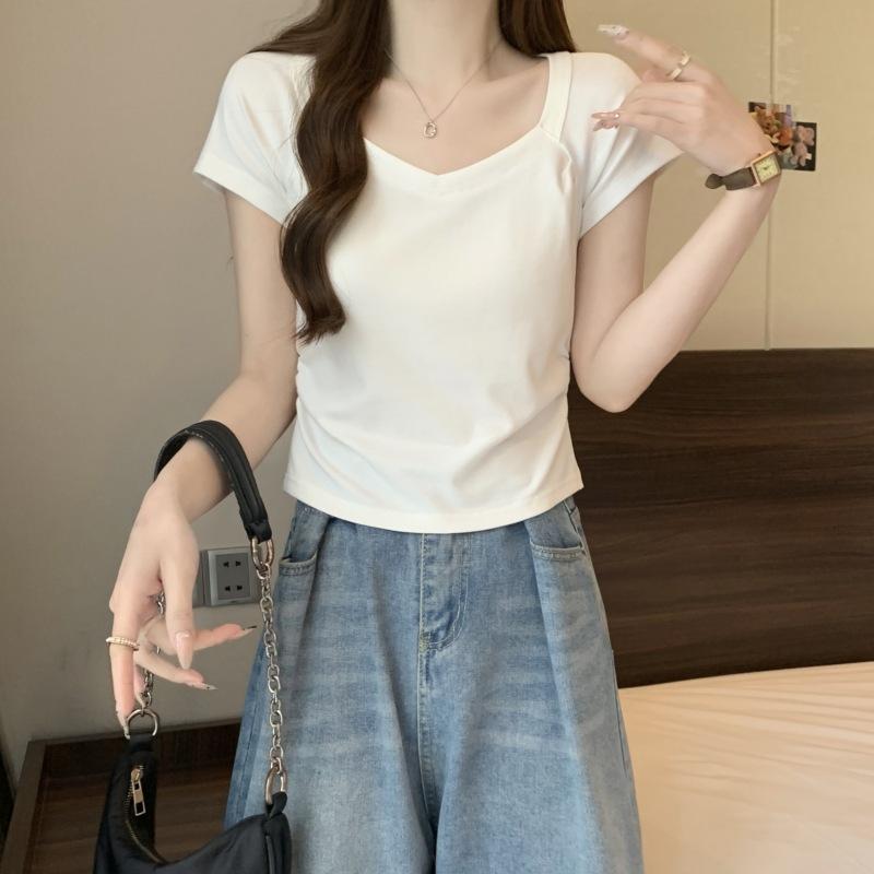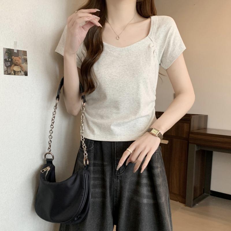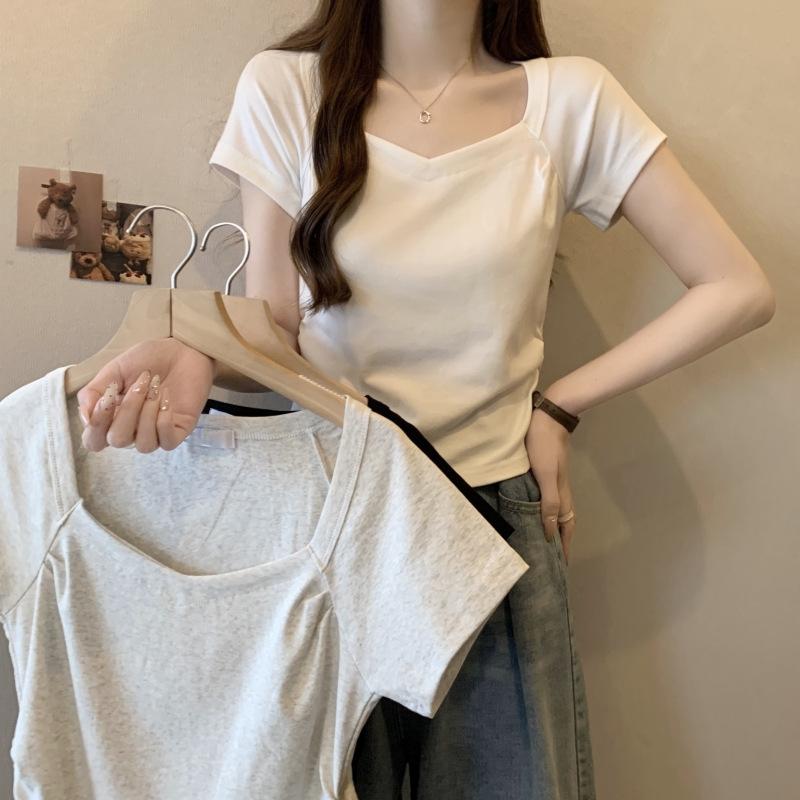 Camiseta de manga corta de algodón de verano 2024 para mujer, top ajustado, nuevo estilo coreano, diseño de nicho, corte ajustado, cuello en U ajustado