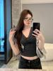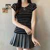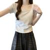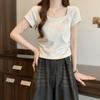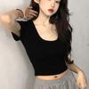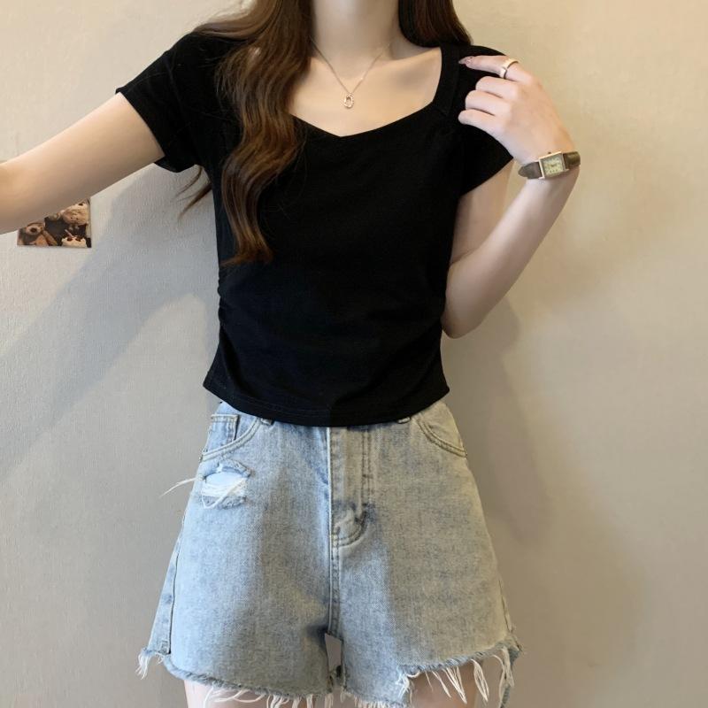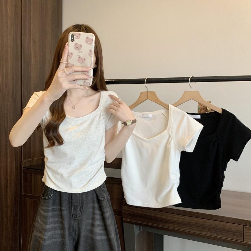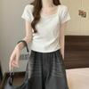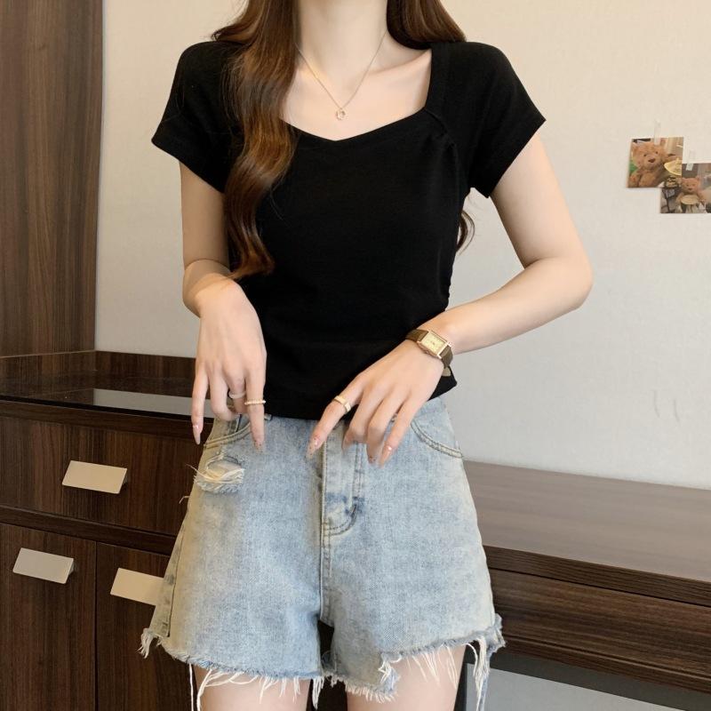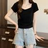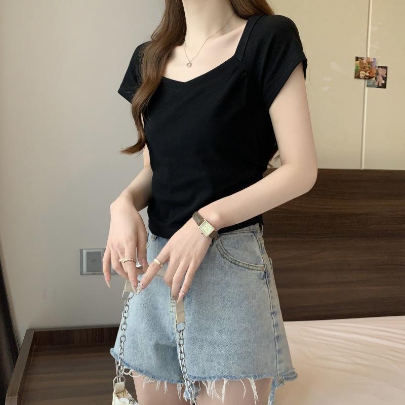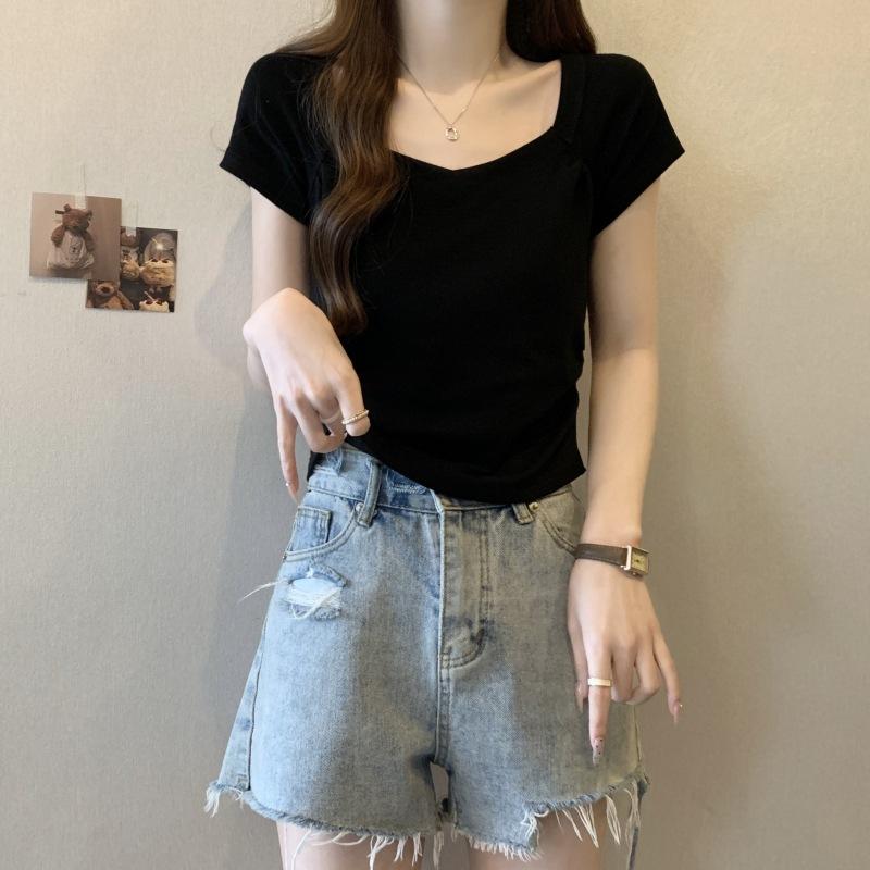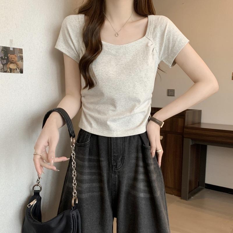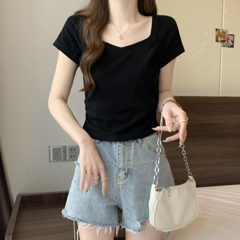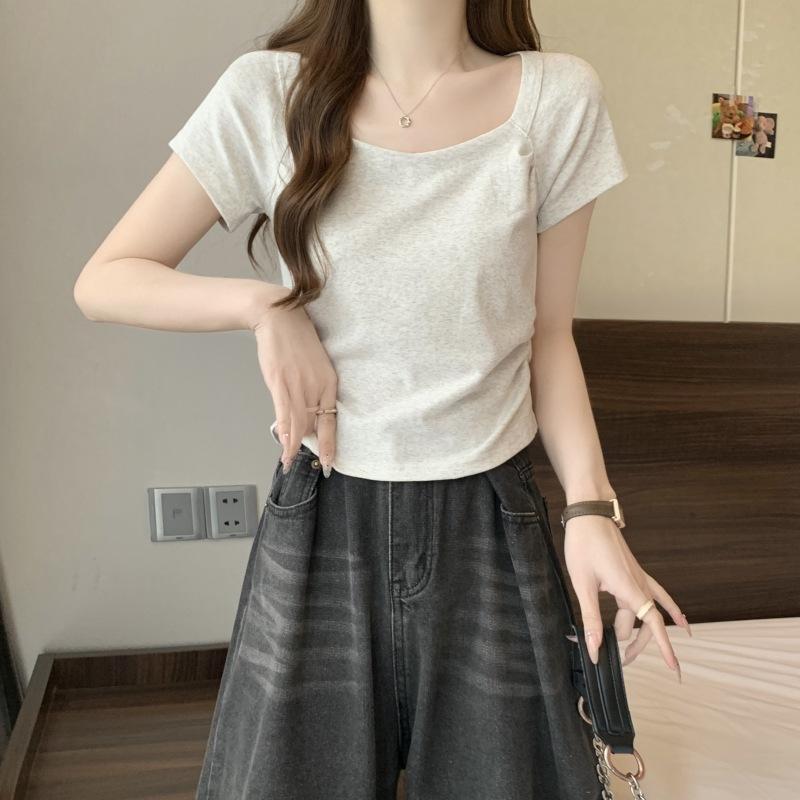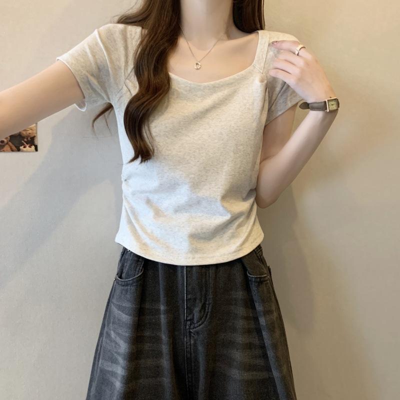 Camiseta de manga corta de algodón de verano 2024 para mujer, top ajustado, nuevo estilo coreano, diseño de nicho, corte ajustado, cuello en U ajustado