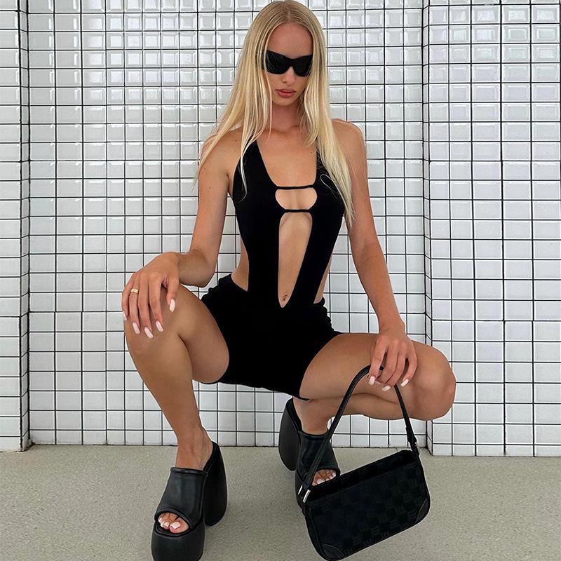 Pantalones cortos de una pieza con tirantes huecos, sin mangas, de color sólido, sexys, para mujer europea y americana, novedad de verano de 2023