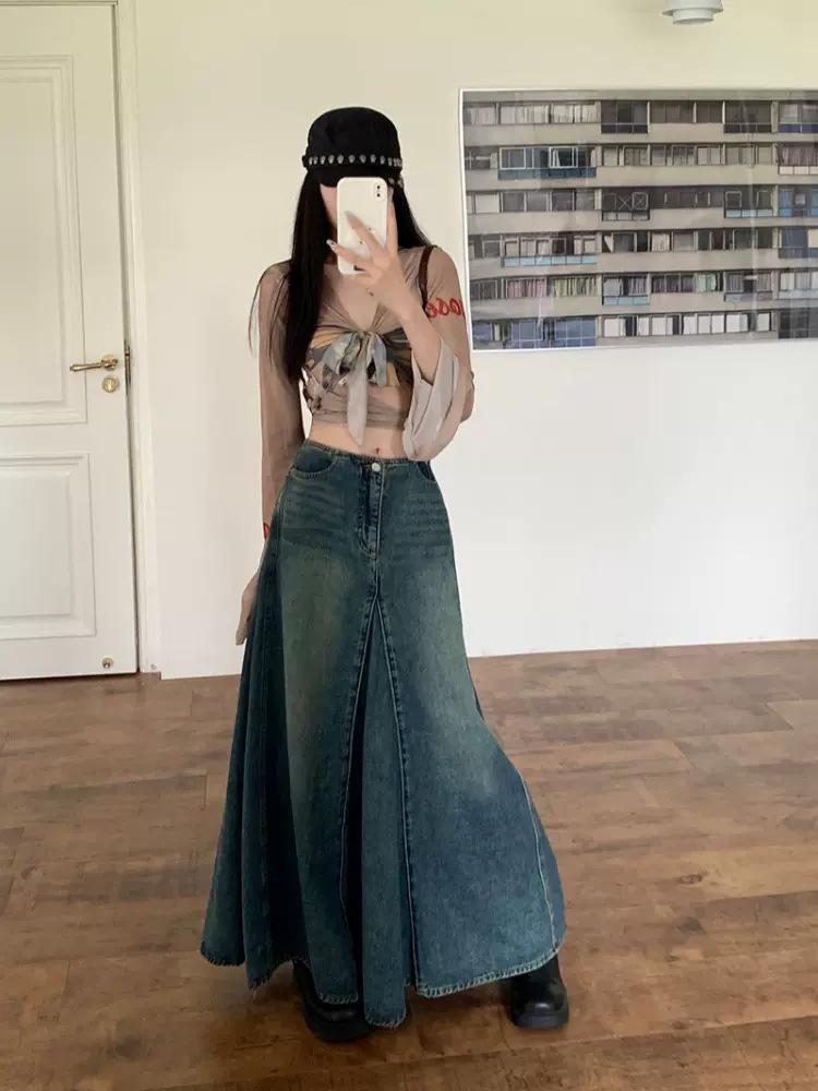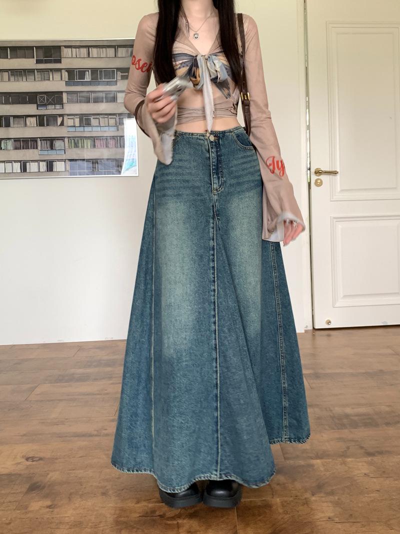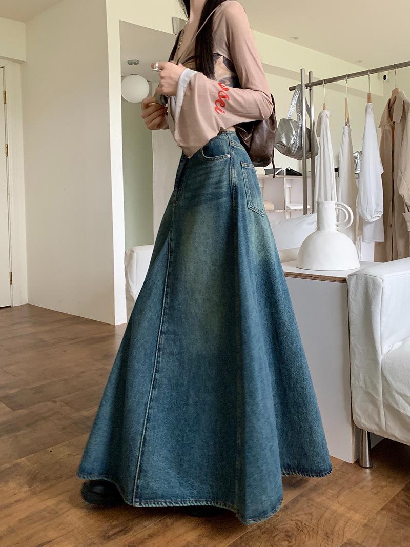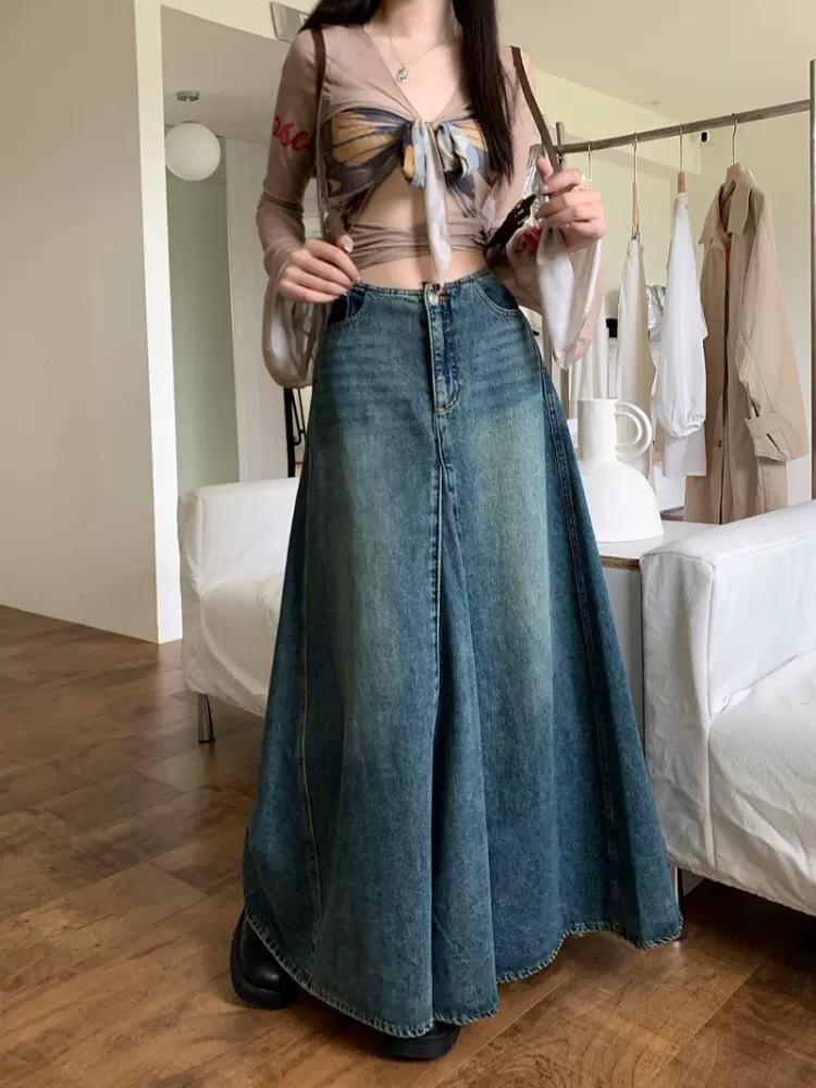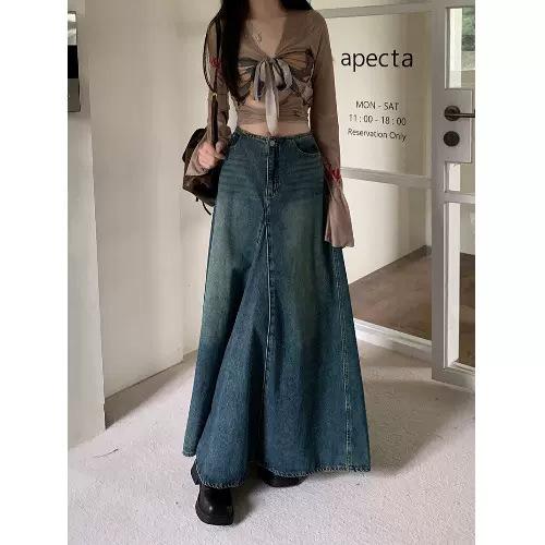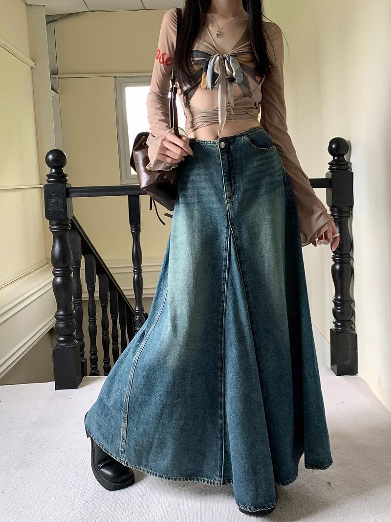 Falda vaquera retro de verano, talla grande, cintura alta, línea A, para mujer, mediana, larga, ajustada, con paraguas