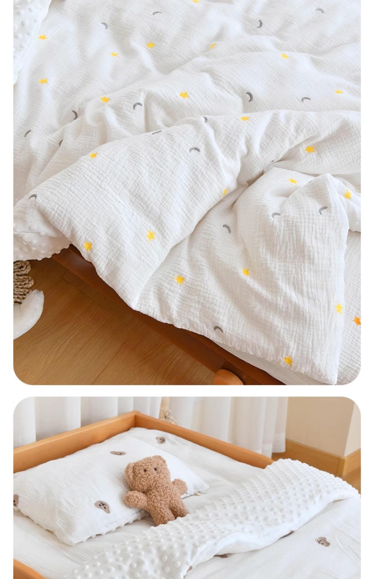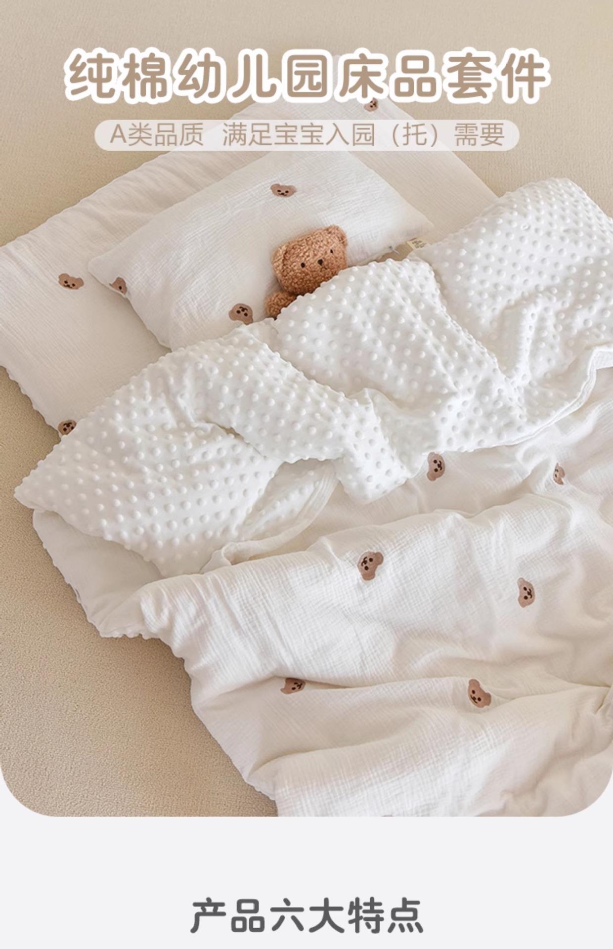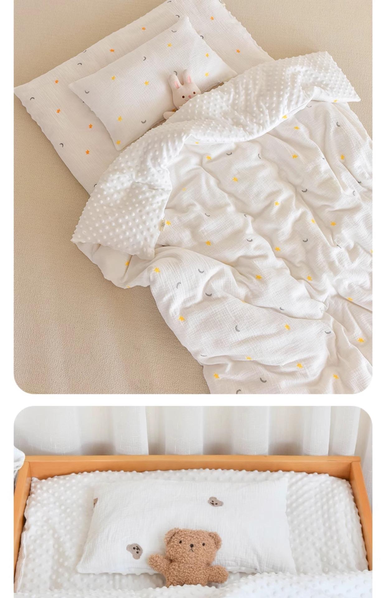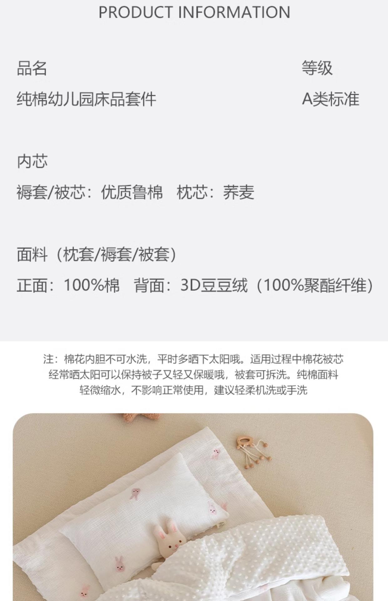 Juego de ropa de cama para jardín de infantes Diseño de doble cara, un lado es de tela de algodón puro, el otro lado es de terciopelo. El núcleo de la almohada está relleno de cáscaras de trigo sarraceno, lo que resulta cómodo y puede ayudarte a concentrarte. Suave y agradable para la piel, cremallera invisible, bordado exquisito, calidad Clase A.