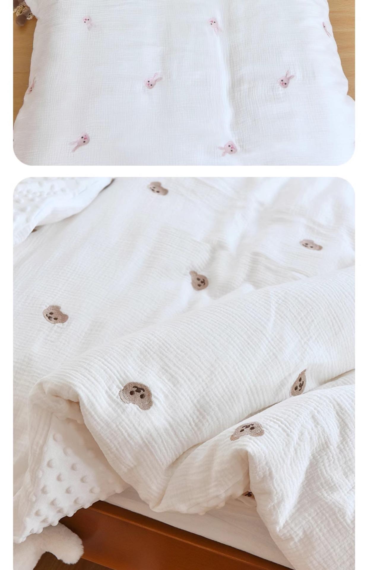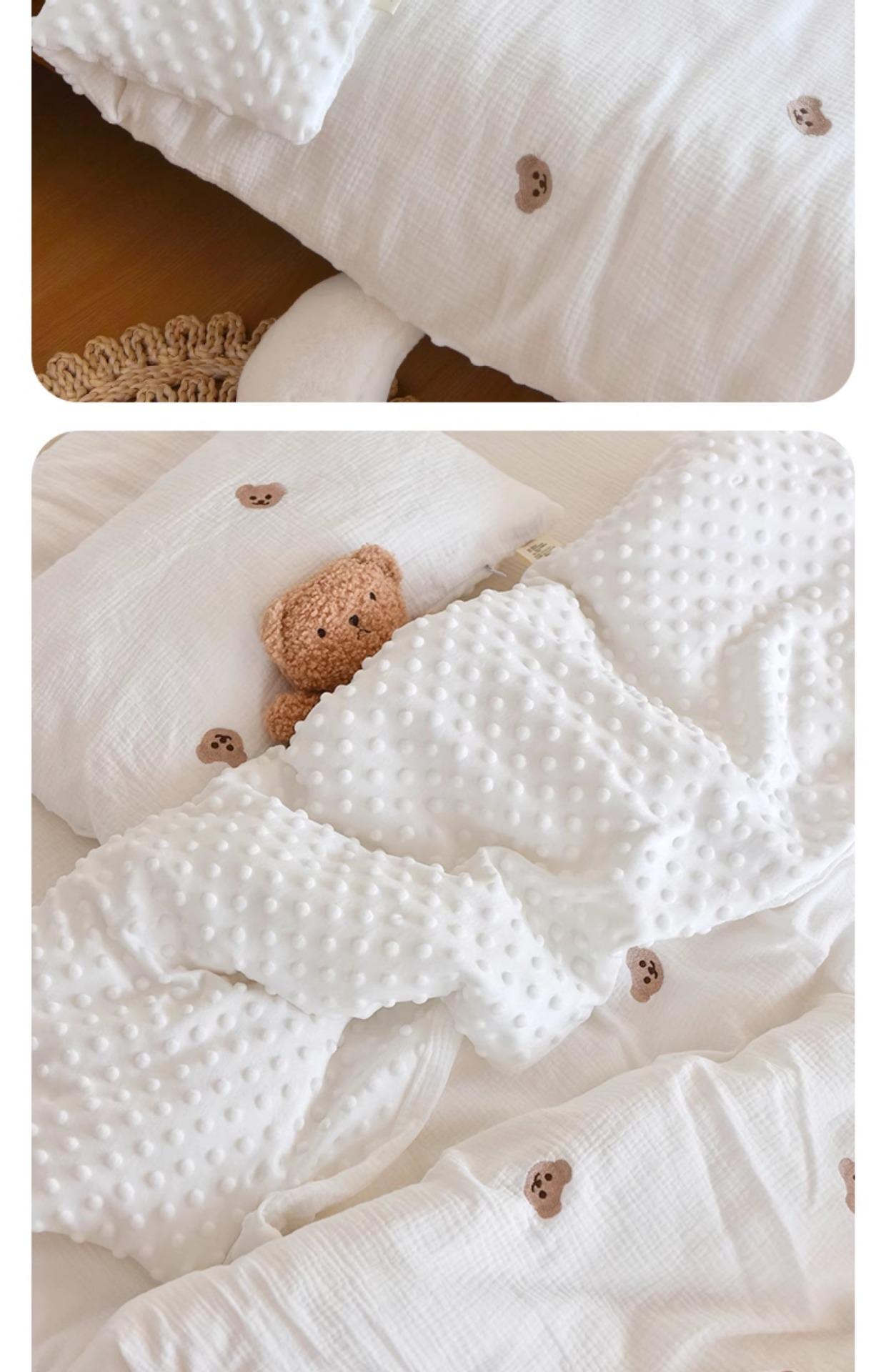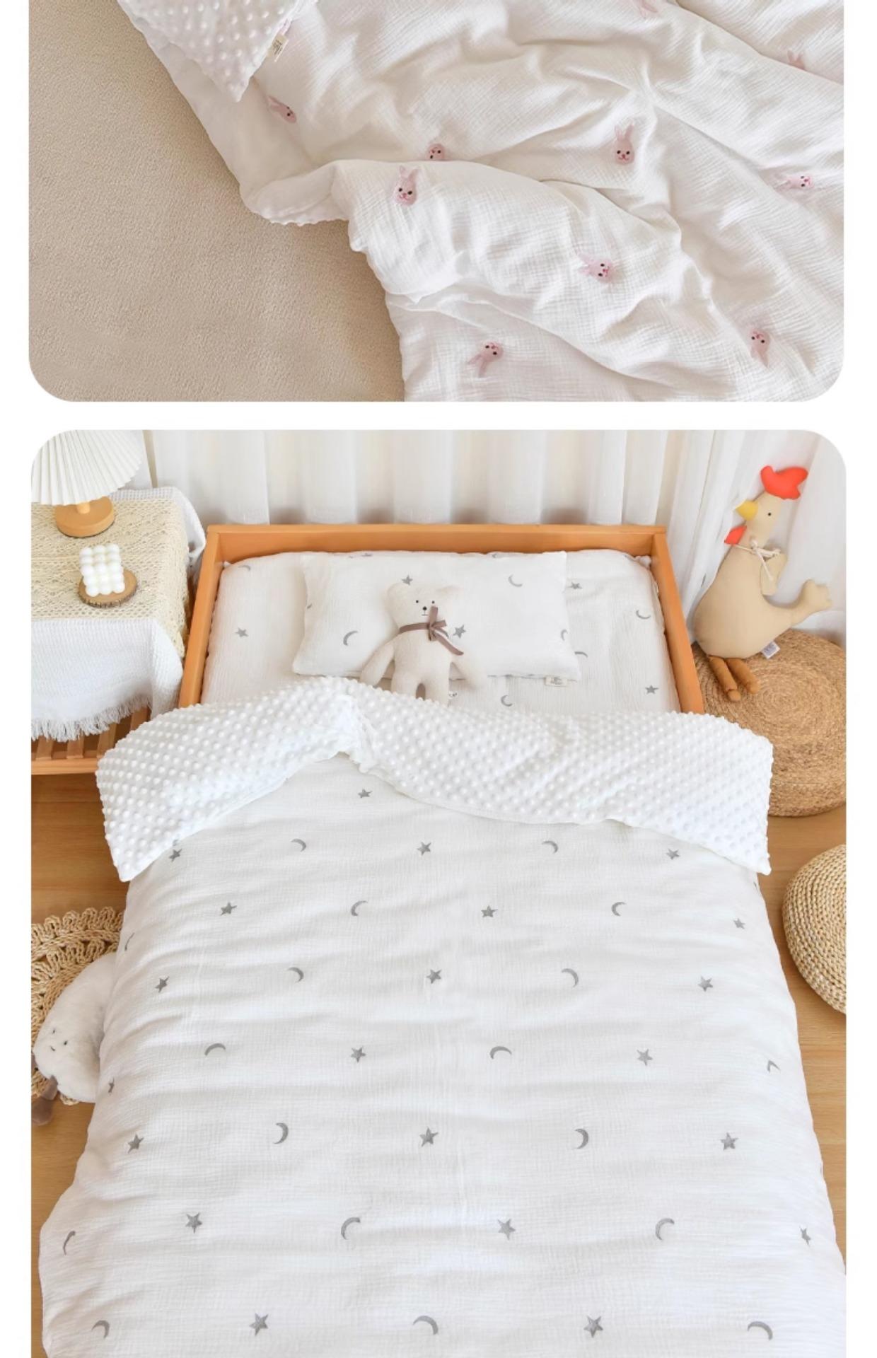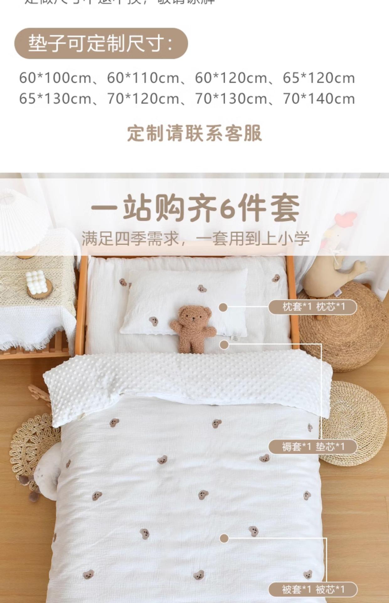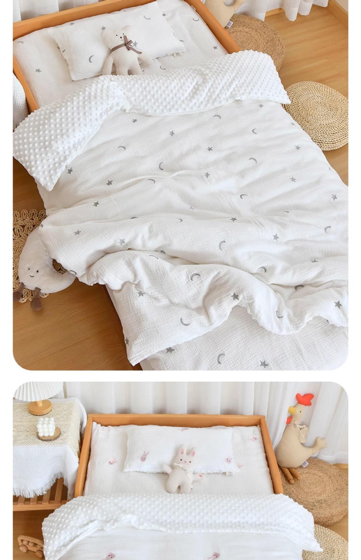 Juego de ropa de cama para jardín de infantes Diseño de doble cara, un lado es de tela de algodón puro, el otro lado es de terciopelo. El núcleo de la almohada está relleno de cáscaras de trigo sarraceno, lo que resulta cómodo y puede ayudarte a concentrarte. Suave y agradable para la piel, cremallera invisible, bordado exquisito, calidad Clase A.
