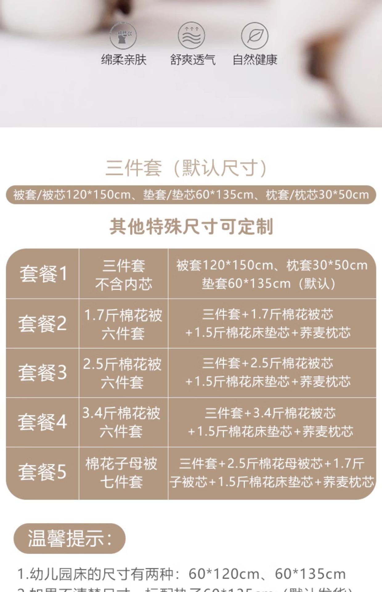 Seven-piece set [three-piece set + cotton quilt core 0.85kg + 1.4kg + cotton cushion core 0.75kg + buckwheat pillow core] suitable for indoor 0-25 degrees