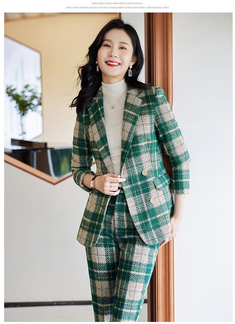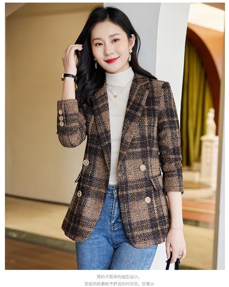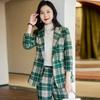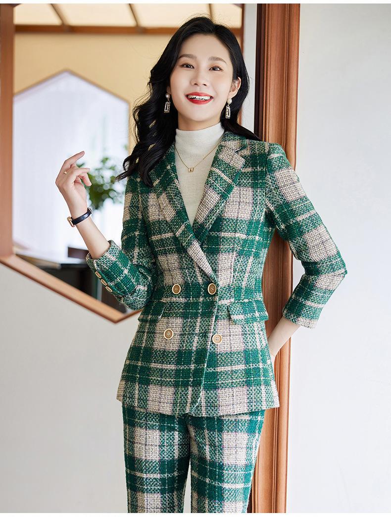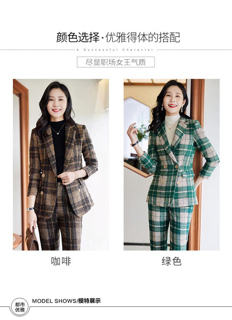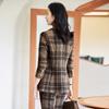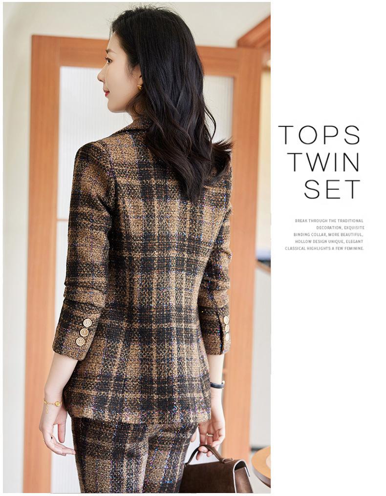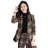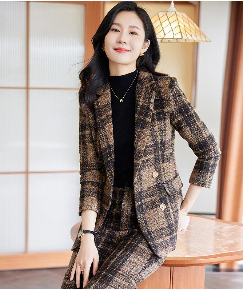 2020 Otoño e Invierno nuevo marrón cuadros manga larga traje pequeño cuello chaqueta mujer pantalones dos piezas traje viajero