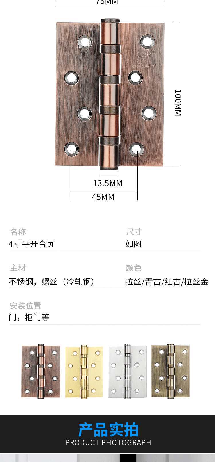 Bisagra de puerta al por mayor de acero inoxidable con cojinete silencioso para baño, puerta de madera de hojas sueltas, bisagra plana de 4 pulgadas, plegable