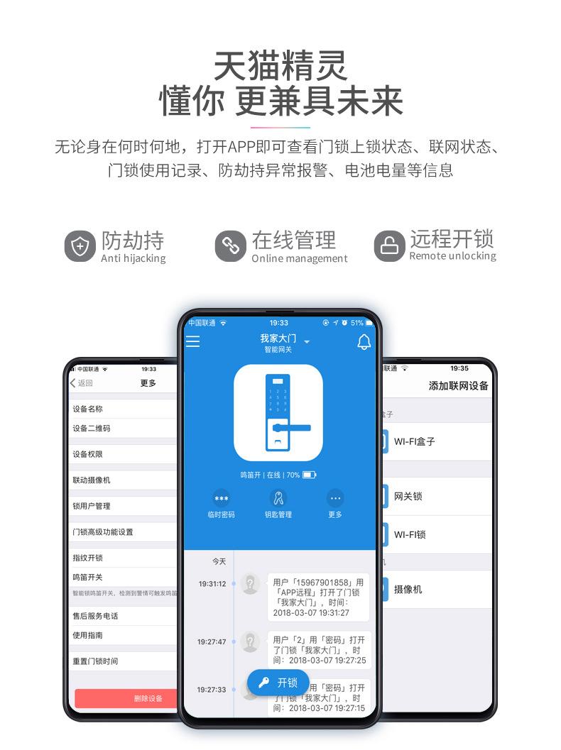 Métodos de apertura de puerta expandibles:Función de desbloqueo por envío de información en tiempo real en línea de la APP/Desbloqueo por Bluetooth/Integración con sistema de hogar inteligente/Desbloqueo por control remoto