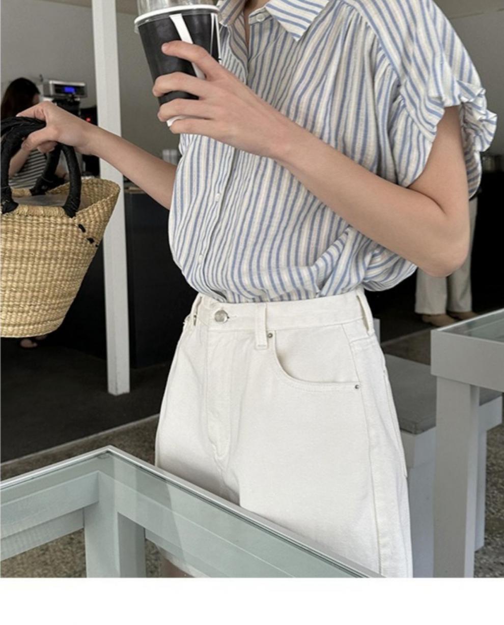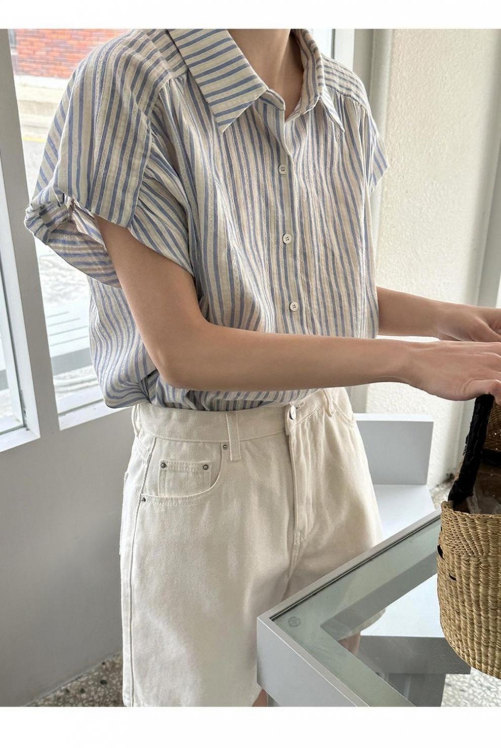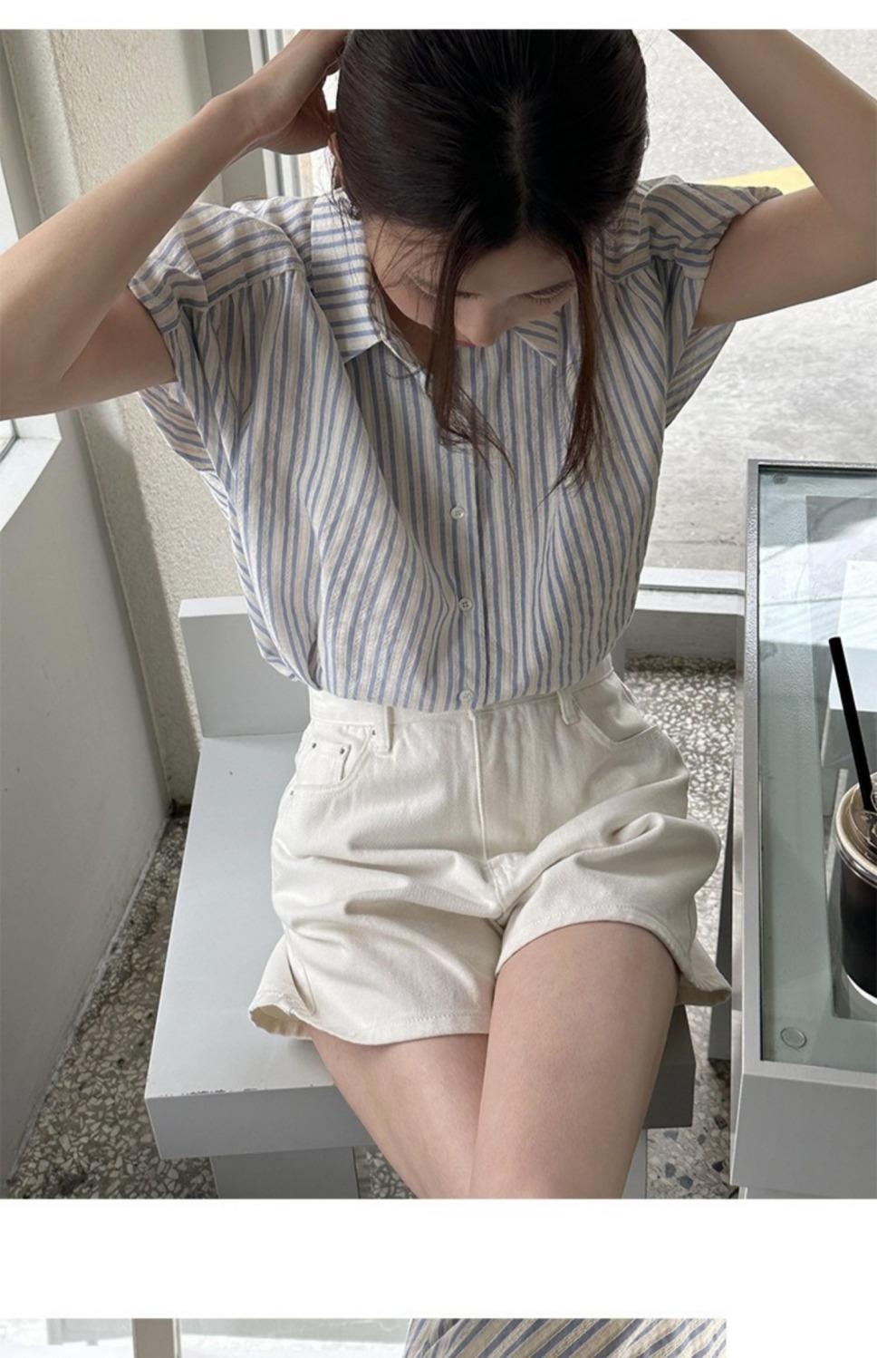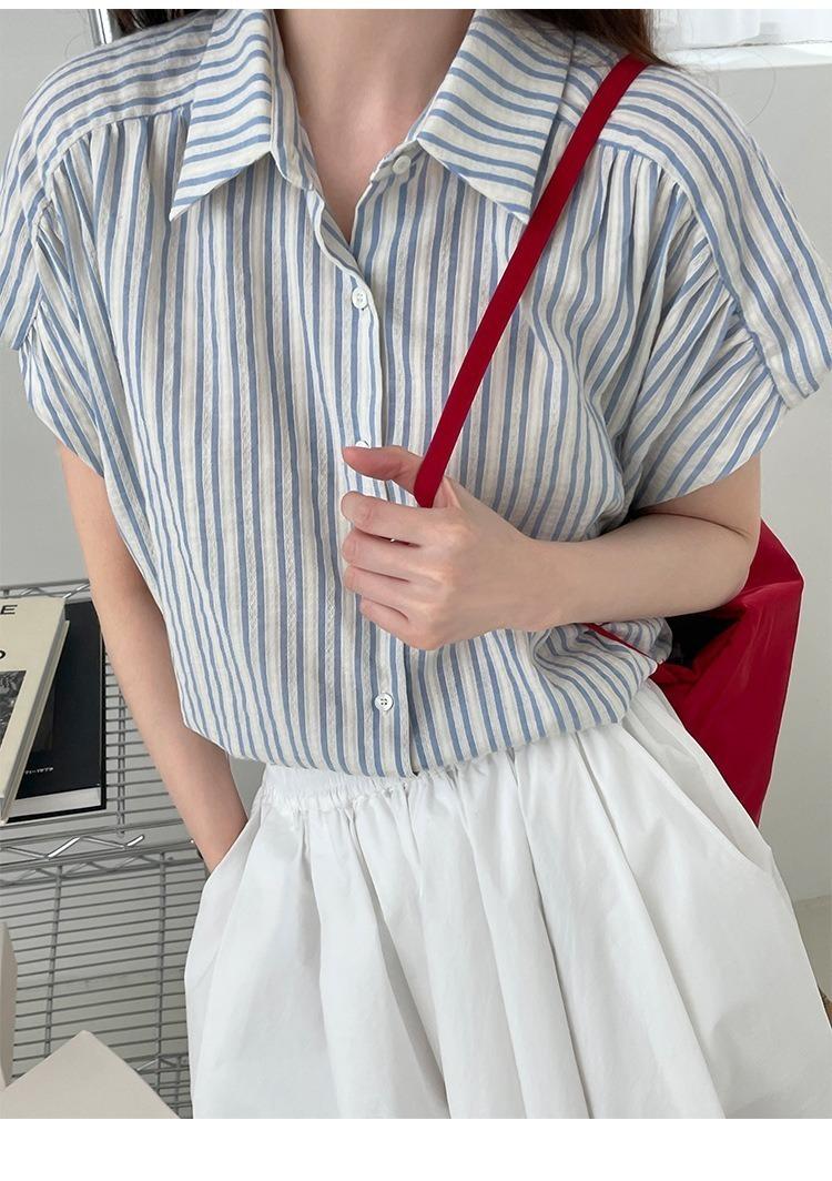 Camisa de manga corta a rayas francesas para mujer, diseño de verano, camisa pequeña y elegante, top de manga corta con vuelo para mujer, verano