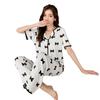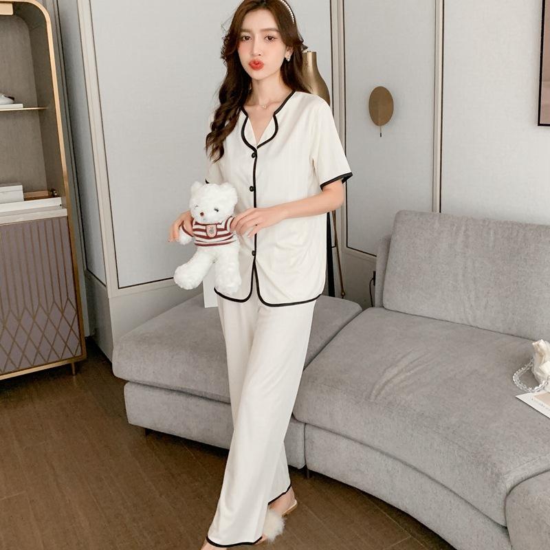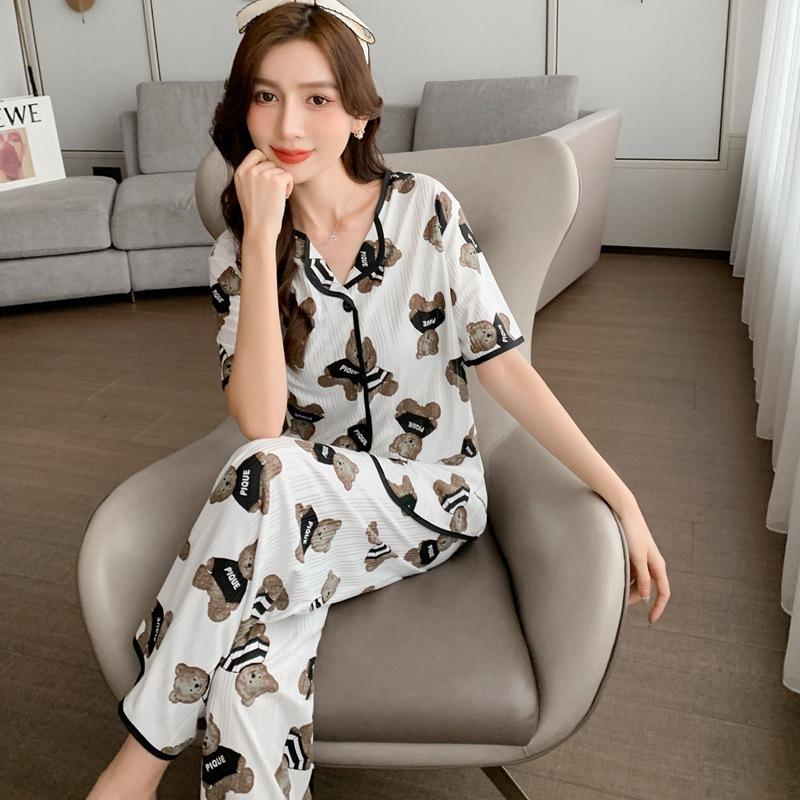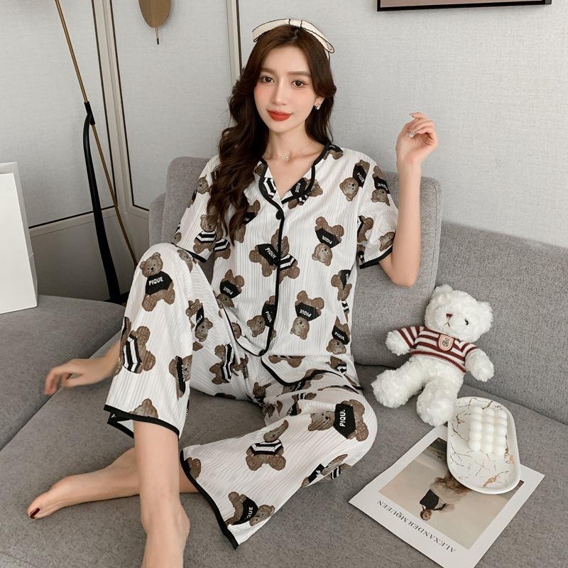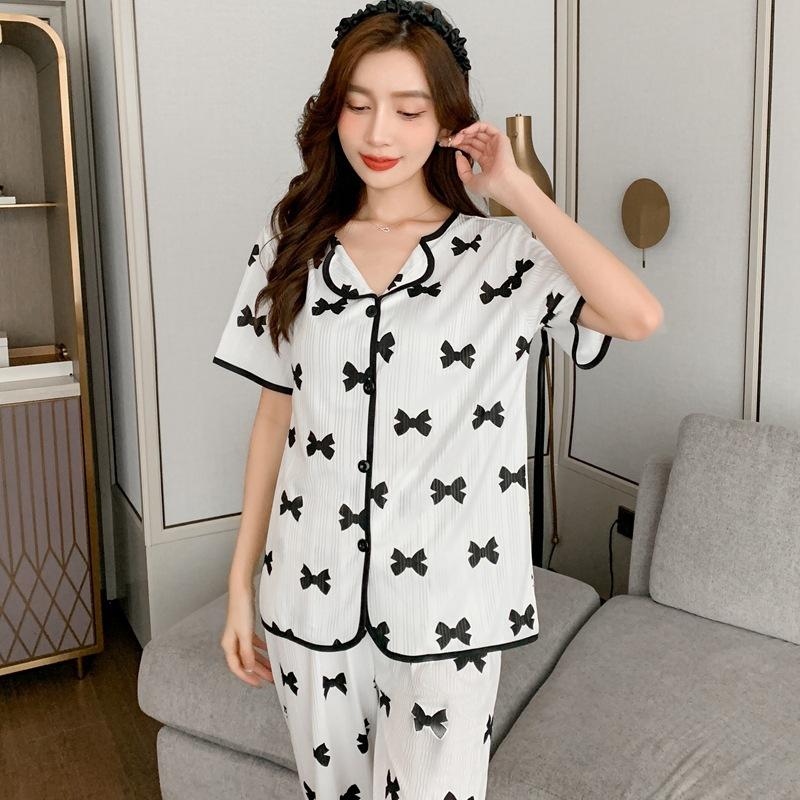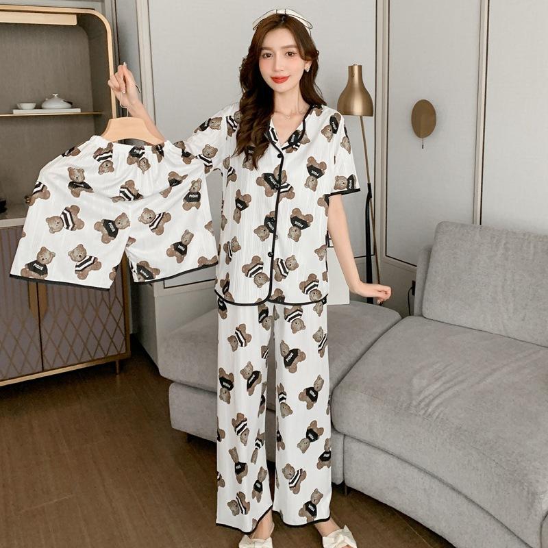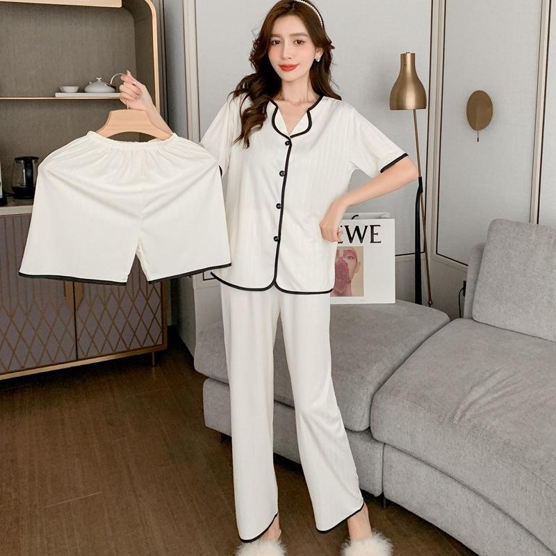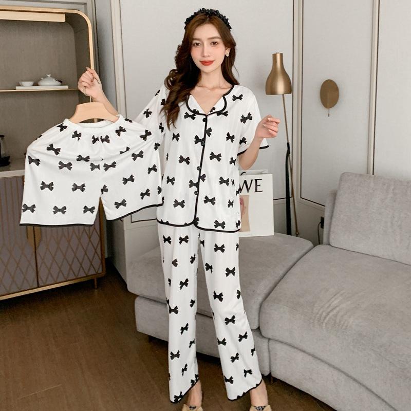 Pijama de Lazo de Tres Piezas para Mujer Estilo Coreano Holgado Manga Corta Verano y Verano Celebridad de Internet Ropa para el Hogar