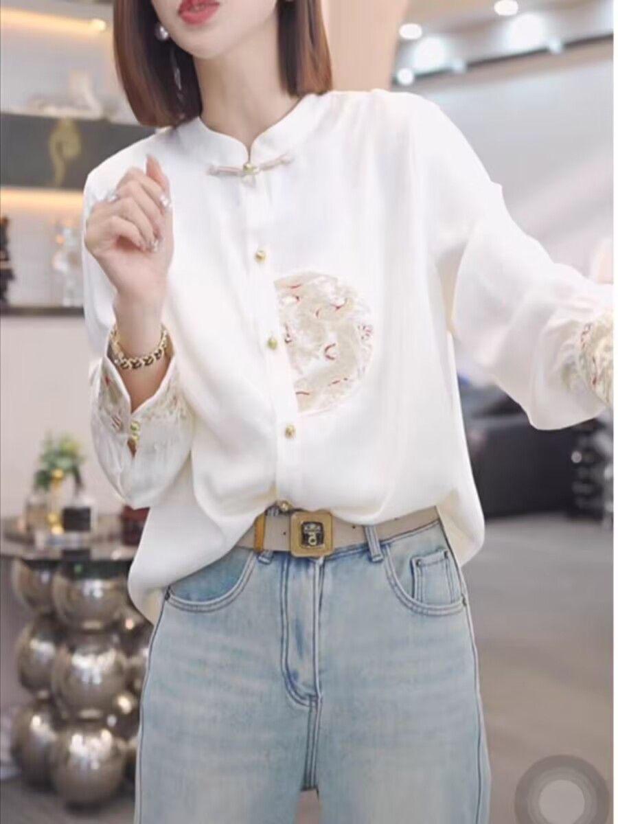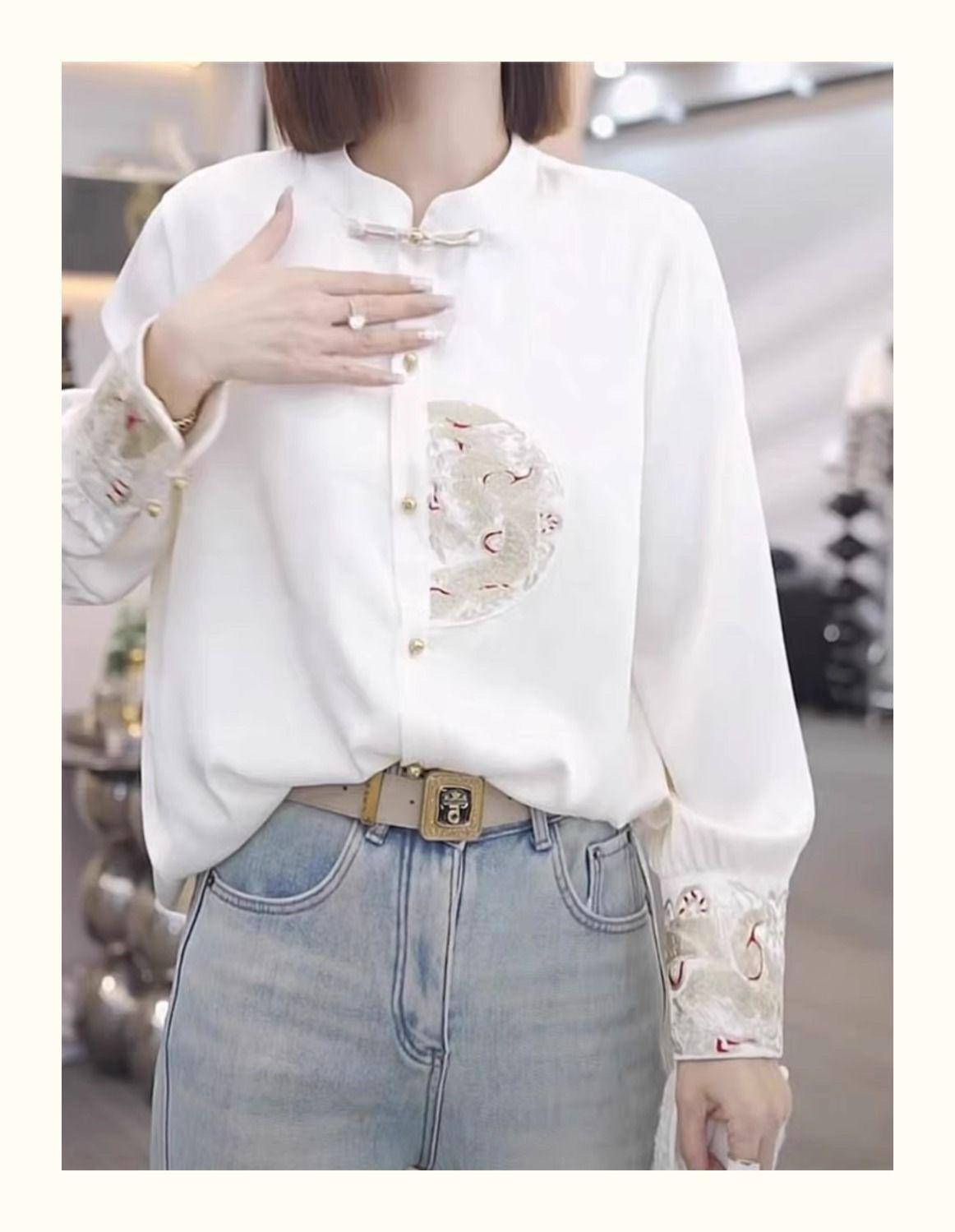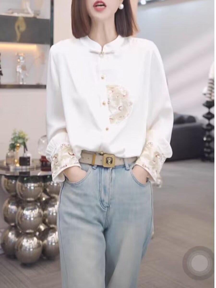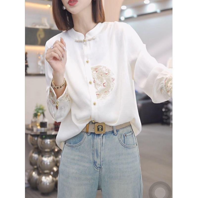 Camisa con botones estilo nacional chino para mujer, primavera y otoño 2024, nueva camisa blanca bordada de manga larga blanca