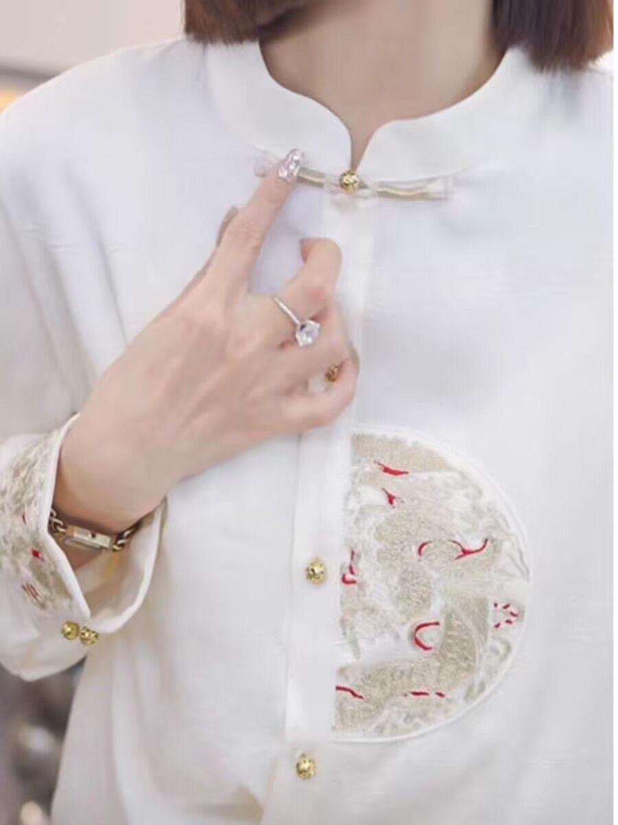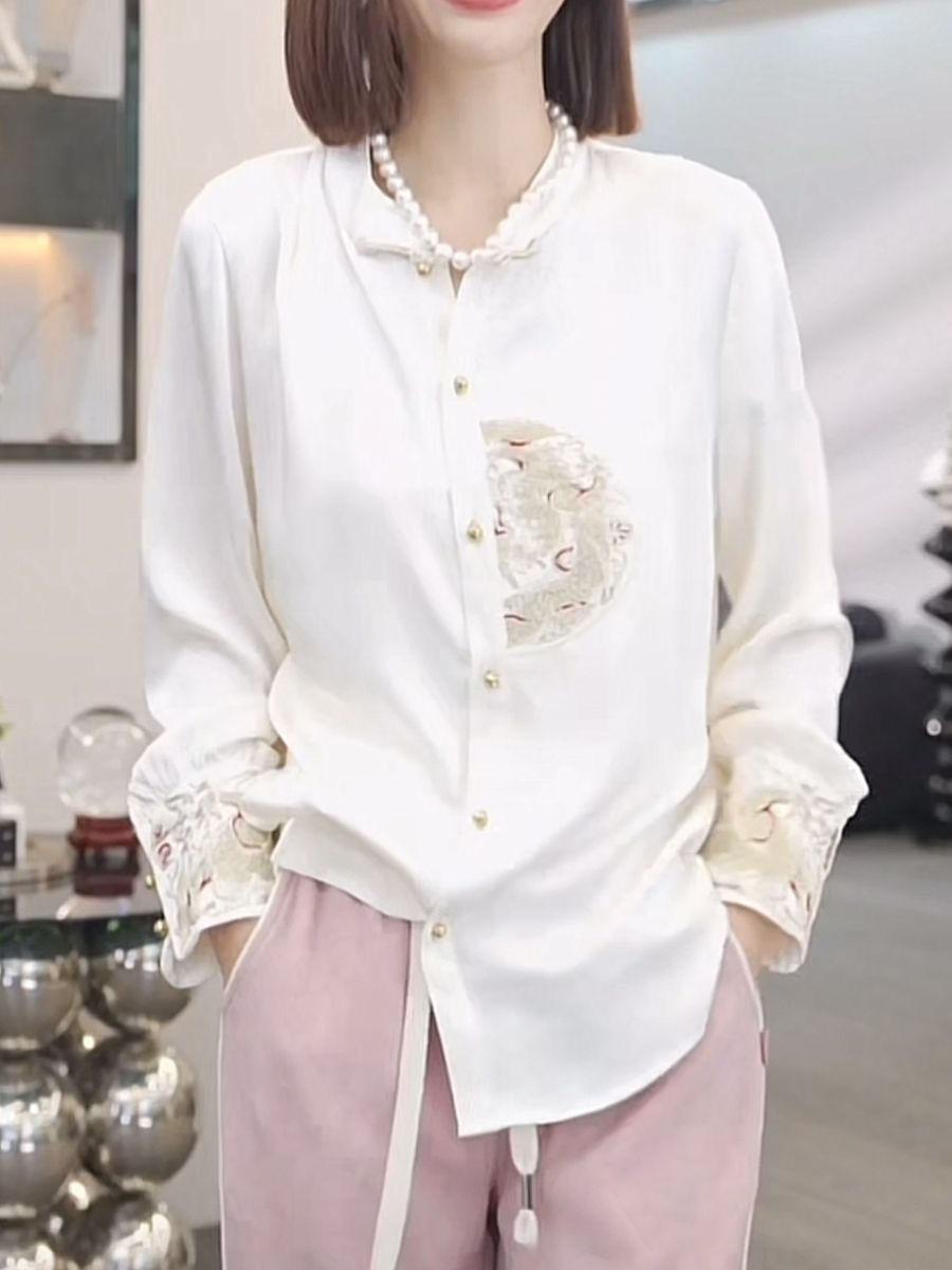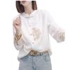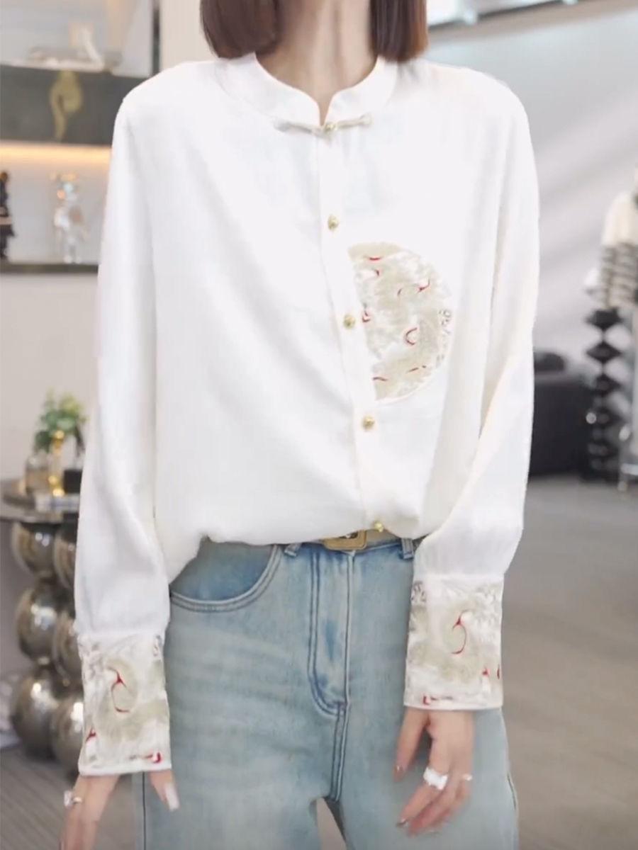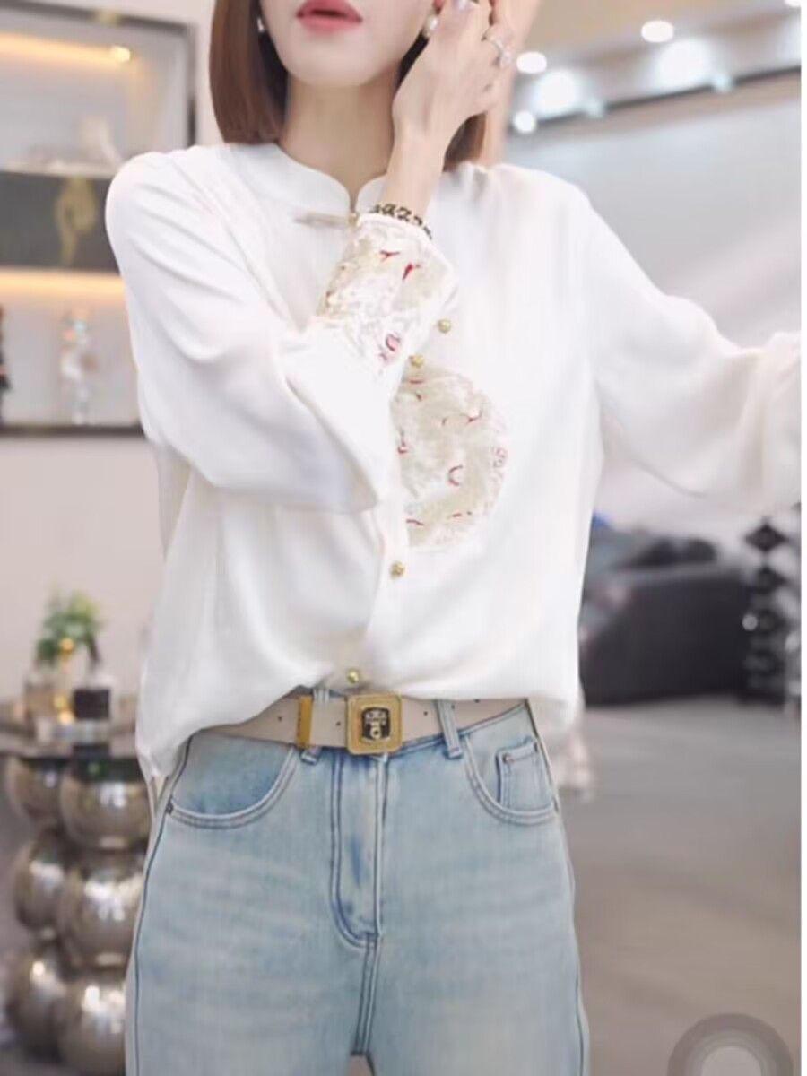 Camisa con botones estilo nacional chino para mujer, primavera y otoño 2024, nueva camisa blanca bordada de manga larga blanca
