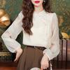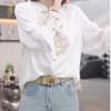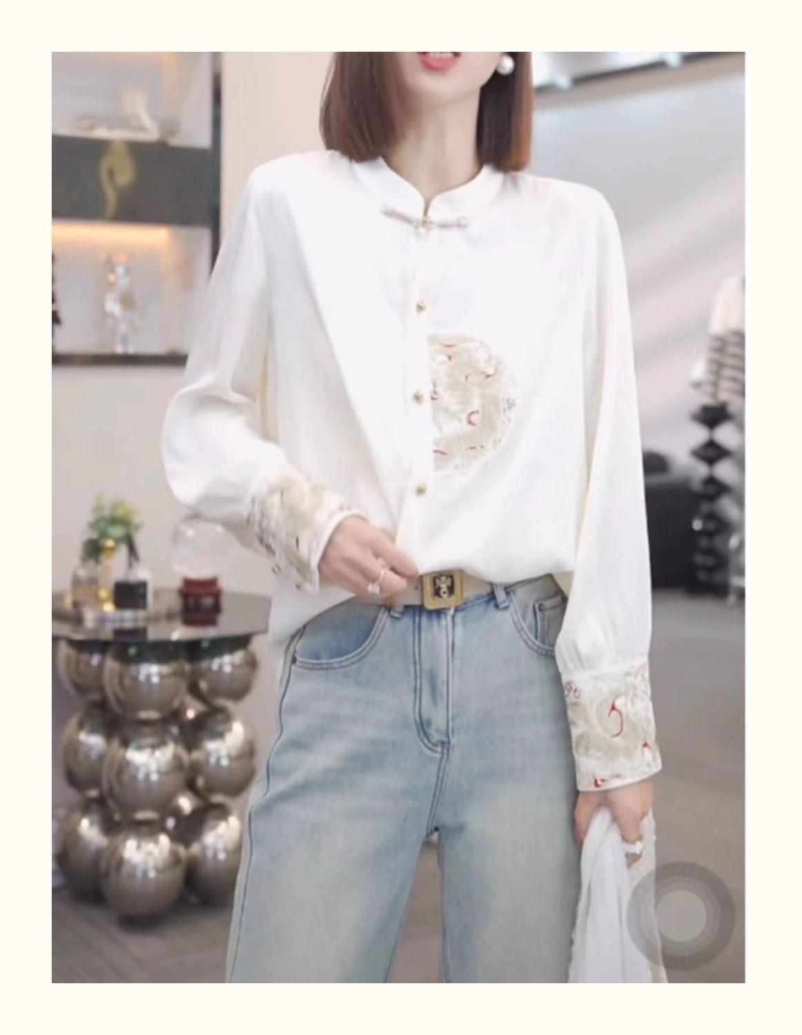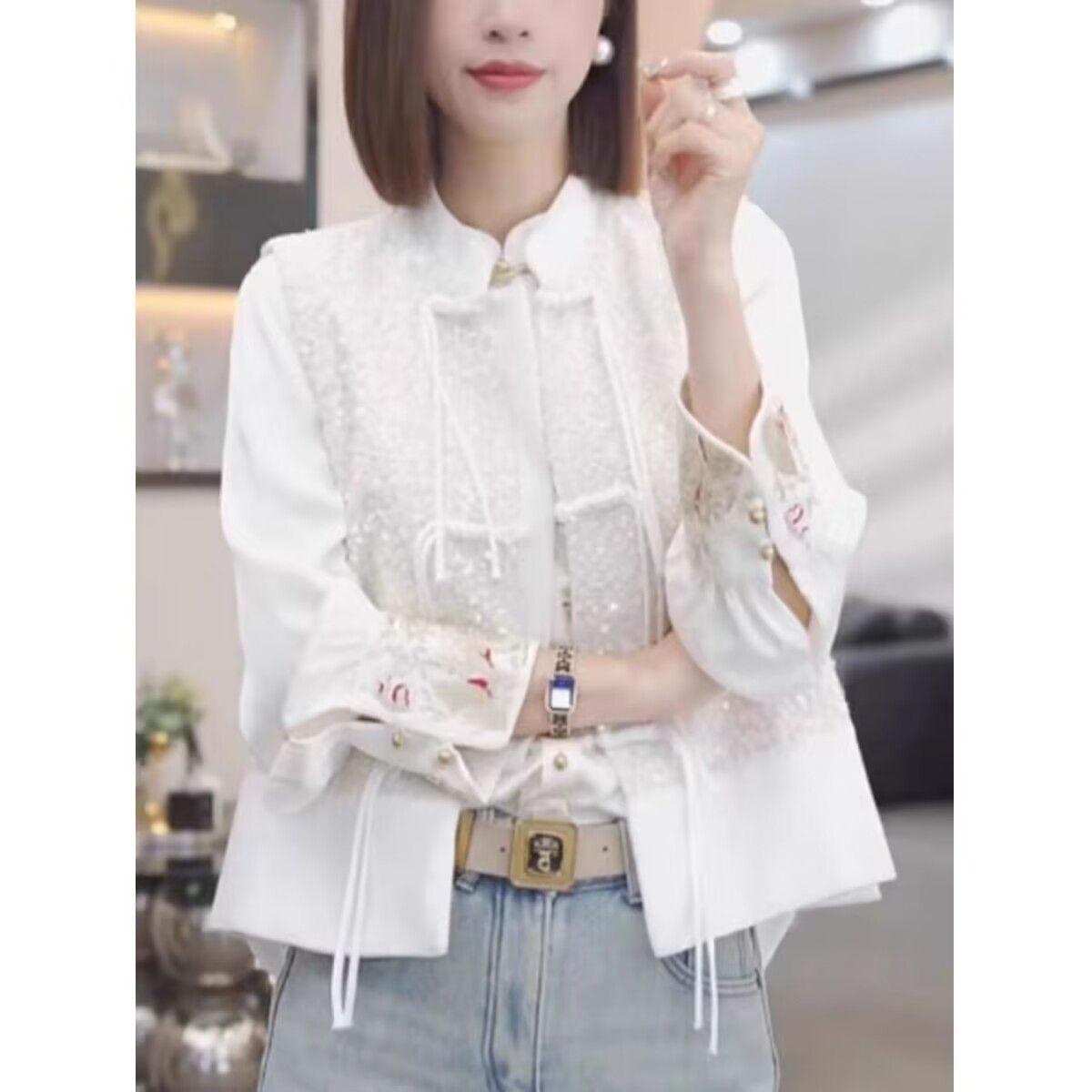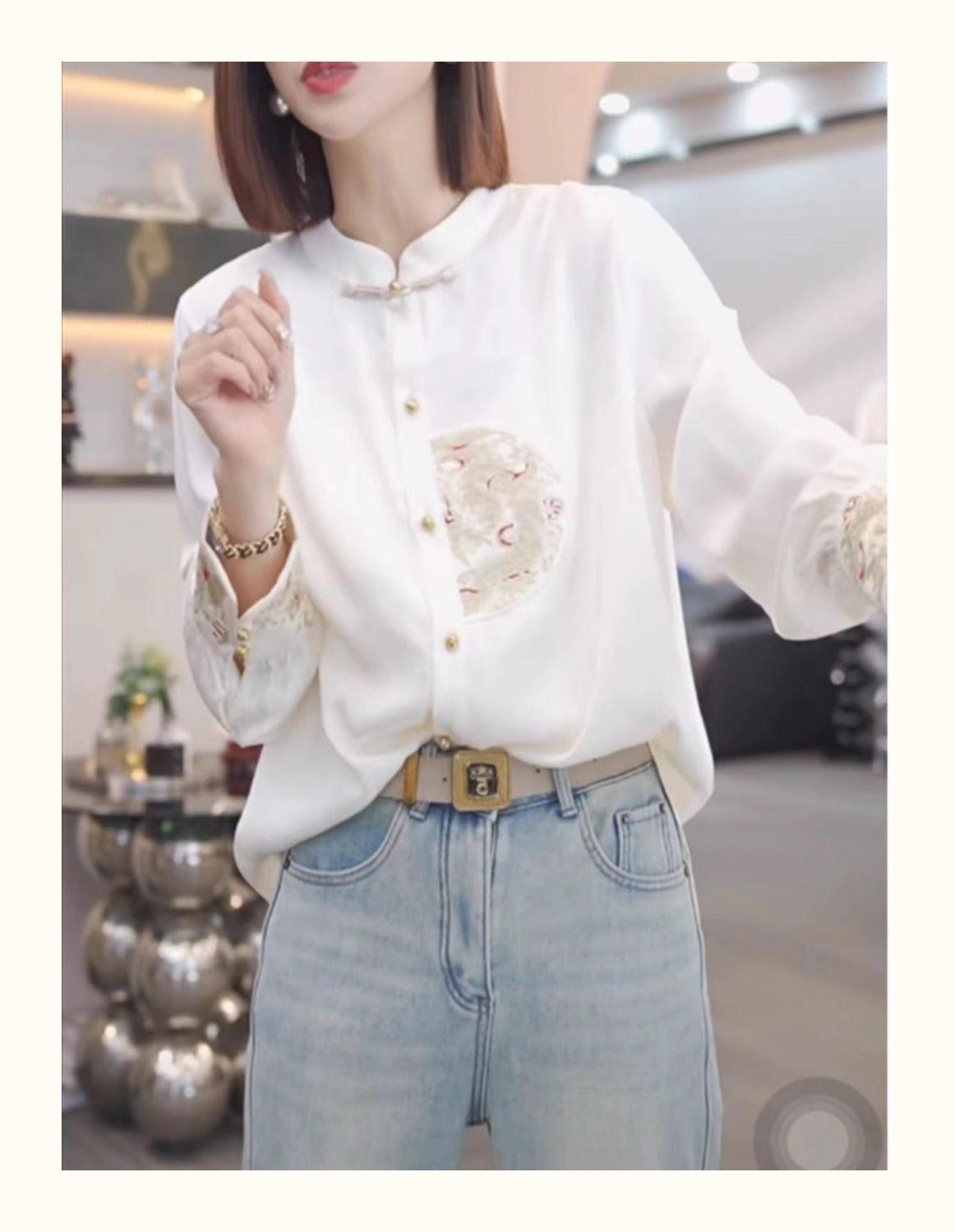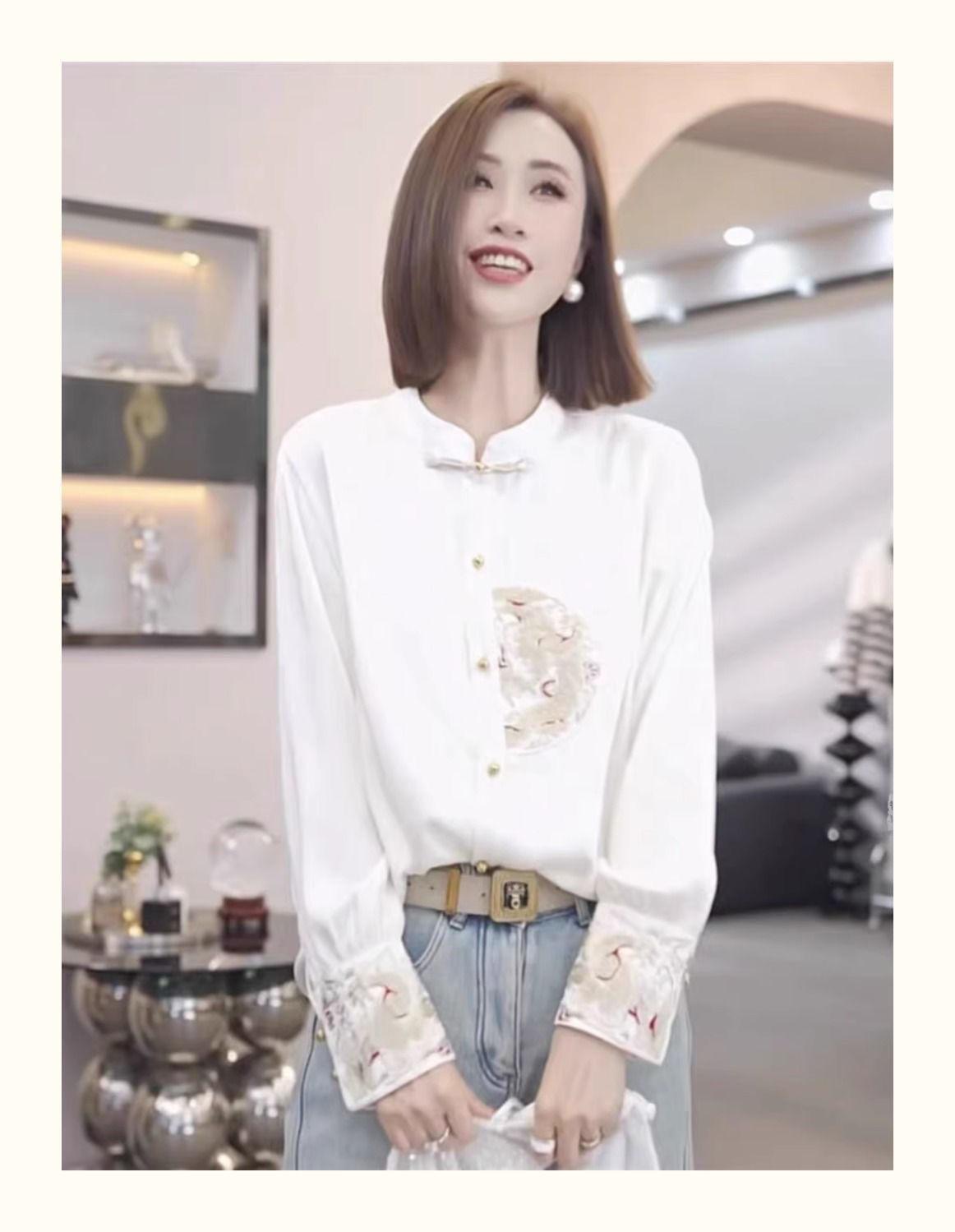 Camisa con botones estilo nacional chino para mujer, primavera y otoño 2024, nueva camisa blanca bordada de manga larga blanca