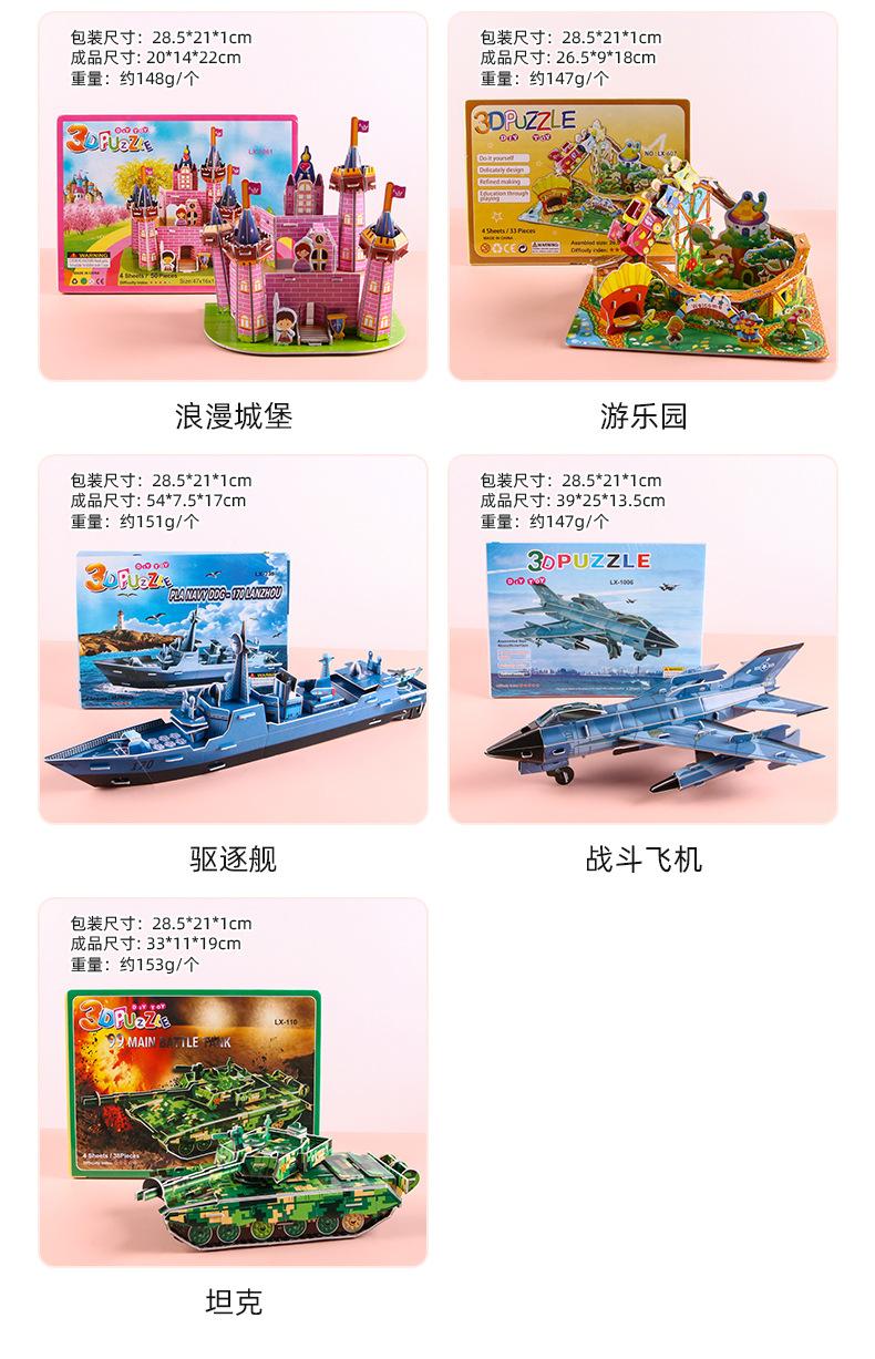 Fighter aircraft, Ice castle, Dinosaur forest, Full house, Lavender house, Romantic castle, Amusement park, Destroyer, Tank