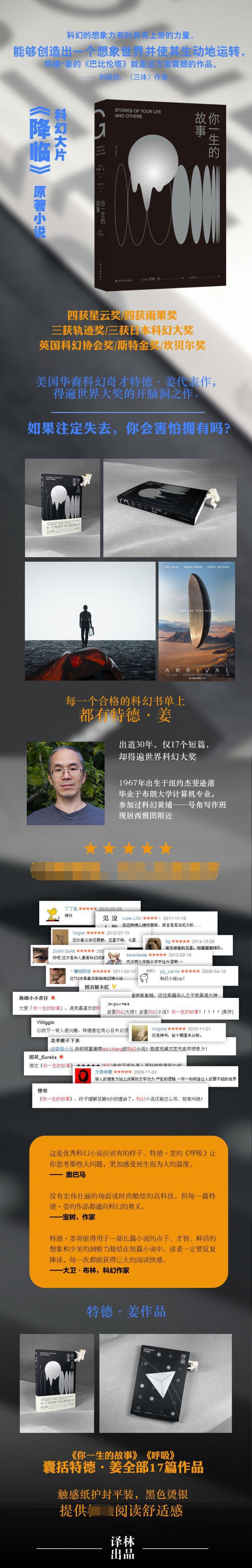 "La historia de tu vida" reúne ocho de las primeras obras de Ted Chiang: "La historia de tu vida", la novela original de la película "La llegada", su novela debut "La torre de Babilonia", así como "Realización", "División por cero", "Setenta y dos letras", "La evolución de la ciencia humana", "El infierno es la ausencia de Dios" y "Fiesta para los ojos": una lingüista aprende una lengua alienígena y cambia su visión del mundo.