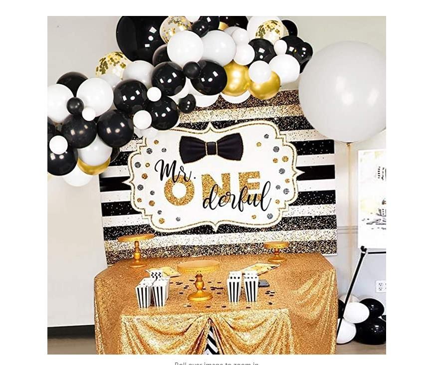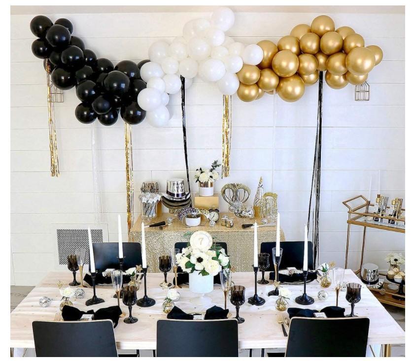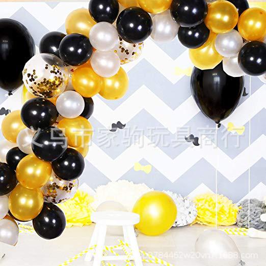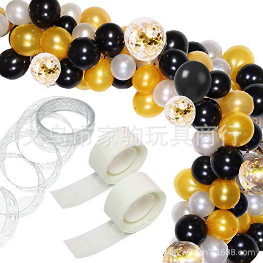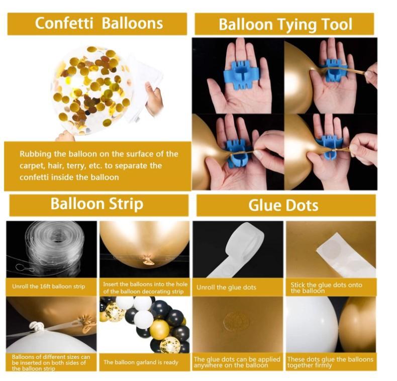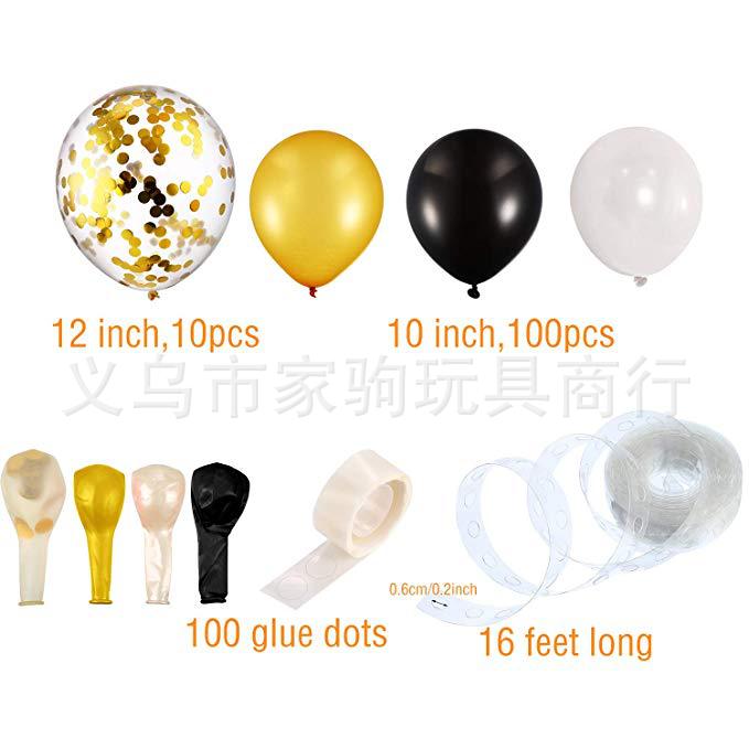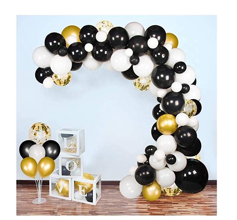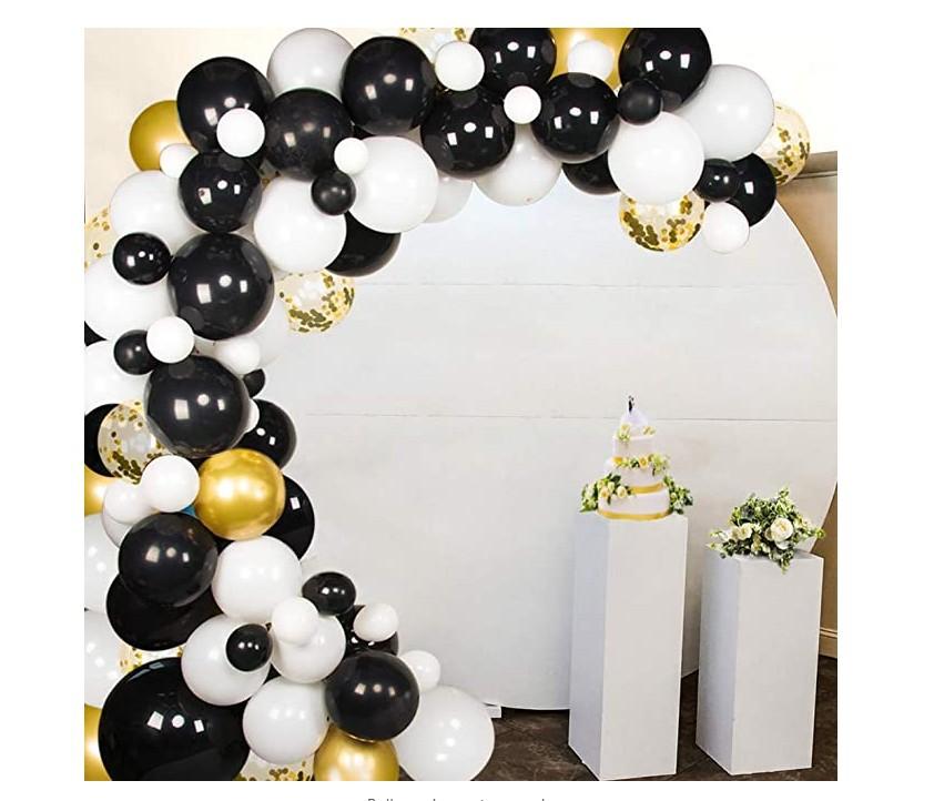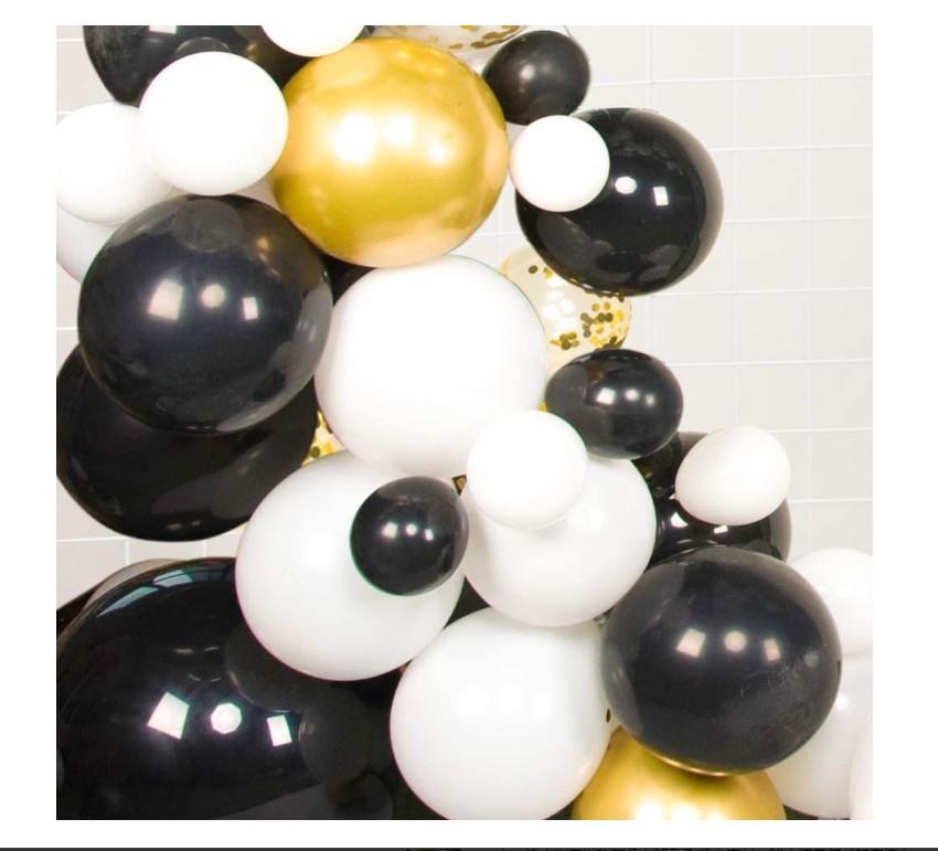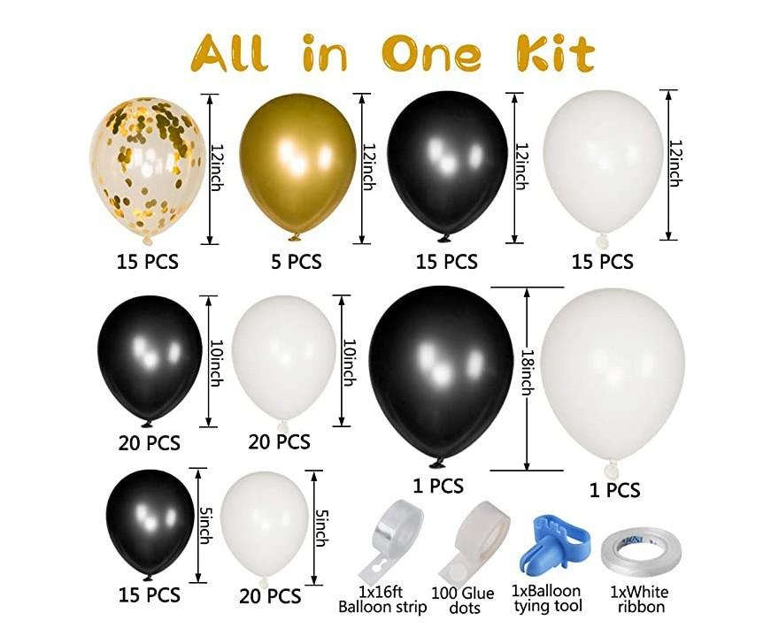 2 piezas de globos negros de 18" 2 piezas de globos blancos de 18" 40 piezas de globos blancos de 12" 40 piezas de globos negros de 12" 10 piezas de globos dorados metálicos de 12" 10 piezas de globos negros de 5" 20 piezas de globos blancos de 5" 10 piezas de globos dorados metálicos de 5" Tiras decorativas para globos (16 pies con 410 agujeros) 16 pies (aproximadamente 4.9 metros) de cinta