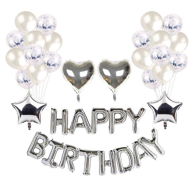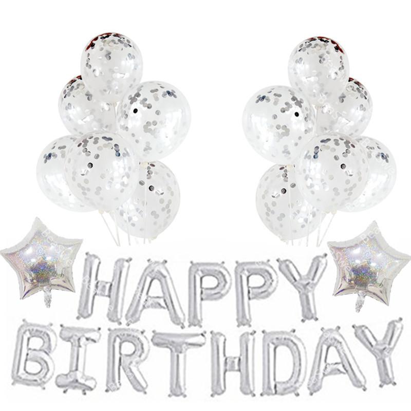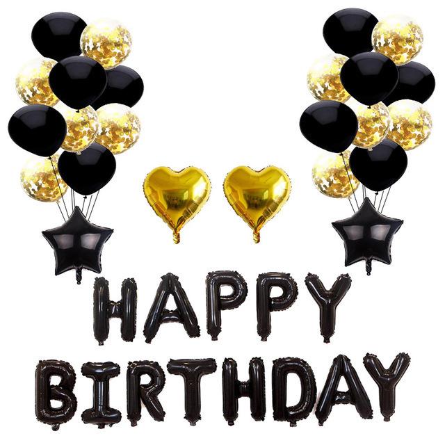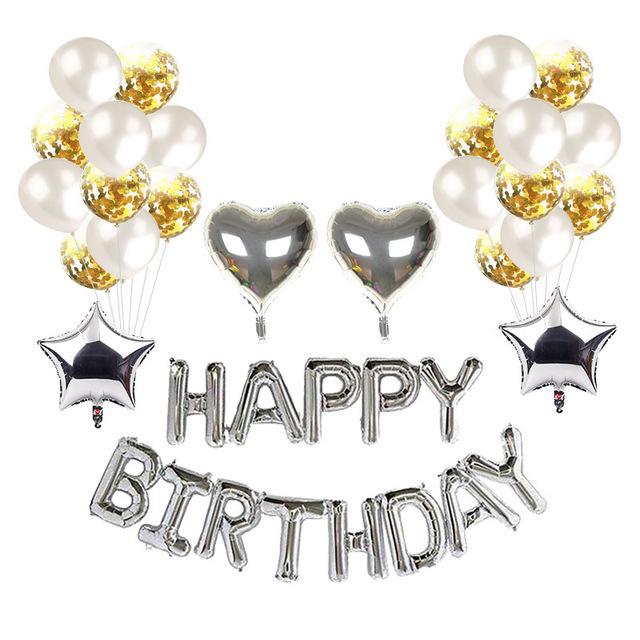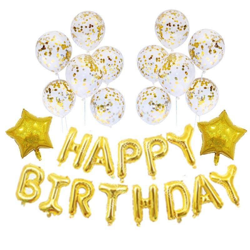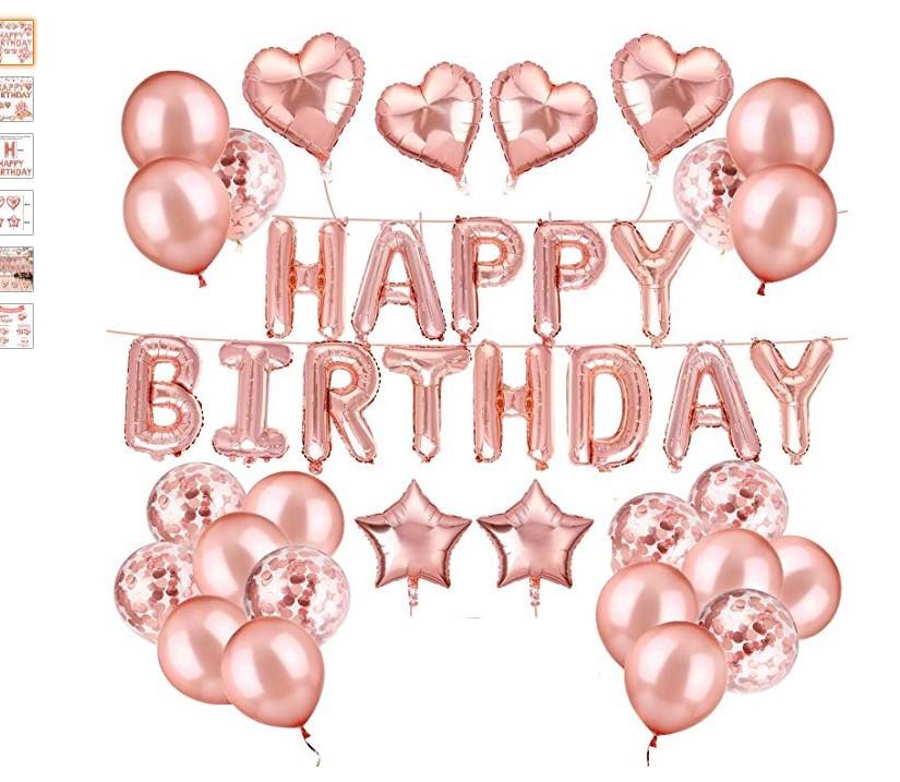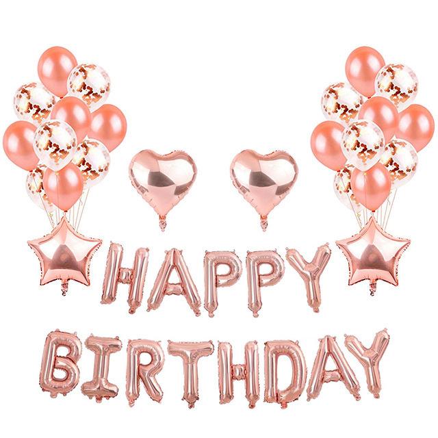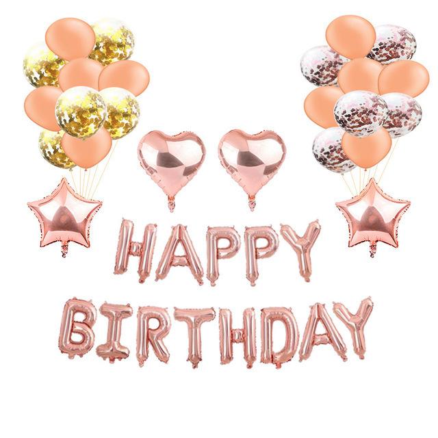 Embalaje: juego de letras de cumpleaños de 16 pulgadas + 4 estrellas de cinco puntas de 18 pulgadas + 10 látex de oro rosa de 12 pulgadas + 12 lentejuelas de oro rosa de 12 pulgadas + una pequeña cinta (Dorado o color aleatorio)