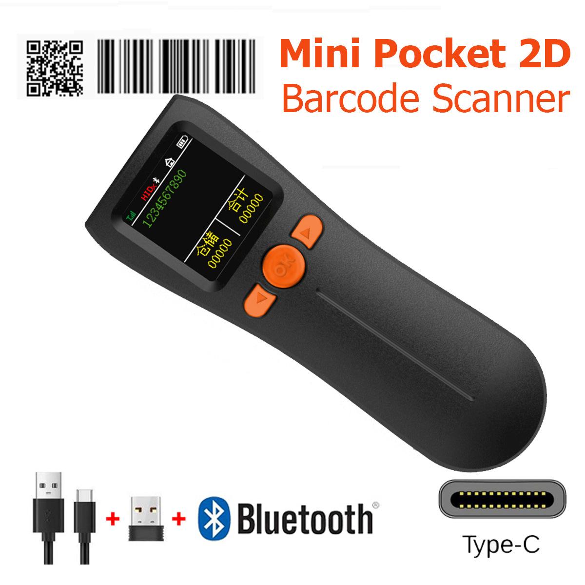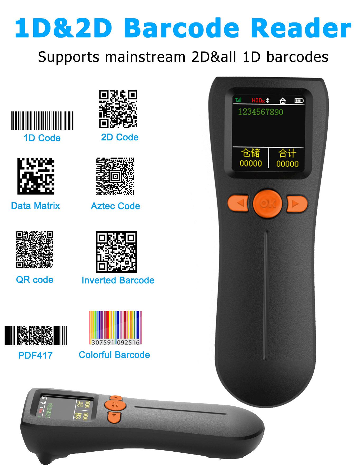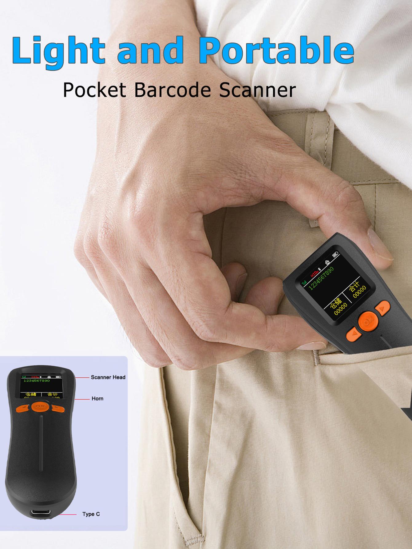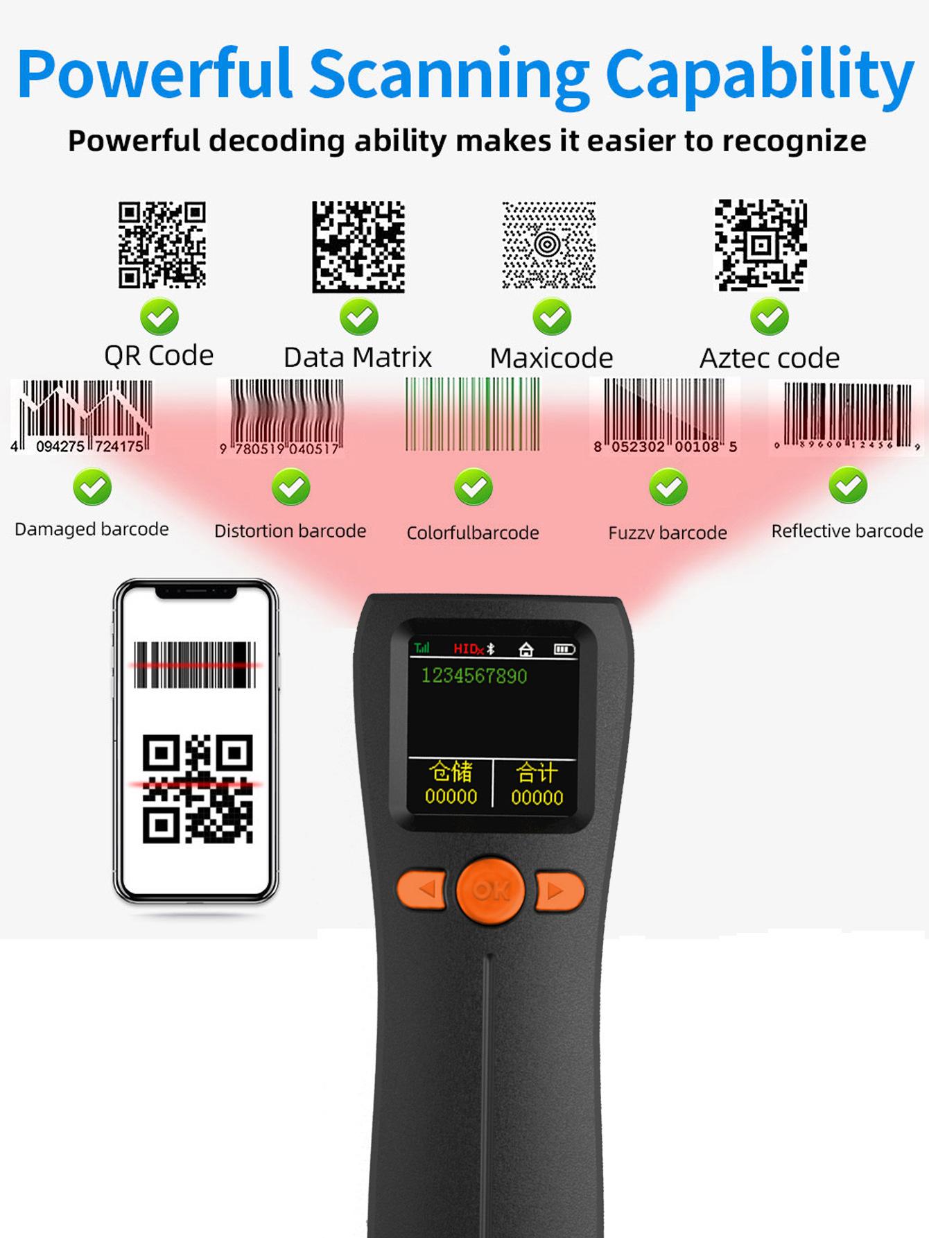 Escáner mini bluetooth portátil 1D código QR escáner de código de barras inalámbrico con pantalla grande, almacenamiento, inventario y otros modos