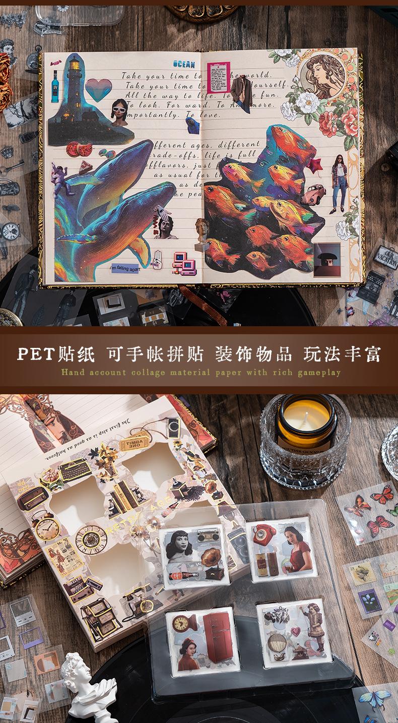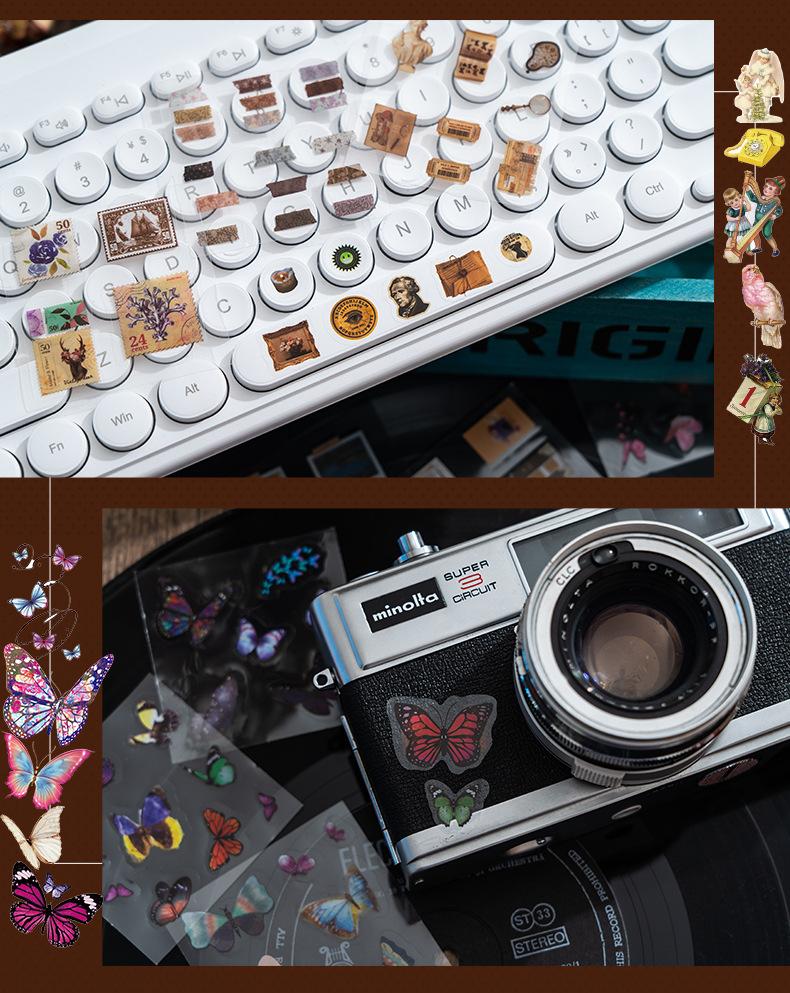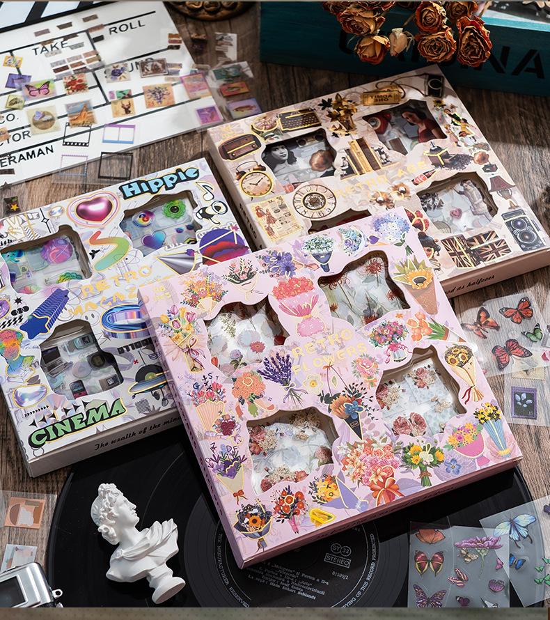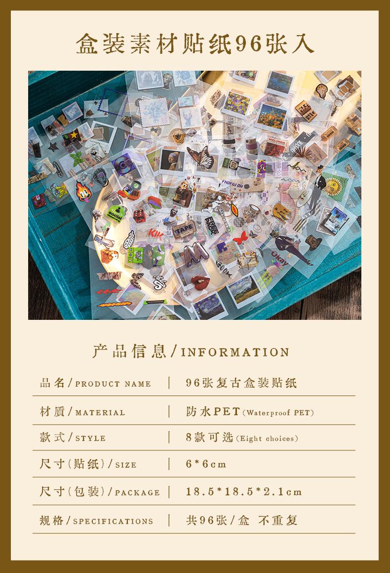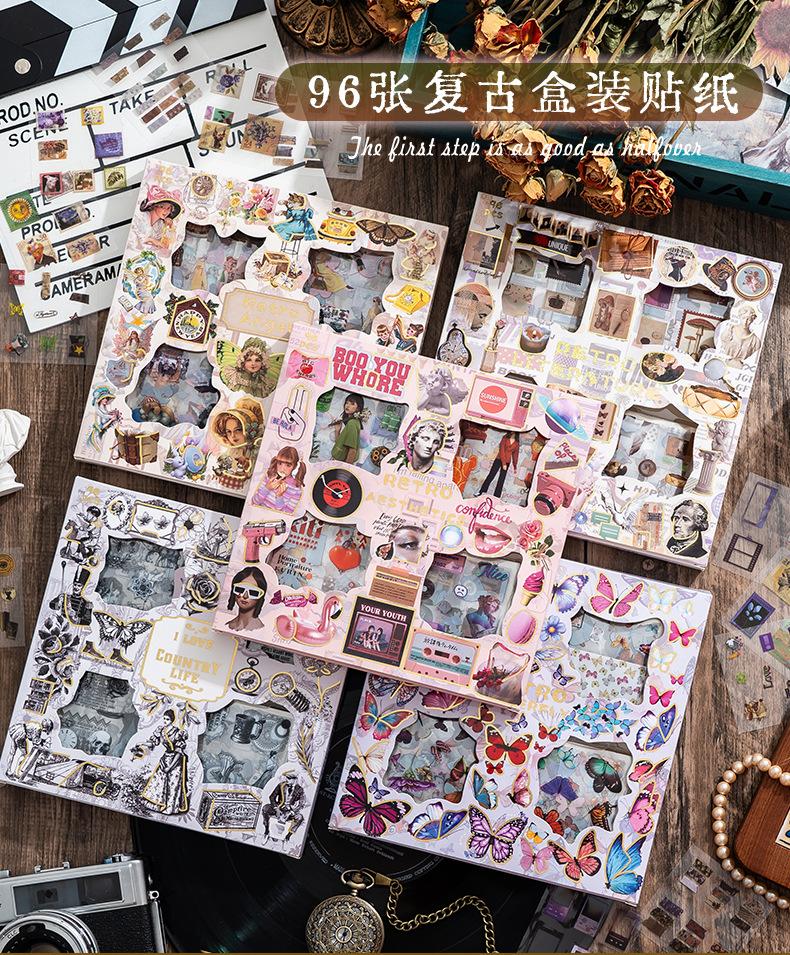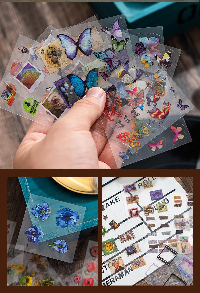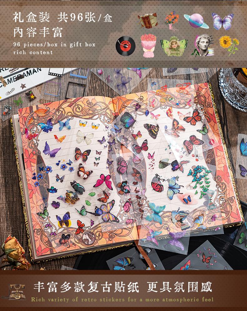 Calcomanías en caja 96 autoadhesivas impermeables ins retro mariposa planta material para cuenta de mano collage diy calcomanías decorativas