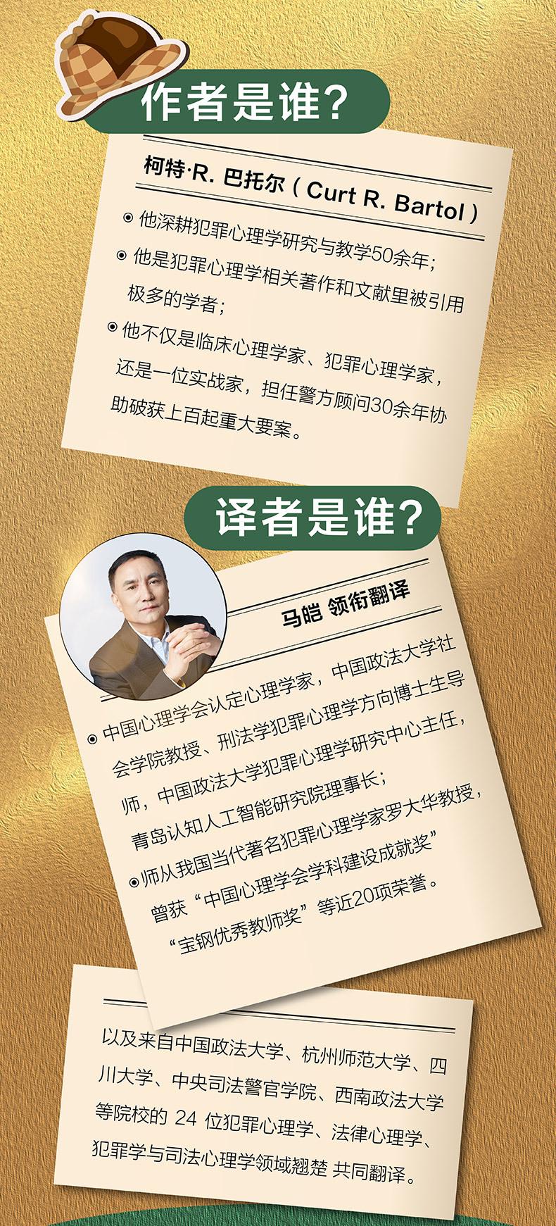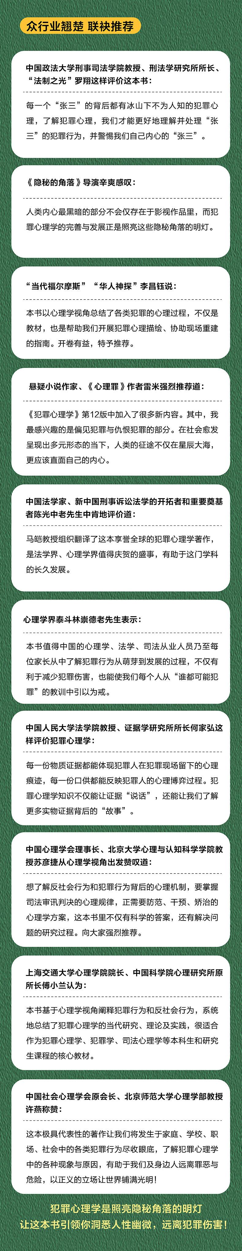 1. Autor: Curt Bartol, un importante contribuyente a la psicología criminal contemporánea, ha estado profundamente involucrado en la investigación y la enseñanza durante más de 70 años, y ha dedicado 40 años a pulir la 12ª revisión importante de "Psicología Criminal". 2. Traductor: La profesora Ma Ai de Psicología Criminal en la Universidad de Ciencias Políticas y Derecho de China organizó la traducción. El equipo de traducción está compuesto por 24 psicólogos en los campos de la psicología criminal, la psicología legal, la criminología y la psicología judicial de la Universidad de Ciencias Políticas y Derecho de China, la Universidad Normal de Hangzhou, la Universidad de Sichuan, la Escuela Central de Policía Judicial, la Universidad del Suroeste de Ciencias Políticas y Derecho y otras instituciones. El profesionalismo del contenido está garantizado. 3. El equipo de revisión es sólido: el profesor Zhang Qing, Decano de la Escuela de Lenguas Extranjeras de la Universidad de Ciencias Políticas y Derecho de China, y el psicólogo criminal Dr. Lin Zhenlin organizaron la revisión. El profesionalismo y la precisión del lenguaje están garantizados. 4. Una alineación de libros recomendados de peso pesado, académicos legales chinos, etc.