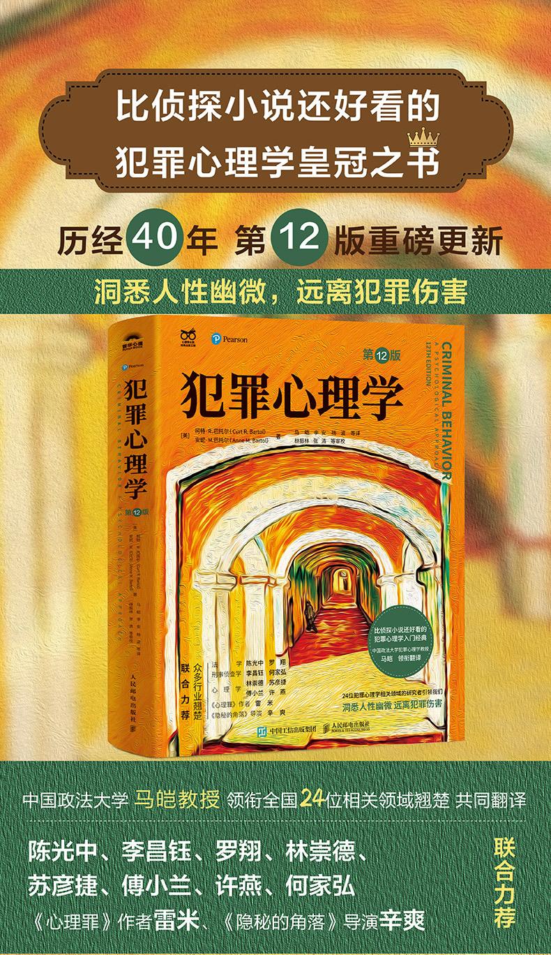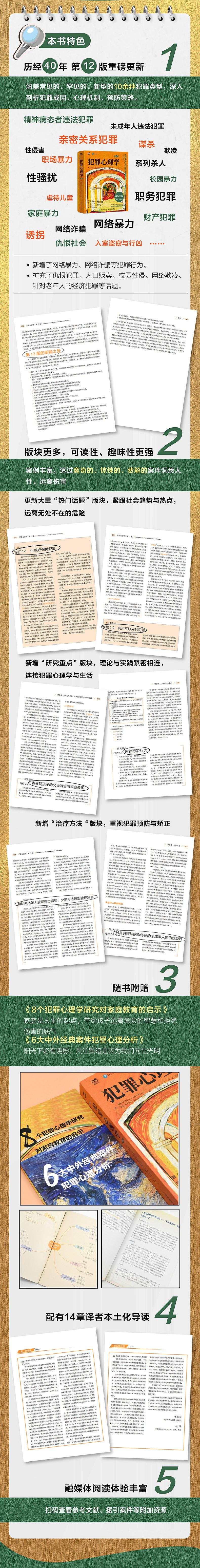 La 12ª edición de "Psicología Criminal" se centra en la conducta criminal y antisocial desde una perspectiva psicológica, e integra de manera exhaustiva y precisa la investigación, la teoría y la práctica contemporáneas de la psicología criminal. El contenido de este libro está organizado de lo general a lo específico. Primero define el delito y explica cómo medirlo. En segundo lugar, analiza los factores de riesgo y los factores situacionales en psicología, familia, entorno social, neurobiología, etc. que inducen la conducta ilegal y criminal, así como los factores protectores que impiden que los individuos tomen el camino del delito, y se centra en la agresión y la violencia. Finalmente, la segunda mitad del libro analiza tipos específicos de delitos, como la delincuencia juvenil, el homicidio, la violencia en las relaciones íntimas y familiar, la violencia escolar y laboral, la agresión sexual, los delitos ocupacionales, la ciberdelincuencia, etc. Hay formas de delito comunes y raras, y análisis en profundidad de varios tipos de delincuentes.