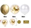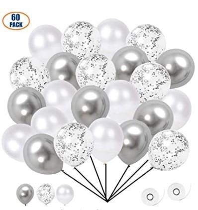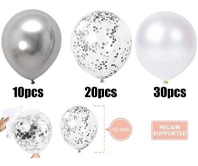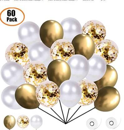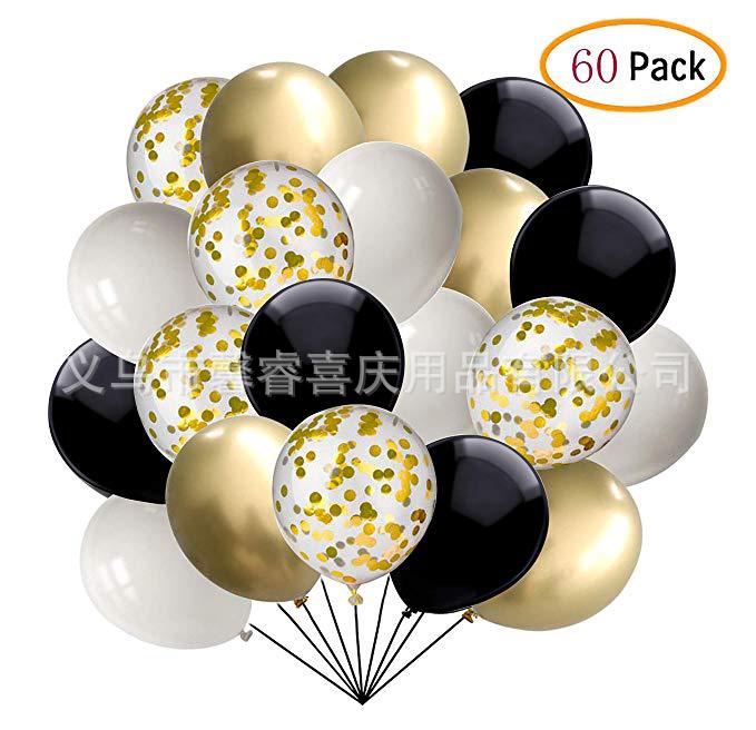 Un set incluye: globos de látex de 2.8g, 15 blancos, 15 negros, 15 dorados metálicos y 15 globos con lentejuelas doradas.