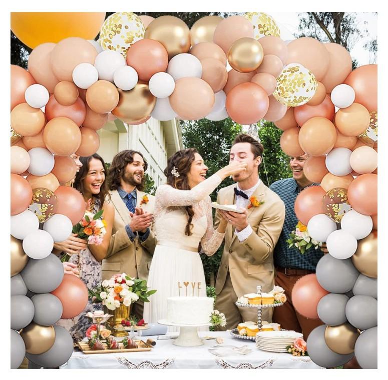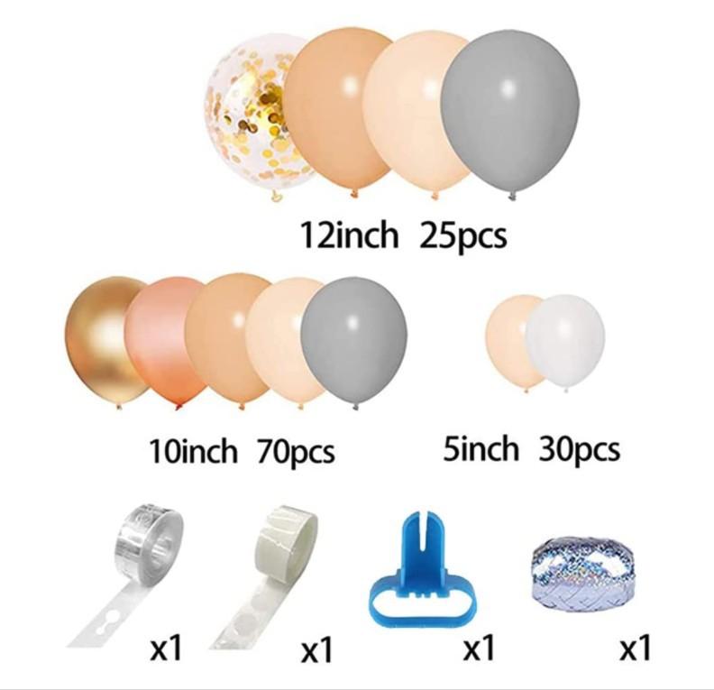 Kit de arco de guirnalda de globos: 5 pulgadas en total,30Pieza, 10 pulgadas, color rosa15piezas, total 10 pulgadas, globo metálico dorado10piezas, 12 pulgadas, lentejuelas transparentes de oro rosa10Piezas, 12 pulgadas, naranja/blanco15individuo30Globos de confeti dorado de 5 cm10piezas, herramienta para atar, cinta plateada, una cadena para globos de 16,5" y un rollo de 100 puntas para globos.