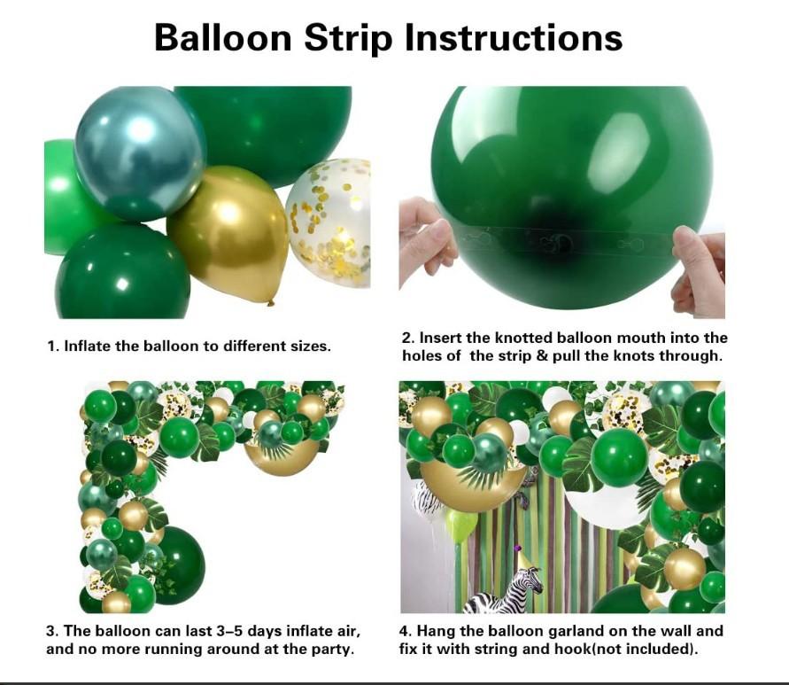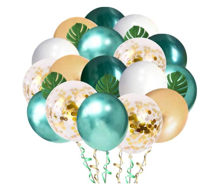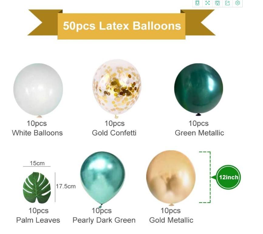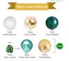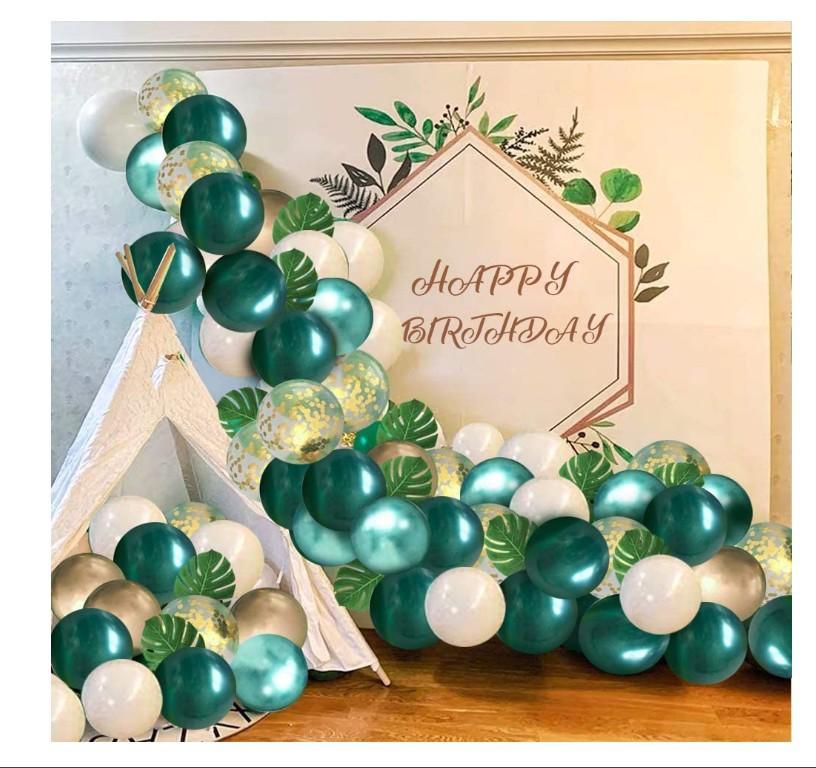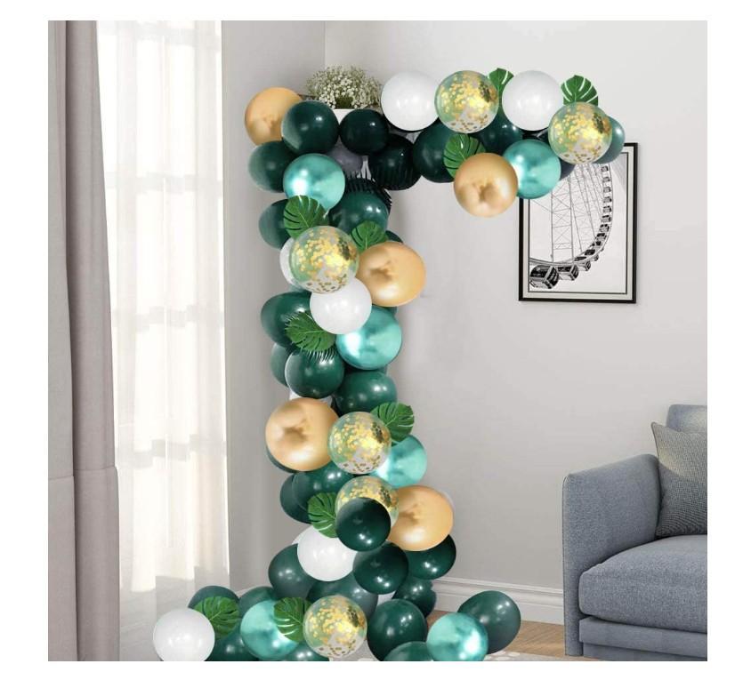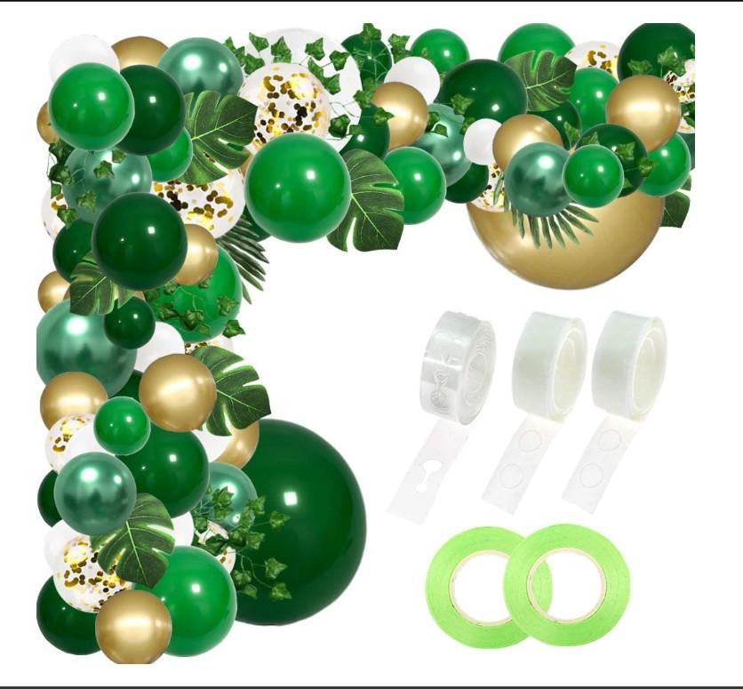 100 piezas - incluye 58 globos de 10 pulgadas - incluye 16 blancos, 16 verde claro, 16 verde oscuro, 10 dorados metálicos, 30 globos de 5 pulgadas - incluye 10 blancos, 10 verde claro, 10 verde oscuro, 10 hojas de palma artificiales de 8 pulgadas, 1 guirnalda de globos, 1 cinta, 1 rollo de pegamento para globos