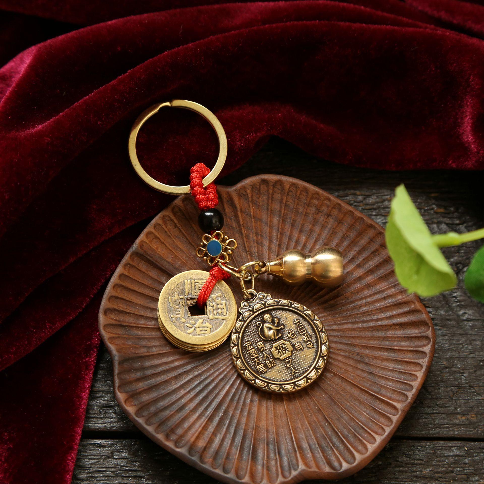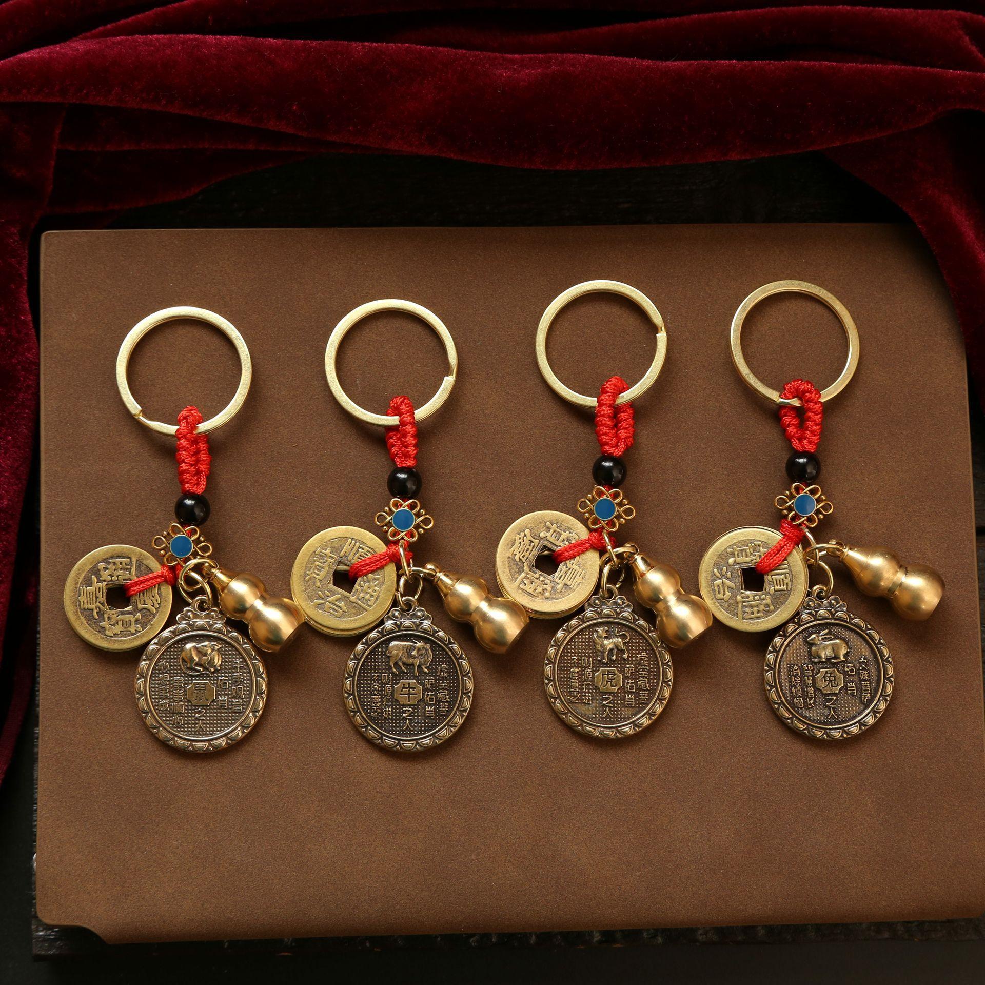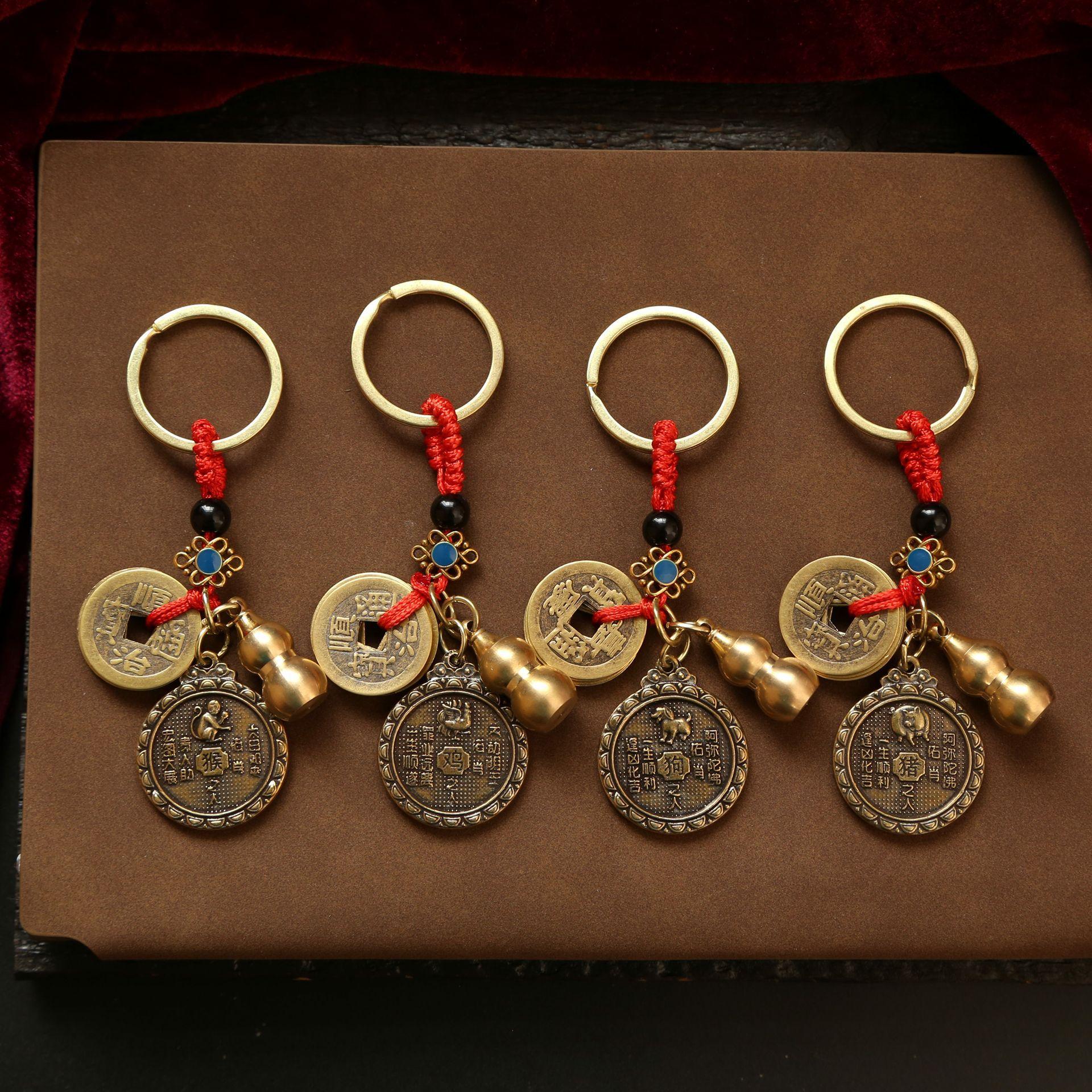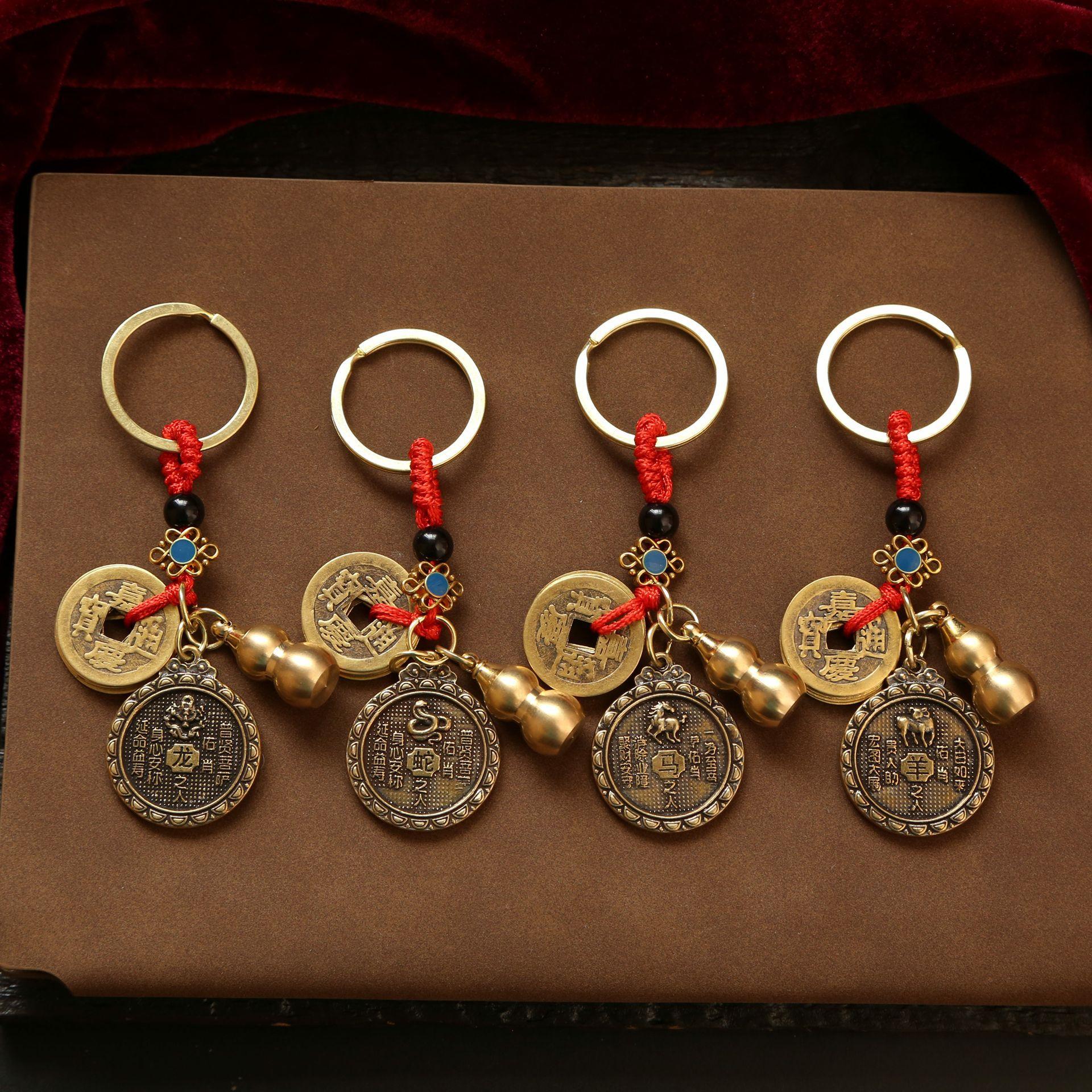 Compra Llavero con colgante de latón con doce signos del zodiaco, ocho guardianes, cuerda roja, cinco emperadores, dinero, llave de coche, bolso, colgante al por mayor en Joom.pro