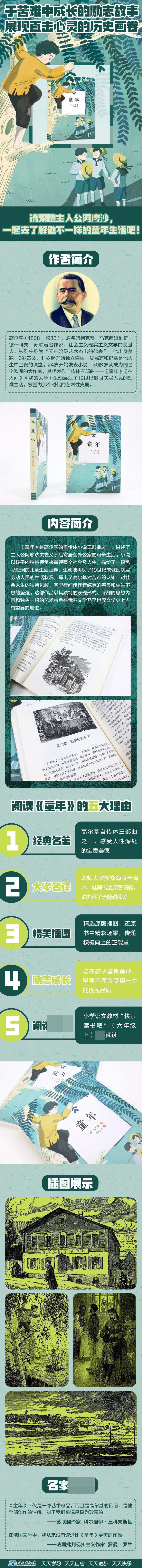 Infancia ha circulado durante mucho tiempo en traducciones chinas. Esta traducción fue publicada en 1995 y hasta ahora se han impreso y distribuido más de 300,000 copias. Esta vez, se reedita en forma de ilustraciones exquisitas, y algunas de las traducciones han sido retraducidas o revisadas. Creo que Gorki y su Infancia se convertirán en los eternos amigos cercanos de los adolescentes chinos.