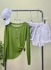 Camiseta fina de manga larga holgada informal de color caramelo con cuello redondo y protección solar para mujer, combina con todo, adelgazante, de color liso, con aire acondicionado.