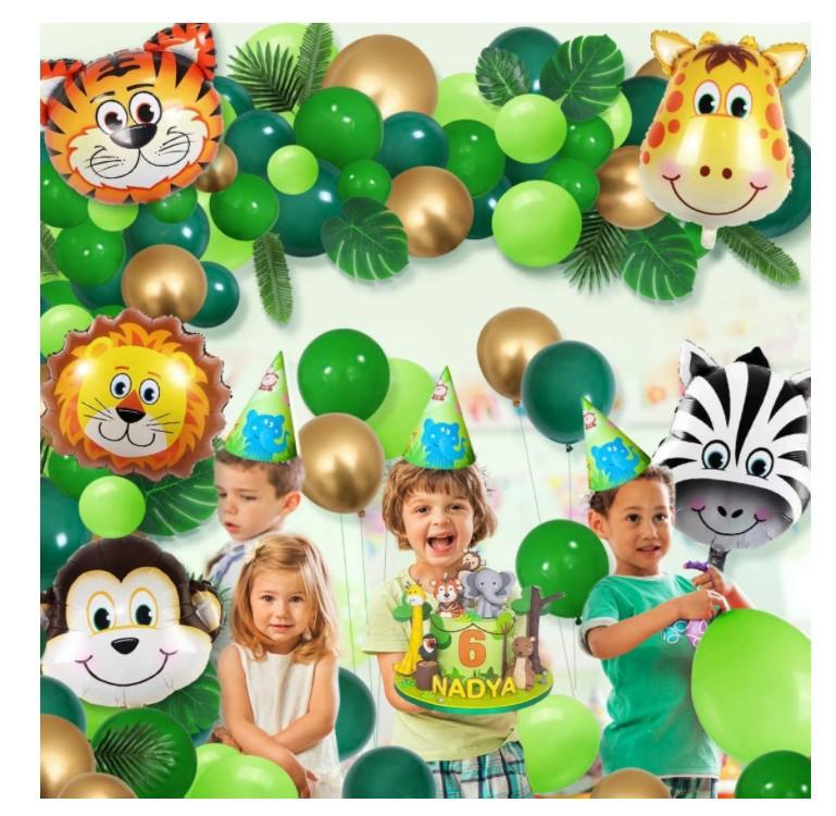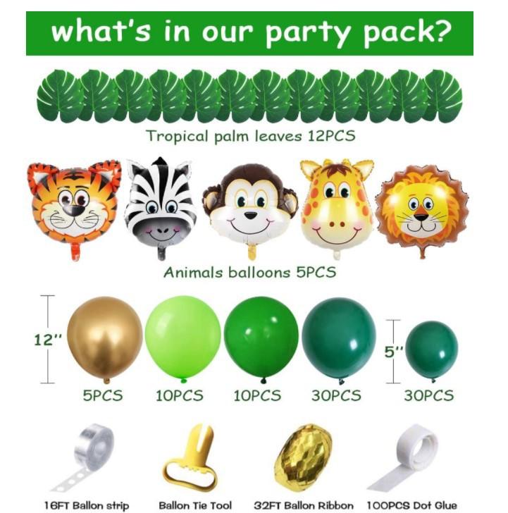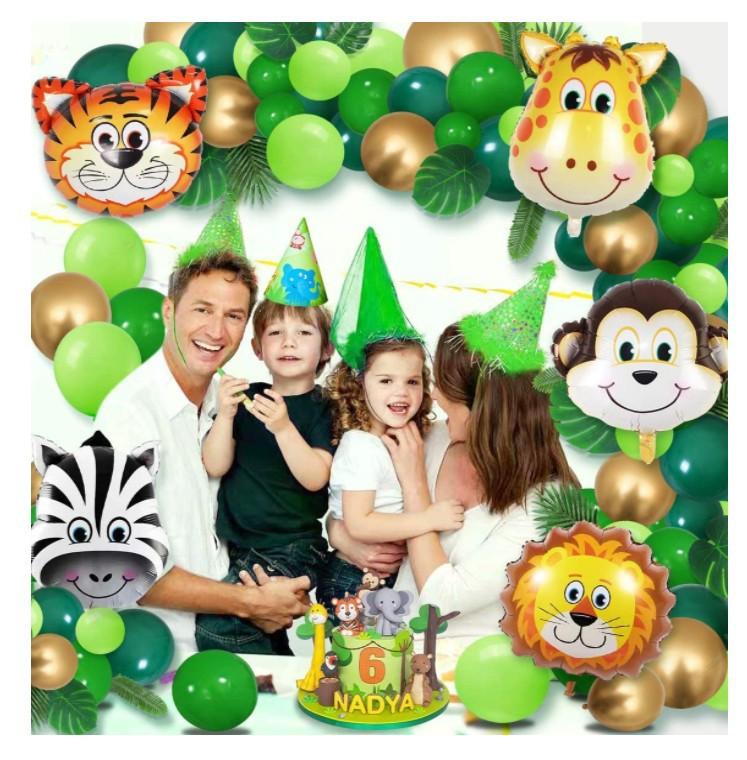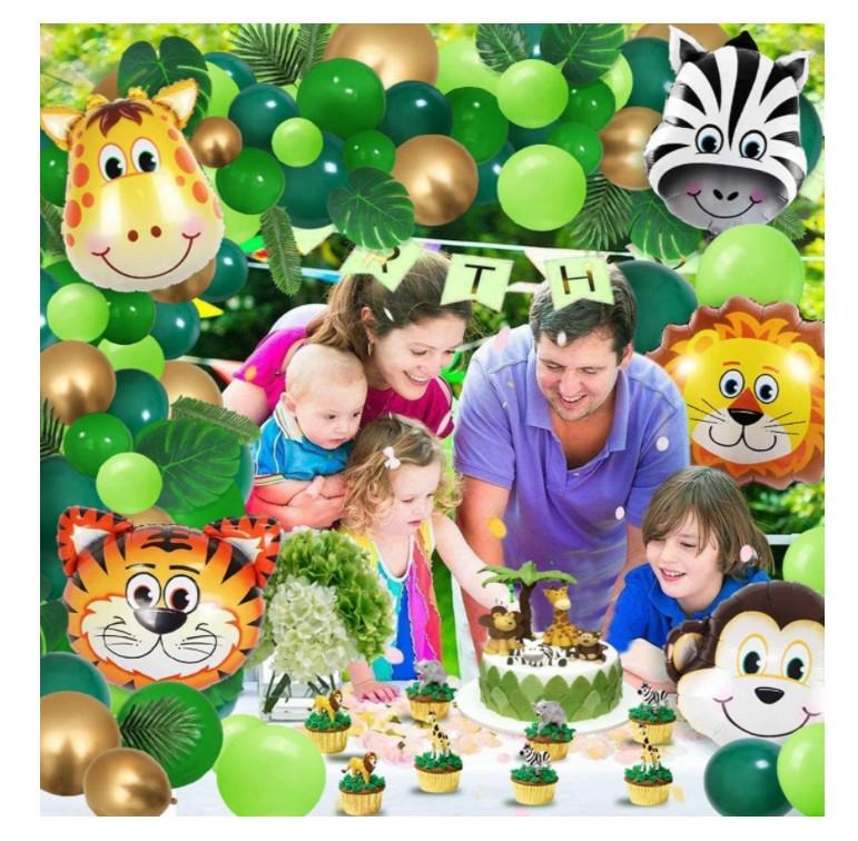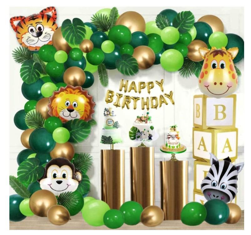 Una gran fiesta en la jungla está a punto de comenzar, por eso diseñamos nuestras decoraciones para fiestas en la jungla para que puedas celebrar tu fiesta de forma mágica y sin complicaciones. Con una combinación de globos de látex blanco y verde, globos dorados metalizados y hojas de palma, tendrás todo lo necesario para crear un look completo y fabuloso para tu fiesta en la jungla.