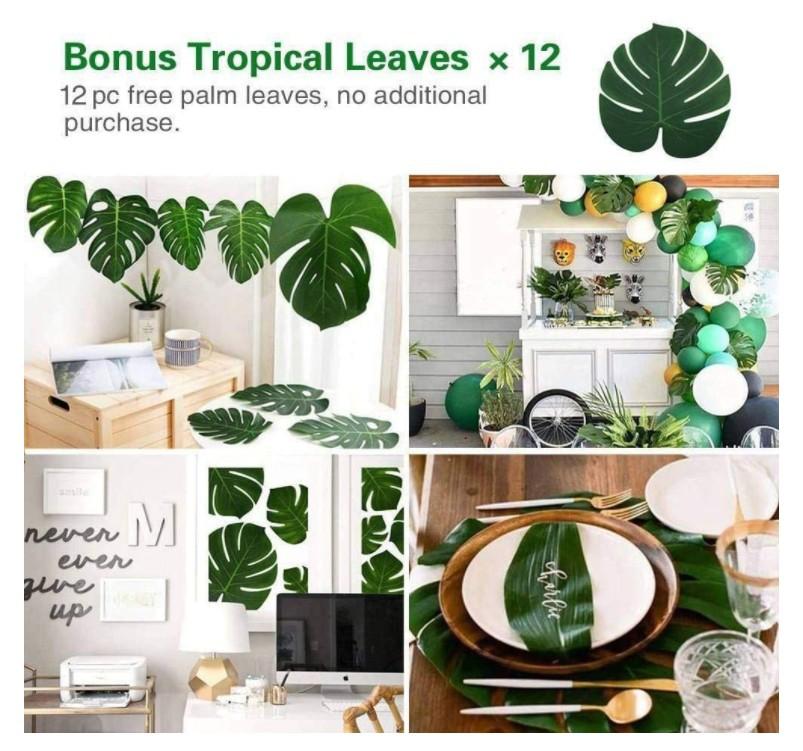 100 piezas - incluye 58 globos de 10 pulgadas - incluye 16 blancos, 16 verde claro, 16 verde oscuro, 10 dorados metálicos, 30 globos de 5 pulgadas - incluye 10 blancos, 10 verde claro, 10 verde oscuro, 10 hojas de palma artificiales de 8 pulgadas, 1 guirnalda de globos, 1 cinta, 1 rollo de pegamento para globos