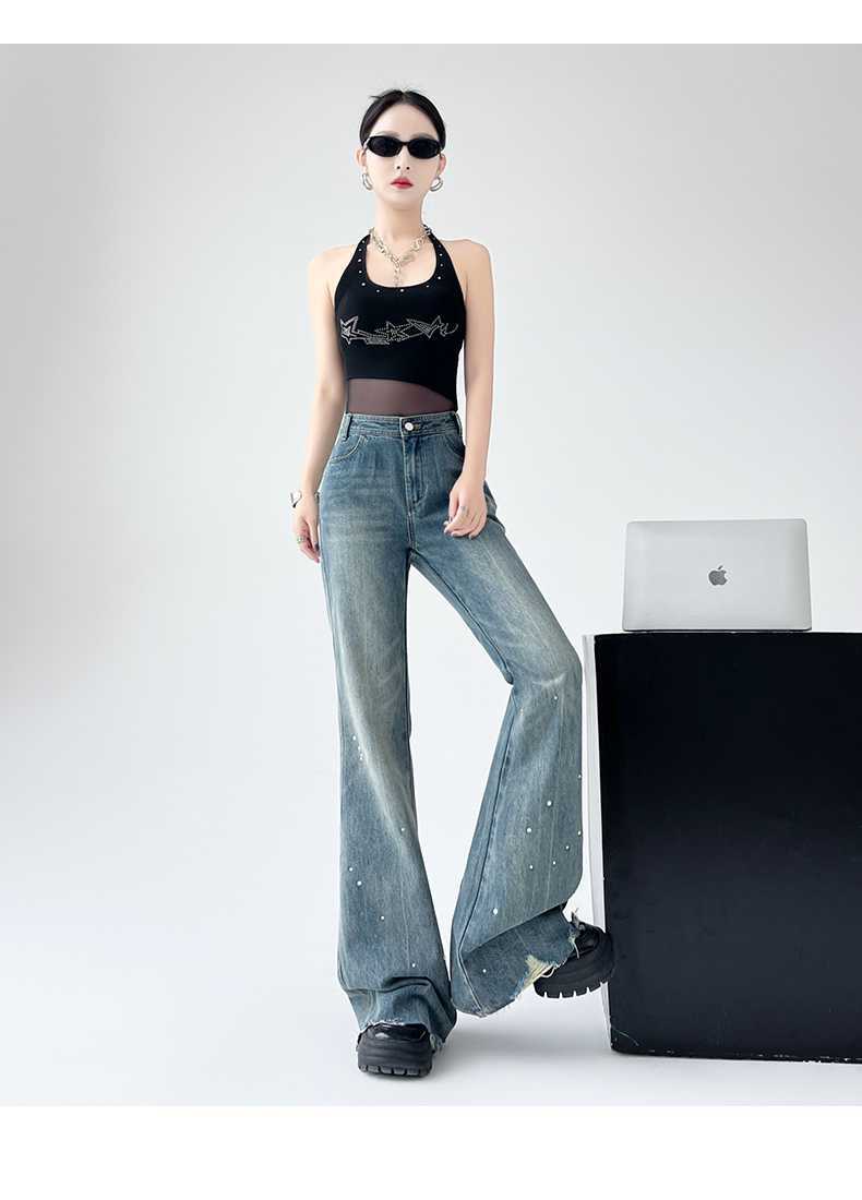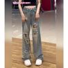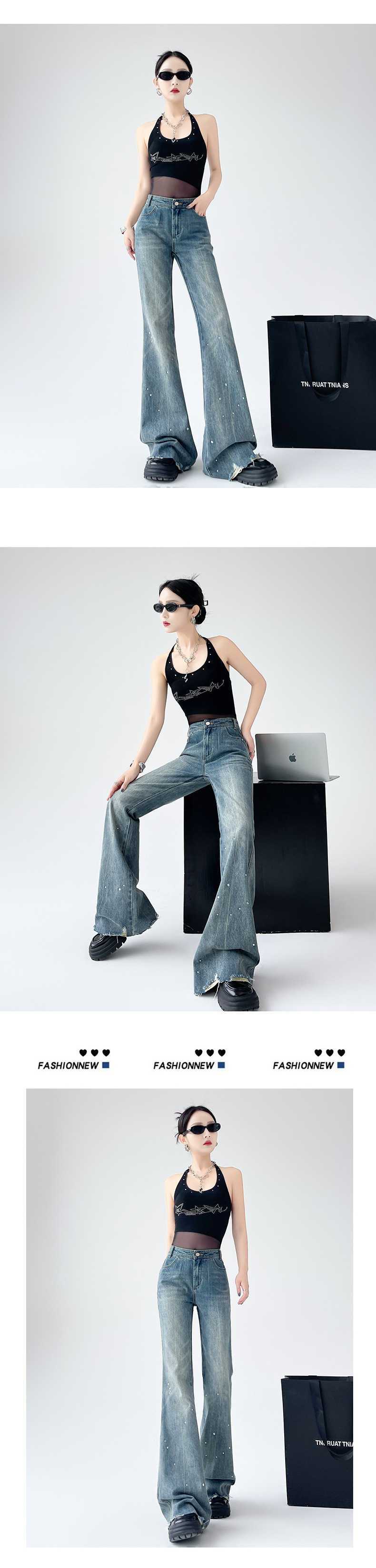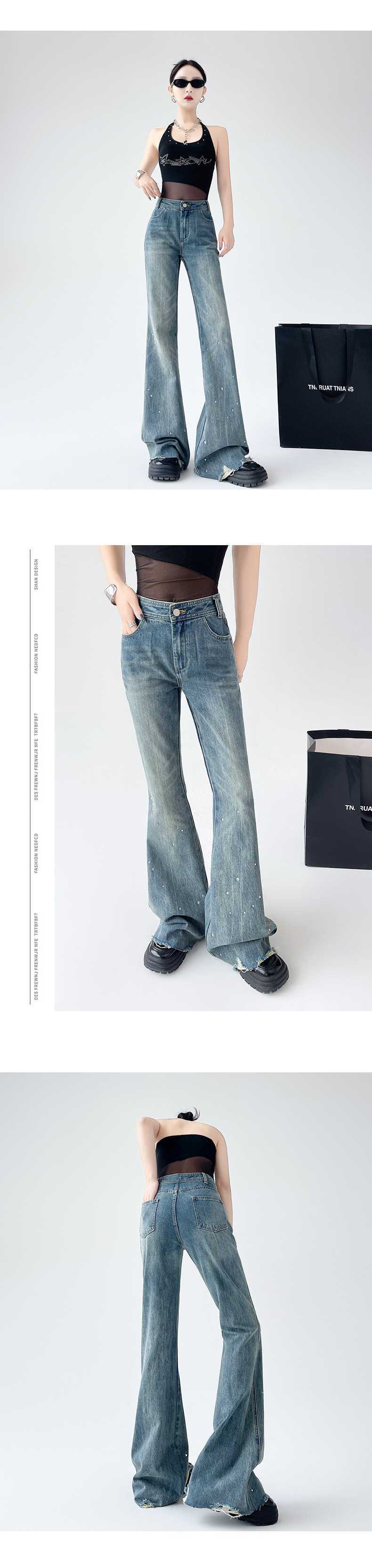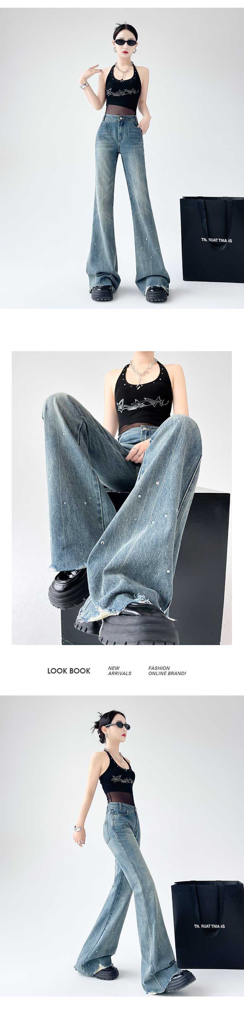 Jeans Slax Vintage de Pedrería para Mujer Pantalones Largos Holgados Adelgazantes de Pierna Ancha con Borde Deshilachado