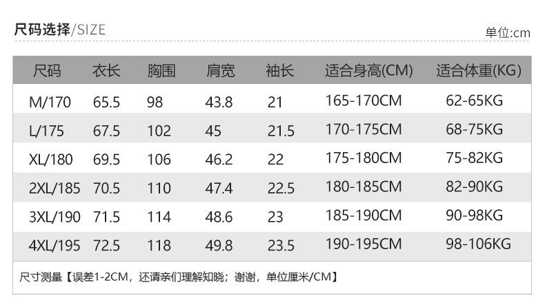 170/M, 175/L, 180/XL, 185/2XL, 190/3XL, 195/4XL